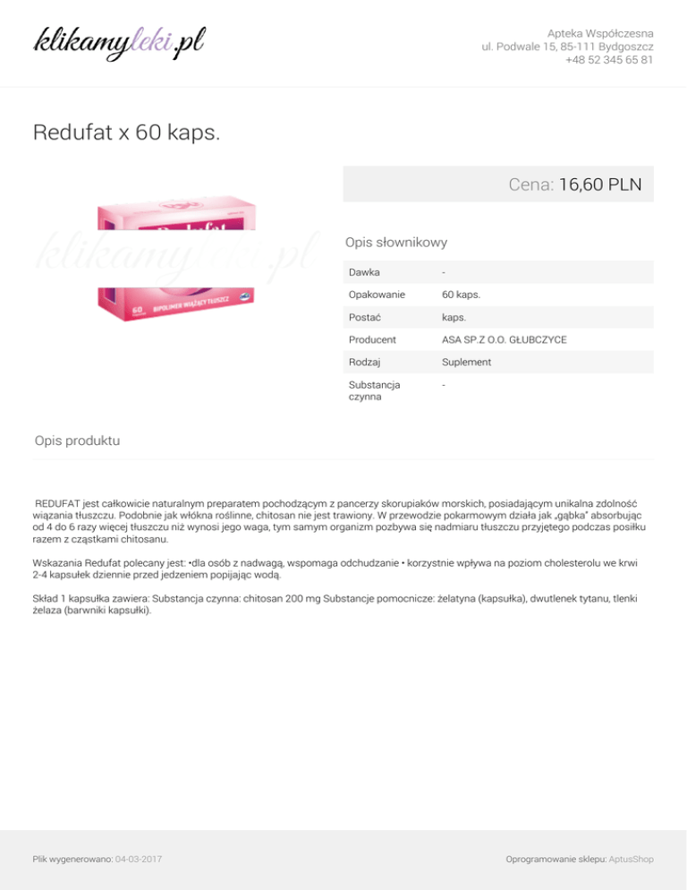 Apteka Współczesna ul. Podwale 15, 85-111 Bydgoszcz +48 52 345 65 81 Redufat x 60 kaps. Cena: 16,60 PLN Opis słownikowy Dawka - Opakowanie 60 kaps. Postać kaps. Producent ASA SP.Z O.O. GŁUBCZYCE Rodzaj Suplement Substancja czynna - Opis produktu REDUFAT jest całkowicie naturalnym preparatem pochodzącym z pancerzy skorupiaków morskich, posiadającym unikalna zdolność wiązania tłuszczu. Podobnie jak włókna roślinne, chitosan nie jest trawiony. W przewodzie pokarmowym działa jak „gąbka” absorbując od 4 do 6 razy więcej tłuszczu niż wynosi jego waga, tym samym organizm pozbywa się nadmiaru tłuszczu przyjętego podczas posiłku razem z cząstkami chitosanu. Wskazania Redufat polecany jest: •dla osób z nadwagą, wspomaga odchudzanie • korzystnie wpływa na poziom cholesterolu we krwi 2-4 kapsułek dziennie przed jedzeniem popijając wodą. Skład 1 kapsułka zawiera: Substancja czynna: chitosan 200 mg Substancje pomocnicze: żelatyna (kapsułka), dwutlenek tytanu, tlenki żelaza (barwniki kapsułki). Plik wygenerowano: 04-03-2017 Powered by TCPDF (www.tcpdf.org) Oprogramowanie sklepu: AptusShop