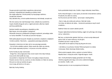 Poupee poczuła się jak balon wypełniony zdarzeniami. Ewolucja i indywidualność dopadły ją w jednej chwili. Nie mogła oddychać. Chciała pozbyć się męczącego nadmiaru. Zaczęła pluć słowami. Gdy zabrakło śliny, a krtań wydała złowieszczy niski dźwięk, zaczęła śnić. Kurka podziobała kiedyś raka. Zrobiła z niego nieboraka, kawał flaka… We śnie zawsze, bez najmniejszego trudu, wzbijała się w powietrze. Często chodziła drogą do samu z nagimi piersiami, albo bez majtek pod kusą spódniczką. - Dam ci radę, ale zrobisz jak zechcesz. Myśl jak trzeba. I nie lataj, nie dolecisz do nieba… i koniecznie pamiętaj w swych snach o bieliźnie… Rankiem budziła się podrapana, dopadało ją ciało. Było lżejsze, ale znowu głodne i spragnione. Wstawała zazwyczaj i poddawała się biegowi wydarzeń, pozwalając sobie na bunty niewielkie. To też było już przecież męczące… Nadmiar braku też czasem zaboleć potrafi. Kleiła jakieś głupie koszyczki. Owijała się sznurkami, wstążkami, nalepkami I stroiła w piórka. Taka kurka… z gospodarza pewnego podwórka. Gospodyni, ściemniara nie lada, tak to razu pewnego powiada: - Coś mi Kurko osłabłaś szalenie. Może nawet dla ciebie się zmienię. Bo ty chyba naprawdę się boisz. I mi jeszcze w kurniku nabroisz… Kurka troszkę się więc nastroszyła: - Droga Pani, choć pragnę być miła, to tym razem mnie chęci brakuje. Ja po prostu dość podle się czuję… Już puściłam w niepamięć Imć Pawia i nie wyjdę za księcia Żurawia. Powiem sercem, Pani ma, szczerze, że choć chciałam, to Tobie nie wierzę. Wrzucisz ty mnie już wkrótce do gara. Ja już czuję, jak bucha w nim para… Była lalą i kurką, kobietą. Kurka chwyciła koguta w swe szpony, bo był taki w bezradności szalony. Przydusiła, lecz dała mu szansę. Kurnik przecież jest dla rodziny. Są kurczęta i ciepłe godziny. Poupee najbardziej kochała być kobietą, ciągle nie tą dla tego, dla innego zaś tą. I odwrotnie… Byli tacy, co lalę kochali, głaskali. Byli tacy, co kurce wciąż obiecywali pycha rosół, że razem wskoczą z nią do gara. A kobieta się stara i czuje się stara… I słów pułki nie do wyplucia, kleją się jak guma do żucia. – Jak dobrze, że są drzewa i kwiaty! Wskoczę kuprem na rabaty i zniosę jajo. Może skosztuję młodą trawkę… Wiosna plecie pogody, kolory, apetyty na świeże folklory. Wpadły dzieci z wizytą do wioski. Pogoniły koguta i nioski. Lala z kurką dostojniej stąpają, gospodyni już nie ufają. I bieliznę wygodną tak mają, że do samu codziennie biegają po ziarenka i bułki, i soki. Poupee poczuła, że czas na przyjemny lot balonem.