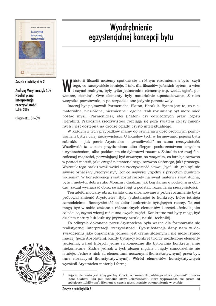 Wyodrêbnienie egzystencjalnej koncepcji bytu Zeszyty z metafizyki Nr 3 Andrzej Maryniarczyk SDB Realistyczna interpretacja rzeczywistoci Lublin 2005 (fragment: s. 3139) W historii filozofii mo¿emy spotkaæ siê z ró¿nym rozumieniem bytu, czyli tego, co rzeczywicie istnieje. I tak, dla filozofów joñskich bytem, a wiêc i czym realnym, by³y tylko jednorodne elementy (np. woda, ogieñ, powietrze, ziemia)1. Owe elementy by³y materialnie upostaciowane. Z nich wszystko powstawa³o, a po rozpadzie one jedynie pozostawa³y. Inaczej byt pojmowali Parmenides, Platon, Heraklit. Bytem jest to, co niematerialne, niez³o¿one, niezmienne i ogólne. Tak rozumiany byt mo¿e mieæ postaæ myli (Parmenides), idei (Platon) czy odwiecznych praw logosu (Heraklit). Prawdziwa rzeczywistoæ rozci¹ga siê poza wiatem rzeczy zmiennych i jest dostêpna na drodze ogl¹du czysto intelektualnego. W ka¿dym z tych przypadków mamy do czynienia z doæ osobliwym pojmowaniem bytu i ca³ej rzeczywistoci. U filozofów tych w formowaniu pojêcia bytu zabrak³o jak powie Arystoteles wra¿liwoci na sam¹ rzeczywistoæ. Wra¿liwoæ ta zosta³a przyt³umiona albo lepym pos³uszeñstwem zmys³om i wyobra¿eniom, albo poddaniem siê dyktatowi rozumu. Zabrak³o te¿ owej filozoficznej m¹droci, pozwalaj¹cej byæ otwartym na wszystko, co istnieje zarówno w postaci materii, jak i czego niematerialnego, zarówno z³o¿onego, jak i prostego. Wskutek tego braku wra¿liwoci na rzeczywistoæ s³owa: byt lub realny nie zawsze oznacza³y rzeczywisty, lecz co najwy¿ej zgodny z przyjêtym punktem widzenia. W konsekwencji wiat zosta³ rozbity na wiat materii i wiat ducha, bytu i niebytu, dobra i z³a. Monizm i dualizm, jak bóg Janus o podwójnym obliczu, zacz¹³ wyznaczaæ obraz wiata i leg³ u podstaw rozumienia rzeczywistoci. Ten zdeformowany obraz wiata oraz uformowane a priori rozumienie bytu próbowa³ zmieniæ Arystoteles. Byty (substancje) to konkrety, które istniej¹ samodzielnie. Rzeczywistoæ to zbiór konkretnie bytuj¹cych rzeczy. Te za mog¹ byæ w sobie z³o¿one z ró¿norodnych elementów i czêci. Jednak jako ca³oci s¹ czym wiêcej ni¿ sum¹ swych czêci. Konkretne za byty mog¹ byæ dzie³em natury lub kultury (wytwory sztuki, nauki, techniki). To odkrycie dokonane przez Arystotelesa by³o wa¿ne dla formowania siê realistycznej interpretacji rzeczywistoci. Byt-substancja dany nam w dowiadczeniu jako organiczna jednoæ jest czym z³o¿onym i nie mo¿e istnieæ inaczej (poza Absolutem). Ka¿dy bytuj¹cy konkret tworzy niezliczone elementy (z³o¿enia), wród których jedne s¹ konieczne dla bytowania konkretu, inne niekonieczne. ¯adne jednak z tych z³o¿eñ nigdzie i nigdy samodzielnie nie istnieje. Jedne z nich s¹ elementami noszonymi (konsekutywnymi) przez byt, inne nosz¹cymi (konstytutywnymi). Wród elementów konstytutywnych wyró¿ni³ Arystoteles materiê i formê. 1 Pojêcie elementu jest ide¹ greck¹. Grecki odpowiednik polskiego s³owa element oznacza literê alfabetu, tak jak ³aciñskie s³owo elementum, które wyprowadza siê czêsto od spó³g³osek LMN-tum. Element w sensie g³oski istnieje autonomicznie w sylabie. Zeszyty z metafizyki Nr 3 1 Zeszyty z metafizyki Nr 3 Andrzej Maryniarczyk SDB, Realistyczna interpretacja rzeczywistoci Forma jest zasad¹ organizowania materii do bycia okrelonym przedmiotem (domem, krzes³em, drzewem). W przypadku zarówno wytworów ludzkich (sto³y, ca³a technika, dzie³a sztuki), jak i bytów nieo¿ywionych, forma jest zewnêtrzn¹ zasad¹ organizowania sobie materii i zewnêtrzn¹ zasad¹ jednoci bytu. W przypadku za bytów ¿ywych (rolin, zwierz¹t i ludzi), forma okrelana jako dusza od wewn¹trz organizuje sobie materiê. W arystotelesowskim rozumieniu bytu wybija siê na pierwsze miejsce forma jako zasada organizowania materii oraz jako ród³o bytowania rzeczy. Formie bowiem przyporz¹dkowany jest ruch, który jest wyrazem istnienia wiata i poszczególnych bytów. Byty to uorganizowane przez formê wieczne elementy materii. Forma za otrzymuje moc organizacji dziêki uczestniczeniu w wiecznym ruchu, który przenika ca³y wiat, a swe ród³o ma w pierwszym Nieporuszonym Poruszycielu. Arystotelesowski obraz wiata jest g³êboko osadzony na obrazie wiata przedstawianym przez ówczesn¹ filozoficzn¹ kosmologiê. St¹d rozumienie bytu i wynikaj¹cy z tego rozumienia obraz wiata nie s¹ bezporednim odczytaniem prawdy o realnie istniej¹cej rzeczywistoci, lecz s¹ wypadkow¹ przyjêtej interpretacji rzeczywistoci. Odkrycie faktu istnienia (bytów) Tomasz z Akwinu w swej interpretacji rzeczywistoci (metafizyce) zerwa³ z tak uformowanym rozumieniem bytu, a tak¿e z obci¹¿onym staro¿ytn¹ kosmologi¹ obrazem wiata. W formowaniu rozumienia bytu i obrazu wiata wyszed³ od danych nam w codziennym dowiadczeniu jednostkowo istniej¹cych rzeczy, które stanowi¹ przedmiot badañ filozoficznych i pierwotne ród³o wiedzy o rzeczywistoci. Tomasz dostrzeg³, ¿e arystotelesowski hylemorfizm, upatruj¹cy w materii (u$lh [hyle]) i formie (morfh' [morphé]) wyjanienia tajemnicy bytowania konkretu, nie wyjania faktu jego realnego istnienia. Skoro bowiem istnienie nie jest konieczn¹ w³aciwoci¹ materii (jak utrzymywa³ Arystoteles) ani formy (jak twierdzi³ Platon), to powstaje pytanie, dziêki czemu byty z³o¿one z materii i formy istniej¹? Gdy odrzucimy wiecznoæ i koniecznoæ istnienia materii pierwszej jako prabudulca wiata i preegzystencji form (idei), to nie znajdziemy ani w wiecie, ani w poszczególnych rzeczach ostatecznej racji ich istnienia. Fakt bowiem istnienia Jana, jab³oni, czerwonej ró¿y i ca³ej rzeczywistoci nie jest wyjaniony do koñca przez odwo³anie siê do z³o¿enia bytu z materii i formy. Jest to, co najwy¿ej, wyjanienie faktu organizowania i uporz¹dkowania okrelonej materii do danej postaci bytu, ale materii, która ju¿ istnieje jako sta³y i wieczny element wszechwiata. W zwi¹zku z tym Tomasz zwróci³ uwagê, ¿e w ¿adnym konkretny
