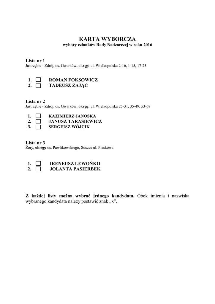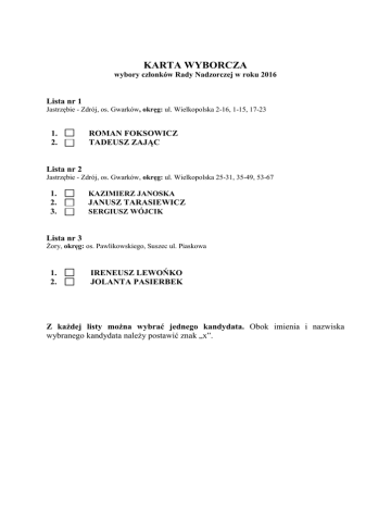 KARTA WYBORCZA wybory członków Rady Nadzorczej w roku 2016 Lista nr 1 Jastrzębie - Zdrój, os. Gwarków, okręg: ul. Wielkopolska 2-16, 1-15, 17-23 1. 2. ROMAN FOKSOWICZ TADEUSZ ZAJĄC Lista nr 2 Jastrzębie - Zdrój, os. Gwarków, okręg: ul. Wielkopolska 25-31, 35-49, 53-67 1. 2. 3. KAZIMIERZ JANOSKA JANUSZ TARASIEWICZ SERGIUSZ WÓJCIK Lista nr 3 Żory, okręg: os. Pawlikowskiego, Suszec ul. Piaskowa 1. 2. IRENEUSZ LEWOŃKO JOLANTA PASIERBEK Z każdej listy można wybrać jednego kandydata. Obok imienia i nazwiska wybranego kandydata należy postawić znak „x”.