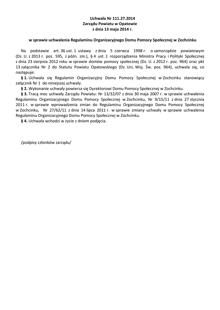 Uchwała Nr 111.27.2014 Zarządu Powiatu w Opatowie z dnia 13 maja 2014 r. w sprawie uchwalenia Regulaminu Organizacyjnego Domu Pomocy Społecznej w Zochcinku Na podstawie art. 36 ust. 1 ustawy z dnia 5 czerwca 1998 r. o samorządzie powiatowym (Dz. U. z 2013 r. poz. 595, z późn. zm.), § 4 ust. 1 rozporządzenia Ministra Pracy i Polityki Społecznej z dnia 23 sierpnia 2012 roku w sprawie domów pomocy społecznej (Dz. U. z 2012 r. poz. 964) oraz pkt 13 załącznika Nr 2 do Statutu Powiatu Opatowskiego (Dz. Urz. Woj. Św. poz. 964), uchwala się, co następuje: § 1. Uchwala się Regulamin Organizacyjny Domu Pomocy Społecznej w Zochcinku stanowiący załącznik Nr 1 do niniejszej uchwały. § 2. Wykonanie uchwały powierza się Dyrektorowi Domu Pomocy Społecznej w Zochcinku. § 3. Tracą moc uchwały Zarządu Powiatu: Nr 13/32/07 z dnia 30 maja 2007 r. w sprawie uchwalenia Regulaminu Organizacyjnego Domu Pomocy Społecznej w Zochcinku, Nr 9/15/11 z dnia 27 stycznia 2011 r. w sprawie wprowadzenia zmian do Regulaminu Organizacyjnego Domu Pomocy Społecznej w Zochcinku, Nr 27/62/11 z dnia 14 lipca 2011 r. w sprawie zmiany uchwały w sprawie uchwalenia Regulaminu Organizacyjnego Domu Pomocy Społecznej w Zochcinku. § 4. Uchwała wchodzi w życie z dniem podjęcia. /podpisy członków zarządu/ Załącznik do uchwały Nr 111.27.2014 Zarządu Powiatu w Opatowie z dnia 13 maja 2014 r. REGULAMIN ORGANIZACYJNY DOMU POMOCY SPOŁECZNEJ W ZOCHCINKU Rozdział 1. Postanowienia ogólne § 1. Regulamin organizacyjny Domu Pomocy Społecznej w Zochcinku zwanego dalej „Domem” określa organizację i zasady działania Domu. § 2. Dom jest jednostką organizacyjną powiatu działającą na podstawie: 1) ustawy z dnia 12 marca 2004 r. o pomocy społecznej ( Dz. U. z 2013 r. poz. 182, z późn. zm.); 2) ustawy z dnia 5 czerwca 1998 r. samorządzie powiatowym (Dz. U. z 2013 r. poz. 595, z późn. zm.); 3) ustawy z dnia 21 listopada 2008 r. pracownikach samorządowych (Dz. U. Nr 223, poz. 1458, z późn. zm.); 4) ustawy z dnia 19 sierpnia 1994 r. o ochronie zdrowia psychicznego (Dz. U. z 2011 r. Nr 231, poz. 1375, z późn. zm.); 5) ustawy z dnia 27 sierpnia 2009 r. o finansach publicznych (Dz. U. z 2013 r. poz. 885, z późn. zm.); 6) rozporządzenia Ministra Polityki Społecznej z dnia 23 sierpnia 2012 r. w sprawie domów pomocy społecznej (Dz. U. poz. 964); 7) zezwolenia na prowadzenie Domu Pomocy Społecznej w Zochcinku Wojewody Świętokrzyskiego Nr PS.II.9013/1-12/06; 8) Statutu Domu; 9) innych powszechnie obowiązujących przepisów prawa; 10) niniejszego regulaminu uchwalonego przez Zarząd Powiatu. § 3. 1. Dom jest jednostką organizacyjną Powiatu Opatowskiego o charakterze ponadgminnym. 2. Dom jest placówką stałego pobytu zapewniającą całodobową opiekę. 3. Siedzibą Domu jest miejscowość Zochcinek 42, gm. Opatów, pow. Opatowski, woj. świętokrzyskie. 4. Dom posługuje się numerami identyfikacyjnymi: REGON 000302528, NIP 863-10-20-140. § 4. 1. Dom dysponuje 155 miejscami i przeznaczony jest dla osób przewlekle psychicznie chorych. 2. Dom przyjmuje mieszkańców na pobyt stały na podstawie decyzji wydanej przez właściwy organ, zgodnie z obowiązującymi przepisami prawa. 3. Dom zapewnia mieszkańcom całodobową opiekę oraz zaspokaja niezbędne potrzeby bytowe, opiekuńcze, wspomagające, edukacyjne, społeczne i religijne na poziomie obowiązującego standardu, ze szczególnym uwzględnieniem wolności, intymności, godności i poczucia bezpieczeństwa mieszkańców z uwzględnieniem ich psychofizycznych możliwości. 4. Oszczędności mieszkańców gromadzone są na rachunku depozytowym. Po śmierci mieszkańca, wypłacane są one zgodnie z obowiązującymi przepisami w tym zakresie. § 5. 1. Działalność domu pokrywana jest: z dotacji celowych, odpłatności za pobyt mieszkańców, opłat wnoszonych przez gminę wydającą decyzję o skierowaniu, środków własnych powiatu. 2. Dom jest jednostką budżetową powiatu prowadzącą gospodarkę finansową według zasad określonych w ustawie z dnia 27 sierpnia 2009 r. o finansach publicznych. 3. Starosta Opatowski przy pomocy Powiatowego Centrum Pomocy Rodzinie w Opatowie sprawuje nadzór nad działalnością Domu. Rozdział 2. Zasady kierowania Domem § 6. 1. Domem kieruje Dyrektor poprzez wydawanie zarządzeń, regulaminów, poleceń służbowych oraz podejmowanie innych decyzji kierowniczych. 2. Dyrektora powołuje i odwołuje Zarząd Powiatu. 3. Dyrektor kieruje pracą Domu przy pomocy Zastępcy Dyrektora, Głównego Księgowego i Kierowników działów, sekcji oraz pracowników samodzielnie realizujących przydzielone zadania. 4. Dyrektora w przypadku nieobecności zastępuje Zastępca Dyrektora, a w razie wolnego wakatu na tym stanowisku Główny Księgowy lub osoba wyznaczona przez Dyrektora. 5. W sprawach skarg i wniosków Dyrektor przyjmuje w każdy wtorek w godzinach 1000 - 1300. Rozdział 3. Organizacja Domu § 7. 1. W skład Domu Pomocy Społecznej w Zochcinku wchodzą następujące komórki organizacyjne i stanowiska pracy: a) Dyrektor Domu, b) Zastępca Dyrektora, c) Dział Księgowości, d) Sekcja Administracyjno – Gospodarcza, e) Sekcja - Kuchnia, f) Dział Opiekuńczo – Terapeutyczny: Oddział A i B, g) Pracownik socjalny, h) Kapelan, i) Pracownik ds. inwestycji, j) Psycholog. 2. Ustala się następujące symbole poszczególnych komórek organizacyjnych i samodzielnych stanowisk pracy: a) Zastępca Dyrektora - Z, b) Dział Księgowości - KS, c) Sekcja Administracyjno – Gospodarcza - SAG, d) Sekcja - Kuchnia - SK, e) Dział Opiekuńczo – Terapeutyczny: Oddział A i B - OP, f) Pracownik socjalny - SOC, g) Kapelan - K, h) Pracownik ds. inwestycji - IN, i) Psycholog - P. 3. Na czele poszczególnych komórek organizacyjnych stoją Kierownicy. 4. Dyrektorowi Domu bezpośrednio podlegają: a) Zastępca Dyrektora, b) Główny Księgowy, c) Kierownik Działu Opiekuńczo - Terapeutycznego Oddział „A”,