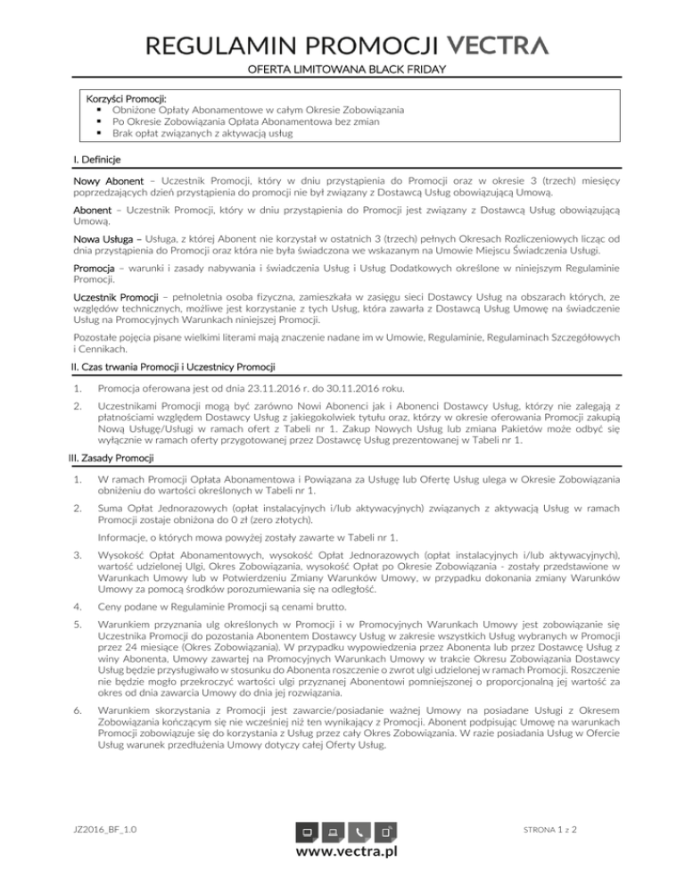 OFERTA LIMITOWANA BLACK FRIDAY Korzyści Promocji: Obniżone Opłaty Abonamentowe w całym Okresie Zobowiązania Po Okresie Zobowiązania Opłata Abonamentowa bez zmian Brak opłat związanych z aktywacją usług I. Definicje Nowy Abonent – Uczestnik Promocji, który w dniu przystąpienia do Promocji oraz w okresie 3 (trzech) miesięcy poprzedzających dzień przystąpienia do promocji nie był związany z Dostawcą Usług obowiązującą Umową. Abonent – Uczestnik Promocji, który w dniu przystąpienia do Promocji jest związany z Dostawcą Usług obowiązującą Umową. Nowa Usługa – Usługa, z której Abonent nie korzystał w ostatnich 3 (trzech) pełnych Okresach Rozliczeniowych licząc od dnia przystąpienia do Promocji oraz która nie była świadczona we wskazanym na Umowie Miejscu Świadczenia Usługi. Promocja – warunki i zasady nabywania i świadczenia Usług i Usług Dodatkowych określone w niniejszym Regulaminie Promocji. Uczestnik Promocji – pełnoletnia osoba fizyczna, zamieszkała w zasięgu sieci Dostawcy Usług na obszarach których, ze względów technicznych, możliwe jest korzystanie z tych Usług, która zawarła z Dostawcą Usług Umowę na świadczenie Usług na Promocyjnych Warunkach niniejszej Promocji. Pozostałe pojęcia pisane wielkimi literami mają znaczenie nadane im w Umowie, Regulaminie, Regulaminach Szczegółowych i Cennikach. II. Czas trwania Promocji i Uczestnicy Promocji 1. Promocja oferowana jest od dnia 23.11.2016 r. do 30.11.2016 roku. 2. Uczestnikami Promocji mogą być zarówno Nowi Abonenci jak i Abonenci Dostawcy Usług, którzy nie zalegają z płatnościami względem Dostawcy Usług z jakiegokolwiek tytułu oraz, którzy w okresie oferowania Promocji zakupią Nową Usługę/Usługi w ramach ofert z Tabeli nr 1. Zakup Nowych Usług lub zmiana Pakietów może odbyć się wyłącznie w ramach oferty przygotowanej przez Dostawcę Usług prezentowanej w Tabeli nr 1. III. Zasady Promocji 1. W ramach Promocji Opłata Abonamentowa i Powiązana za Usługę lub Ofertę Usług ulega w Okresie Zobowiązania obniżeniu do wartości określonych w Tabeli nr 1. 2. Suma Opłat Jednorazowych (opłat instalacyjnych i/lub aktywacyjnych) związanych z aktywacją Usług w ramach Promocji zostaje obniżona do 0 zł (zero złotych). Informacje, o których mowa powyżej zostały zawarte w Tabeli nr 1. 3. Wysokość Opłat Abonamentowych, wysokość Opłat Jednorazowych (opłat instalacyjnych i/lub aktywacyjnych), wartość udzielonej Ulgi, Okres Zobowiązania, wysokość Opłat po Okresie Zobowiązania - zostały przedstawione w Warunkach Umowy lub w Potwierdzeniu Zmiany Warunków Umowy, w przypadku dokonania zmiany Warunków Umowy za pomocą środków porozumiewania się na odległość. 4. Ceny podane w Regulaminie Promocji są cenami brutto. 5. Warunkiem przyznania ulg określonych w Promocji i w Promocyjnych Warunkach Umowy jest zobowiązanie się Uczestnika Promocji do pozostania Abonentem Dostawcy Usług w zakresie wszystkich Usług wybranych w Promocji przez 24 miesiące (Okres Zobowiązania). W przypadku wypowiedzenia przez Abonenta lub przez Dostawcę Usług z winy Abonenta, Umowy zawartej na Promocyjnych Warunkach Umowy w trakcie Okresu Zobowiązania Dostawcy Usług będzie przysługiwało w stosunku do Abonenta roszczenie o zwrot ulgi udzielonej w ramach Promocji. Roszczenie nie będzie mogło przekroczyć wartości ulgi przyznanej Abonentowi pomniejszonej o proporcjonalną jej wartość za okres od dnia zawarcia Umowy do dnia jej rozwiązania. 6. Warunkiem skorzystania z Promocji jest zawarcie/posiadanie ważnej Umowy na posiadane Usługi z Okresem Zobowiązania kończącym się nie wcześniej niż ten wynikający z Promocji. Abonent podpisując Umowę na warunkach Promocji zobowiązuje się do korzystania z Usług przez cały Okres Zobowiązania. W razie posiadania Usług w Ofercie Usług warunek przedłużenia Umowy dotyczy całej Oferty Usług. JZ2016_BF_1.0 STRONA 1 z 2 OFERTA LIMITOWANA BLACK FRIDAY 7. Wysokość roszczenia z tytułu jednostronnego rozwiązania umowy przez Abonenta lub przez Dostawcę Usług z winy Abonenta przed upływem terminu, na jaki Umowa została zawarta jest równa równowartości całej ulgi, pomnożonej przez liczbę pełnych miesięcy pozostałych do końca Okresu Zobowiązania, a następnie podzielonej przez liczbę miesięcy Okresu Zobowiązania Tabela nr 1: Oferta Usług Usługa Lub Oferta Usług Opłata Abonamentowa i Powiązana po obniżeniu, o którym mowa w pkt. 1 obowiązująca w całym Okresie Zobowiązania Opłata Abonamentowa i Powiązana po Okresie Zobowiązania Suma Opłat jednorazowych Okres Zobowiązania Pakiet Srebrny (HD) Telewizji cyfrowej 25,00 zł 25,00 zł 0 zł 24 m-ce Pakiet 100 Mb Internetu stacjonarnego 39,00 zł 39,00 zł 0 zł 24 m-ce IV. Postanowienia końcowe 1. Dostawca Usług zastrzega sobie, w trakcie obowiązywania Promocji, możliwość zmiany czasu jej trwania, określonego w pkt. II (wydłużenie lub skrócenie terminu zakończenia promocji, w związku z uwarunkowaniami organizacyjnymi, technicznymi). Szczegółowa informacja dostępna jest pod numerem Infolinii 601 601 601, w Salonach Firmowych i Biurach Obsługi Klienta Dostawcy Usług oraz na Stronie WWW Dostawcy Usług. Zmiana czasu obowiązywania Promocji nie ma jednak wpływu na treść i warunki Umów zawartych uprzednio z Abonentami na warunkach Promocji. 2. Regulamin Promocji nie wyłącza możliwości zawarcia Umowy z Dostawcą Usług na zasadach ogólnych (Standardowe Warunki Umowy). 3. Abonent oświadcza, że zapoznał się z treścią Regulaminu Promocji i go akceptuje. Odpowiednie zobowiązania, o których mowa w niniejszym dokumencie Abonent potwierdzi własnoręcznym podpisem. data i czytelny podpis Uczestnika Promocji JZ2016_BF_1.0 STRONA 2 z 2 JZ2016/OFERTA SPECJALNA CANAL+ ELASTYCZNY Korzyści Promocji: Pierwszy pełny Okres Rozliczeniowy za 0 zł Obniżone Opłaty Abonamentowe w całym Okresie Zobowiąz