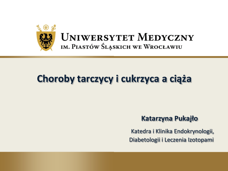 Choroby tarczycy i cukrzyca a ciąża Katarzyna Pukajło Katedra i Klinika Endokrynologii, Diabetologii i Leczenia Izotopami Choroby tarczycy w ciąży 1. Synteza i wydzielanie hormonów tarczycy 2. Metabolizm jodu 3. Reaktywność układu immunologicznego Fizjologiczne zmiany hormonalne w ciąży a zaburzenia funkcji tarczycy Hiperestrogenizm • stały wzrost stężenia estrogenów w ciąży • stymuluje wątrobową syntezę TBG (globuliny wiążącej tyroksynę) • podnosi pojemność białek wiążących hormony tarczycy - zwiększenie puli białek nośnikowych dla hormonów tarczycy • czynnik bezpośrednio stymulujący zwiększenie syntezy tyroksyny i trójjodotyroniny Fizjologiczne zmiany hormonalne w ciąży a zaburzenia funkcji tarczycy Gonadotropina kosmówkowa (hCG) • działanie tyreotropinopodobne Fizjologiczne zmiany hormonalne w ciąży a zaburzenia funkcji tarczycy • Metabolizm jodu Fizjologiczne zmiany hormonalne w ciąży a zaburzenia funkcji tarczycy • Ciąża - okres zwiększonego zapotrzebowania na jod • Od wczesnego okresu po zapłodnieniu wzrasta synteza hormonów tarczycy u matki • Tarczyca płodu podejmuje funkcję wydzielniczą w 10 hbd • Wzrost klirensu nerkowego - wzrost zapotrzebowania na jod • Łagodny niedobór jodu stymuluje gruczoł tarczycowy (wole) • Znaczny niedobór może prowadzić do niedoczynności tarczycy Fizjologiczne zmiany immunologiczne w ciąży a zaburzenia funkcji tarczycy • Spadek aktywności układu immunologicznego (od II trymestru) • Przechodzenie przez łożysko przeciwciał klasy IgG (np. przeciwciała przeciwko receptorowi TSH - TRAb, antyperoksydazowe anty-TPO, antytyreoglobulinowe anty-TG) Choroby tarczycy w ciąży • • • • • Nadczynność tarczycy Niedoczynność tarczycy Wole ciężarnych Nowotwory tarczycy Poporodowe zapalenie tarczycy Choroby tarczycy w ciąży U zdrowych ciężarnych kobiet występują objawy wzmożonego metabolizmu (objawy nadczynności tarczycy): • nietolerancja ciepła • nerwowość • przyspieszona akcja serca Charakterystyczne dla niedoczynności tarczycy • przyrost masy ciała, obrzęki Choroby tarczycy w ciąży Interpretacja badań laboratoryjnych: • obniżenie stężenia TSH w surowicy w I trymestrze ciąży (najniższa wartość występuje w 10 hbd) • stężenia całkowitej tyroksyny, trójjodotyroniny – wzrost w pierwszej połowie ciąży • stężenie fT4 po przejściowym wzroście stopniowo się obniża aż do rozwiązania Nadczynność tarczycy w ciąży • Choroba Gravesa–Basedowa (najczęściej) • Tyreotoksykoza ciężarnych • Wole wieloguzkowe toksyczne Choroba Gravesa-Basedowa • Objawy nadczynności tarczycy Tachykardia, nietolerancja ciepła, labilność emocjonalna, nadmierna potliwość, brak przyrostu masy ciała • Obraz w badaniu USG tarczycy Obniżona echogeniczność tarczycy, wzmożony przepływ naczyniowy • Objawy oczne Orbitopatia • Wyniki badań laboratoryjnych TSH fT4, fT3 Przeciwciała przeciwko rec. TSH (anty TSHR; TRAb), anty-TPO, anty-TG • I trymestr ciąży Tyreotoksykoza ciężarnych • Nadczynność tarczycy związana z ciążą • Nadmierne pobudzenie przez gonadotropinę kosmówkową • Niepowściągliwe wymioty ciężarnych • Ustępuje pod koniec I trymestru ciąży • Badania laboratoryjne TSH fT3, fT4, brak przeciwciał p. tarczycowych Leczenie • Objawowe - propranolol Wole wieloguzkowe toksyczne • Zmiany guzkowe w tarczycy • Pojedynczy guzek toksyczny • Objawy nadczynności tarczycy Tachykardia, nietolerancja ciepła, labilność emocjonalna, nadmierna potliwość, brak przyrostu masy ciała • Brak przeciwciał przeciwtarczycowych Nadczynność tarczycy w ciąży Powikłania • Przełom hipermetaboliczny • Niewydolność serca • Nadciśnienie tętnicze • Poronienie • Objawy hipotrofii wewnątrzmacicznej • Zwiększona śmiertelność okołoporodowa Nadczynność tarczycy w ciąży leczenie • Tyreostatyki – najmniejsza skuteczna dawka Propylotiouracyl 200 – 300 mg/dobę (I trymestr) Tiamazol 20 – 30 mg/dobę UWAGA – niedoczynność tarczycy u płodu ! • Częste monitorowanie funkcji tarczycy (co 4 tyg.) W chorobie Gravesa-Basedowa leczenie tyreostatyczne można zakończyć w czasie trwania ciąży W wolu wieloguzkowym należy leczyć przez cały okres ciąży • Leczenie operacyjne Zła tolerancja tyreostatyków, duże wole (II trymestr) Niedoczynność tarczycy w ciąży • Autoimmunologiczne zapalenie tarczycy (Hashimoto) • Niedoczynność tarczycy wywołana jatrogennie strumektomia, leczenie jodem radioaktywnym • Niedobór jodu • Badania laboratoryjne TSH fT4 N, fT3 ew. przeciwciała anty-TPO, anty-TG Niedoczynność tarczycy w ciąży Powikłania • Stan przedrzucawkowy, przedwczesne odklejenie łożyska • Zaburzenia rozwoju CUN płodu • Poronienia (autoimmunologiczne zapalenie tarczycy) Niedoczynność tarczycy w ciąży Leczenie: • L-tyroksyna (zwiększenie dawki nawet o 50%) pod kontrolą TSH, fT4 (co 4 – 6 tyg.) Wole obojętne Zwiększenie się objętości tarczycy występuje w związku z • Niedoborem jodu • Nadmierną produkcją hormonów tarczycy • Tyreotropowym działaniem hCG Kryteria rozpoznania • Powiększenie tarczycy w badaniu palpacyjnym i USG • Prawidłowe stężenia TSH, fT3, fT4 • Brak przeciwciał przeciwtarczycowych Wole obojętne - leczenie • Preparaty jodu 150 – 250 µg/dobę • L-tyroksyna 50 – 100 µg/dobę • W przypadku stwierdzenia dodatniego miana przeciwciał przeciwtarczycowych nie zaleca się stosowania preparatów jodu Nowotwory tarczycy w ciąży • Rak tarczycy zróżnicowany – leczenie operacyjne (totalna strumektomia) • Rak brodawkowaty w stadium pT1aN0M0 – strumektomia subtotalna • Uzupełniające terapia jodem radioaktywnym – po zakończeniu ciąży (karmienie piersią przeciwwskazane) Poporodowe zapalenie tarczycy • Podłoże autoimmunologiczne – powrót pełnej immunokompetenc