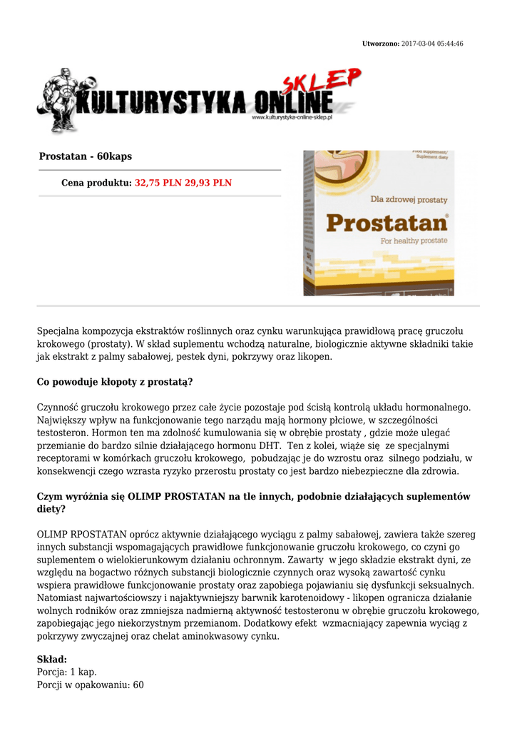 Utworzono: 2017-03-04 05:44:46 Prostatan - 60kaps Cena produktu: 32,75 PLN 29,93 PLN Specjalna kompozycja ekstraktów roślinnych oraz cynku warunkująca prawidłową pracę gruczołu krokowego (prostaty). W skład suplementu wchodzą naturalne, biologicznie aktywne składniki takie jak ekstrakt z palmy sabałowej, pestek dyni, pokrzywy oraz likopen. Co powoduje kłopoty z prostatą? Czynność gruczołu krokowego przez całe życie pozostaje pod ścisłą kontrolą układu hormonalnego. Największy wpływ na funkcjonowanie tego narządu mają hormony płciowe, w szczególności testosteron. Hormon ten ma zdolność kumulowania się w obrębie prostaty , gdzie może ulegać przemianie do bardzo silnie działającego hormonu DHT. Ten z kolei, wiąże się ze specjalnymi receptorami w komórkach gruczołu krokowego, pobudzając je do wzrostu oraz silnego podziału, w konsekwencji czego wzrasta ryzyko przerostu prostaty co jest bardzo niebezpieczne dla zdrowia. Czym wyróżnia się OLIMP PROSTATAN na tle innych, podobnie działających suplementów diety? OLIMP RPOSTATAN oprócz aktywnie działającego wyciągu z palmy sabałowej, zawiera także szereg innych substancji wspomagających prawidłowe funkcjonowanie gruczołu krokowego, co czyni go suplementem o wielokierunkowym działaniu ochronnym. Zawarty w jego składzie ekstrakt dyni, ze względu na bogactwo różnych substancji biologicznie czynnych oraz wysoką zawartość cynku wspiera prawidłowe funkcjonowanie prostaty oraz zapobiega pojawianiu się dysfunkcji seksualnych. Natomiast najwartościowszy i najaktywniejszy barwnik karotenoidowy - likopen ogranicza działanie wolnych rodników oraz zmniejsza nadmierną aktywność testosteronu w obrębie gruczołu krokowego, zapobiegając jego niekorzystnym przemianom. Dodatkowy efekt wzmacniający zapewnia wyciąg z pokrzywy zwyczajnej oraz chelat aminokwasowy cynku. Skład: Porcja: 1 kap. Porcji w opakowaniu: 60 Opakowanie: 60 kap. Wartość odżywcza w 1 kap. Ekstrakt z palmy sabałowej (Saw palmetto 45%) 160 mg Ekstrakt z pestek dyni (Pumpkin seed extrakt 5:1) 100 mg Ekstrakt z pokrzywy (Urtica doica L.) Likopen 100 mg 0,5 mg Chelaty aminokwasowy cynku ALBION® (Zinc Chelazome® Amino acid Chelate 20%) 25 mg Cynk 5 mg Dawkowanie: 1 kapsułka 2 razy dziennie. Ilość Adres: http://www.ko.sklep.pl/ - Telefon: kom. 782 010 880 Email: [email protected]