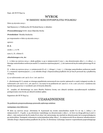 Sygn. akt III W 834/14 WYROK W IMIENIU RZECZYPOSPOLITEJ POLSKIEJ Dnia 23 stycznia 2015 r. Sąd Rejonowy w Wałbrzychu III Wydział Karny w składzie: Przewodniczący S.S.R. Anna Glijerska-Socha Protokolant Monika Suchecka po rozpoznaniu w dniu 23 stycznia 2015 r. sprawy: R. S. urodz. (...) w W. syna A., K. z domu G. obwinionego o to, że: I. w dniu 23 czerwca 2014 r. około godziny 11.35 w miejscowości C.woj. (...)na skrzyżowaniu ulicy (...) z ulicą (...), kierując samochodem osobowym marki T.o numerze rejestracyjnym (...), nie zastosował się do znaku pionowego B-20 stop, II. w dniu 23 czerwca 2014 r. w miejscowości B. ul. (...) droga (...) woj. (...), kierując samochodem osobowym marki T. o numerze rejestracyjnym (...), na odcinku drogi o dopuszczalnej prędkości do 50 km/h poruszał się z prędkością 76 km/h, tj. za wykroczenie z art. 92 § 1 k.w. i art. 92a k.w. I. obwinionego R. S. uznaje za winnego popełnienia zarzucanych mu czynów opisanych w części wstępnej wyroku, tj. wykroczeń z art. 92 § 1 k.w., art. 92a k.w. i za czyny te na podstawie art. 92a k.w. w zw. z art. 9 § 2 k.w. wymierza mu łącznie karę grzywny w wysokości 300 zł (trzysta złotych); II. zasądza od obwinionego na rzecz Skarbu Państwa kwotę 100 złotych tytułem zryczałtowanych wydatków postępowania oraz kwotę 30 złotych tytułem opłaty. Sygnatura akt III W 834/14 UZASADNIENIE Na podstawie przeprowadzonego przewodu sądowego ustalono następujący stan faktyczny: W dniu 23 czerwca 2014r. obwiniony R. S.poruszał się swoim samochodem marki T.o nr rej. (...)ulicą (...)w miejscowości C.. O godz. 11.35 obwiniony wyjeżdżając na skrzyżowanie z ulicy (...)w lewo na drogę główną to jest w ulicę (...)nie zastosował się do znaku B-20 stop i nie zatrzymując się wjechał na skrzyżowanie tuż za poprzedzającym go motocyklem. Następnie wskazanym wyżej pojazdem jadąc ulicą (...)w miejscowości B.na obszarze zabudowanym i odcinku drogi o dopuszczalnej prędkości do 50 km /h obwiniony wykonując manewr wyprzedzania poprzedzającego go pojazdu przekroczył dozwoloną prędkość poruszając się z prędkością 76 km/h . Oba wykroczenia zostały zarejestrowane przez urządzenie (...)umieszczone w nieoznakowanym radiowozie policyjnym O. (...)kierowanym przez funkcjonariusza Policji S. F.. Dowód: notatka urzędowa /k- 2/ częściowe wyjaśnienia obwinionego /k- 2, 15-16/ płyta CD z nagraniem /k- 6/ Obwiniony R. S. nie przyznał się do popełnienia zarzucanych mu czynów. Słuchany na Komisariacie Policji w W. z w dniu 26 czerwca 2014r. odmówił składania wyjaśnień , przed Sądem odnośnie pierwszego zarzutu wskazał, że przed jego pojazdem zatrzymał się motocyklista a obwiniony stanął za nim a następnie ruszył kiedy ten przekroczył oś jezdni, odnosząc się do drugiego zarzutu wskazał, że sytuacja jaka zaistniała na drodze zmusiła go do tego by przyspieszyć i wyprzedzić jadący przed nim pojazd spychacz albowiem jak podał „ z przodu przed jadącym spychaczem znajdowała się wysepka, która wymusiła na mnie przyspieszenie bo albo wjechałbym na ten spychacz albo w tą wysepkę”. Sąd Rejonowy w Wałbrzychu nadto zważył, co następuje: Sprawstwo i wina obwinionego R. S.co do popełnienia obu zarzucanych mu czynów nie budzi żadnych wątpliwości . Na powyższe wskazują częściowo wyjaśnienia samego obwinionego, który przyznał, że kierował pojazdem marki T.o nr rej. (...)w dniu 23 czerwca 2014r. w miejscowości C.i B.i nie kwestionował pomiaru prędkości wykonanego w momencie gdy wyprzedzał poprzedzający go pojazd oraz notatka urzędowa z dnia 23 czerwca 2014r., a przede wszystkim zapis zdarzenia zarejestrowany na płycie CD i odtworzony na rozprawie głównej . Zapis zarejestrowany przez urządzenie (...)umieszczone w nieoznakowanym radiowozie policyjnym wskazuje, iż o godz. 11.35 obwiniony jadąc swoim pojazdem T.o nr rej. (...)bez zatrzymania wjechał na skrzyżowanie bezpośrednio za motocyklem i tuż przed białym pojazdem dostawczym jadącym z przeciwka drogą główną skręcił w lewą stronę po czym mijając tablicę z nazwą miejscowości B.a następnie tablicę informującą o wjeździe na teren zabudowany obwiniony wykonał manewr wyprzedzania poprzedzającego go traktora poruszając się z prędkością 76 km/h . Wyjaśnienia obwinionego, który kwestionował swoje sprawstwo do pierwszego z czynów pozostają w oczywistej opozycji do odtworzonego nagrania ze zdarzenia natomiast ta część wyjaśnień obwinionego, która odnosi się do drugiego z zarzutów znajduje pełne potwierdzenie we wskazanym wyżej nagraniu . Wyjaśnienia obwinionego w tej części w sposób oczywisty wskazują na nieudolną próbę usprawiedliwienia swojego postępowania w nadziei na łagodne potraktowanie przez Sąd . Zgromadzone w sprawie dowody wskazują, iż obwiniony swoim zachowaniem wyczerpał ustawowe znamiona wykroczeń z art. 92§1 k.w. i art. 92a k.w. Przepis art. 92§1 k.w. stanowi, że karze grzywny lub nagany podlega ten, kto nie stosuje się do znaku lub sygnału drogowego albo sygnału lub polecenia osoby uprawnionej do kierowania ruchem lub kontroli ruchu drogowego natomiast przepis art. 92 a k.w. stanowi, że karze grzywny podlega ten, kto prowadząc pojazd, nie stosuje się do ograniczenia prędkości określonego ustawą lub znakiem drogowym. Art. 20 ust 1 ustawy z dnia 20 czerwca 1997r. prawo o ruchu drogowym stanowi, że p rędkość dopuszczalna pojazdu lub zespołu pojazdów na obszarze zabudowanym w godzinach 5 00 -23 00 wynosi 50 km/h, z zastrzeżeniem ust. 2. 3. Prędkość dopuszczalna poza obszarem zabudowanym, z zastrzeżeniem ust. 4 i 5, wynosi w przypadku: 1)samochodu osobowego, motocykla lub samochodu ciężarowego o dopuszczalnej masie całkowitej nieprzekraczającej 3,5 t: a)na autostradzie - 140 km/h, b)na drodze ekspresowej dwujezdniowej - 120 km/h, c)na drodze ekspresowej jednojezdniowej oraz na drodze dwujezdniowej 