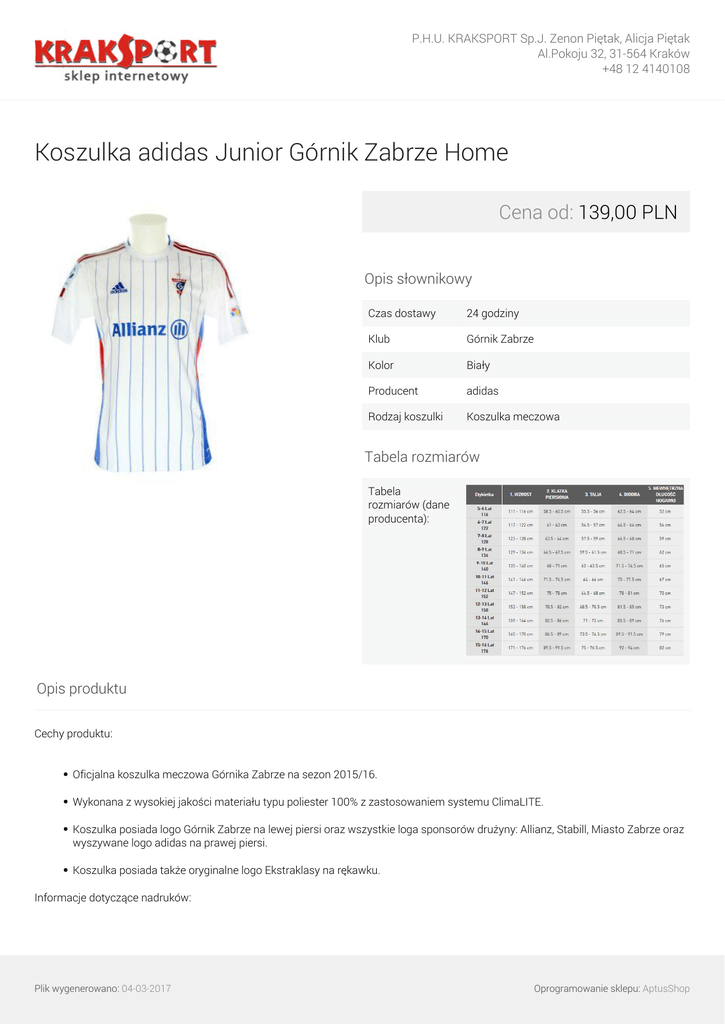 P.H.U. KRAKSPORT Sp.J. Zenon Piętak, Alicja Piętak Al.Pokoju 32, 31-564 Kraków +48 12 4140108 Koszulka adidas Junior Górnik Zabrze Home Cena od: 139,00 PLN Opis słownikowy Czas dostawy 24 godziny Klub Górnik Zabrze Kolor Biały Producent adidas Rodzaj koszulki Koszulka meczowa Tabela rozmiarów Tabela rozmiarów (dane producenta): Opis produktu Cechy produktu: Oficjalna koszulka meczowa Górnika Zabrze na sezon 2015/16. Wykonana z wysokiej jakości materiału typu poliester 100% z zastosowaniem systemu ClimaLITE. Koszulka posiada logo Górnik Zabrze na lewej piersi oraz wszystkie loga sponsorów drużyny: Allianz, Stabill, Miasto Zabrze oraz wyszywane logo adidas na prawej piersi. Koszulka posiada także oryginalne logo Ekstraklasy na rękawku. Informacje dotyczące nadruków: Plik wygenerowano: 04-03-2017 Oprogramowanie sklepu: AptusShop P.H.U. KRAKSPORT Sp.J. Zenon Piętak, Alicja Piętak Al.Pokoju 32, 31-564 Kraków +48 12 4140108 Dostępne są polskie znaki. Zamówienie nadruku możliwe jest tylko i wyłącznie z opcją płatności z góry (przelew lub karta kredytowa). Nie wysyłamy koszulek z nadrukiem za pobraniem (płatnością przy odbiorze). Wykonanie nadruku trwa od 1-5 dni roboczych, liczone od momentu otrzymania wpłaty. Z uwagi na indywidualny charakter zamówienia, koszulka z nadrukiem nie podlega zwrotowi ani wymianie. Warianty produktu Plik wygenerowano: 04-03-2017 116 139,00 PLN 128 139,00 PLN 140 139,00 PLN 164 139,00 PLN Oprogramowanie sklepu: AptusShop P.H.U. KRAKSPORT Sp.J. Zenon Piętak, Alicja Piętak Al.Pokoju 32, 31-564 Kraków +48 12 4140108 Galeria Plik wygenerowano: 04-03-2017 Powered by TCPDF (www.tcpdf.org) Oprogramowanie sklepu: AptusShop