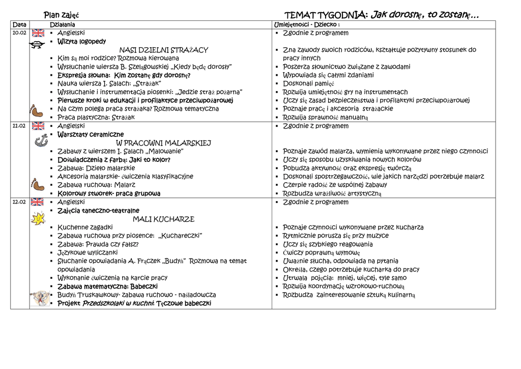 TEMAT TYGODNIA: Plan zajęć Data 10.02 11.02 12.02 Działania Umiejętności - Dziecko : Angielski Wizyta logopedy Zgodnie z programem NASI DZIELNI STRAŻACY Kim są moi rodzice? Rozmowa kierowana Wysłuchanie wiersza B. Szelągowskiej „Kiedy będę dorosły” Ekspresja słowna: Kim zostanę gdy dorosnę? Nauka wiersza I. Salach: „Strażak” Wysłuchanie i instrumentacja piosenki: „Jedzie straż pożarna” Pierwsze kroki w edukacji i profilaktyce przeciwpożarowej Na czym polega praca strażaka? Rozmowa tematyczna Praca plastyczna: Strażak Angielski Warsztaty ceramiczne W PRACOWNI MALARSKIEJ Zabawy z wierszem I. Salach „Malowanie” Doświadczenia z farbą: Jaki to kolor? Zabawa: Dzieło malarskie Akcesoria malarskie- ćwiczenia klasyfikacyjne Zabawa ruchowa: Malarz Kolorowy stworek- praca grupowa Angielski Zajęcia taneczno-teatralne MALI KUCHARZE Kuchenne zagadki Zabawa ruchowa przy piosence: „Kuchareczki” Zabawa: Prawda czy fałsz? Językowe wyliczanki Słuchanie opowiadania A. Frączek „Budyń” Rozmowa na temat opowiadania Wykonanie ćwiczenia na karcie pracy Zabawa matematyczna: Babeczki Budyń Truskawkowy- zabawa ruchowo - naśladowcza Projekt Przedszkolaki w kuchni: Tęczowe babeczki Jak dorosnę, to zostanę… Zna zawody swoich rodziców, kształtuje pozytywny stosunek do pracy innych Poszerza słownictwo związane z zawodami Wypowiada się całymi zdaniami Doskonali pamięć Rozwija umiejętność gry na instrumentach Uczy się zasad bezpieczeństwa i profilaktyki przeciwpożarowej Poznaje pracę i akcesoria strażackie Rozwija sprawność manualną Zgodnie z programem Poznaje zawód malarza, wymienia wykonywane przez niego czynności Uczy się sposobu uzyskiwania nowych kolorów Pobudza aktywność oraz ekspresję twórczą Doskonali spostrzegawczość, wie jakich narzędzi potrzebuje malarz Czerpie radość ze wspólnej zabawy Rozbudza wrażliwość artystyczną Zgodnie z programem Poznaje czynności wykonywane przez kucharza Rytmicznie porusza się przy muzyce Uczy się szybkiego reagowania Ćwiczy poprawną wymowę Uważnie słucha, odpowiada na pytania Określa, czego potrzebuje kucharka do pracy Utrwala pojęcia: mniej, więcej, tyle samo Rozwija koordynację wzrokowo-ruchową Rozbudza zainteresowanie sztuką kulinarną 13.02 14.02 Angielski Rytmika LEKARZ I PIELĘGNIARKA TO NASI PRZYJACIELE Słuchanie wiersza A. Jędrzejewskiej- Stachury „Rada pana doktora” Rozmowa na temat wiersza Wspólne rozwiązywanie krzyżówki Jak dbamy o zdrowie? Zabawa dydaktyczna Zabawa matematyczna: Dostawa leków Z wizytą u lekarza- zabawa tematyczna Ćwiczenia oddechowe: Chusteczki Pielęgniarka- praca techniczna Zgodnie z programem Angielski Basen- zajęcia fakultatywne Zgodnie z programem W ŚWIECIE MURARZA Oglądanie różnych obiektów architektonicznych Wysłuchanie fragmentu wiersza P. F. Nalepy: „Murarz” Tworzenie projektu: Dom Marzeń Zabawa ruchowa: Budujemy mosty dla pana starosty Murarze- zabawa ruchowa Praca techniczna: Domki Rozumie, na czy polega praca lekarza i pielęgniarki, wie co jest potrzebne lekarzowi do pracy Ćwiczy umysł, uczy się abstrakcyjnego myślenia Wie, jak dbać o swoje zdrowie Dodaje i odejmuje na konkretach Odgrywa role i prowadzi dialog Ćwiczy prawidłowy tor oddechowy Rozwija wyobraźnię oraz aktywność twórczą Rozpoznaje znane budowle Poznaje pracę murarza, architekta Rozwija kreatywność i wyobraźnię Czerpie radość ze wspólnej zabawy Kształtuje umiejętność współpracy Doskonali sprawność manualną