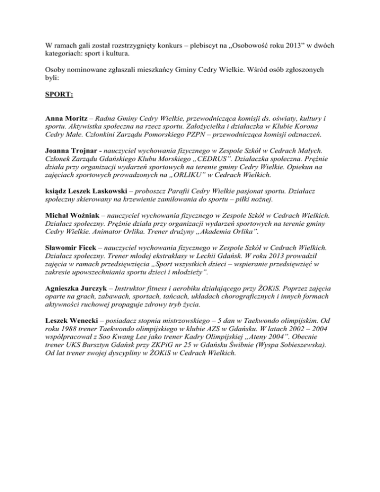W ramach gali został rozstrzygnięty konkurs – plebiscyt na „Osobowość roku 2013” w dwóch kategoriach: sport i kultura. Osoby nominowane zgłaszali mieszkańcy Gminy Cedry Wielkie. Wśród osób zgłoszonych byli: SPORT: Anna Moritz – Radna Gminy Cedry Wielkie, przewodnicząca komisji ds. oświaty, kultury i sportu. Aktywistka społeczna na rzecz sportu. Założycielka i działaczka w Klubie Korona Cedry Małe. Członkini Zarządu Pomorskiego PZPN – przewodnicząca komisji odznaczeń. Joanna Trojnar - nauczyciel wychowania fizycznego w Zespole Szkół w Cedrach Małych. Członek Zarządu Gdańskiego Klubu Morskiego „CEDRUS”. Działaczka społeczna. Prężnie działa przy organizacji wydarzeń sportowych na terenie gminy Cedry Wielkie. Opiekun na zajęciach sportowych prowadzonych na „ORLIKU” w Cedrach Wielkich. ksiądz Leszek Laskowski – proboszcz Parafii Cedry Wielkie pasjonat sportu. Działacz społeczny skierowany na krzewienie zamiłowania do sportu – piłki nożnej. Michał Woźniak – nauczyciel wychowania fizycznego w Zespole Szkół w Cedrach Wielkich. Działacz społeczny. Prężnie działa przy organizacji wydarzeń sportowych na terenie gminy Cedry Wielkie. Animator Orlika. Trener drużyny „Akademia Orlika”. Sławomir Ficek – nauczyciel wychowania fizycznego w Zespole Szkół w Cedrach Wielkich. Działacz społeczny. Trener młodej ekstraklasy w Lechii Gdańsk. W roku 2013 prowadził zajęcia w ramach przedsięwzięcia „Sport wszystkich dzieci – wspieranie przedsięwzięć w zakresie upowszechniania sportu dzieci i młodzieży”. Agnieszka Jurczyk – Instruktor fitness i aerobiku działającego przy ŻOKiS. Poprzez zajęcia oparte na grach, zabawach, sportach, tańcach, układach chorograficznych i innych formach aktywności ruchowej propaguje zdrowy tryb życia. Leszek Wenecki – posiadacz stopnia mistrzowskiego – 5 dan w Taekwondo olimpijskim. Od roku 1988 trener Taekwondo olimpijskiego w klubie AZS w Gdańsku. W latach 2002 – 2004 współpracował z Soo Kwang Lee jako trener Kadry Olimpijskiej „Ateny 2004”. Obecnie trener UKS Bursztyn Gdańsk przy ZKPiG nr 25 w Gdańsku Świbnie (Wyspa Sobieszewska). Od lat trener swojej dyscypliny w ŻOKiS w Cedrach Wielkich. KULTURA: Katarzyna Sikora - Radna Gminy Cedry Wielkie, członek Komicji Kultury, Oświaty i Sportu. Inicjatorka wielu przedsięwzięć kulturowych na trenie miejscowości Trutnowy i całej Gminy. Elżbieta Skirmuntt-Kufel prezes Stowarzyszenia Żuławy Gdańskie działającego w gminie Cedry Wielkich.Stowarzyszenie słynie z krzewienia historii i tradycji Żuław Gdańskich. Bożena Kozicka. Absolwentka Gdańskiej Akademii Muzycznej im. Stanisława Moniuszki wydziału Wychowania Muzycznego Dyrygentury Chóralnej i Rytmiki. Nauczyciel muzyki w szkołach m.in. w Cedrach Małych, Wocławach, w Zespole Szkół w Suchym Dębie, Krynicy Morskiej, Pruszczu Gdańskim. Posiada wieloletnią praktykę w prowadzeniu zespołów instrumentalnych, grup wokalnych zarówno dziecięcych, młodzieżowych jak i dorosłych w ŻOKiS. Danuta Zakrzewska działaczka społeczna. Radna Gminy Cedry Wielkie. Założycielka i prowadząca od 4 lat chór dziecięcy „ Żuławskie Słowiki”. Aktywnie uczestniczy w wydarzeniach kulturalnych na terenie gminy Cedry Wielkie. Spośród wielu zgłoszeń i wielkiej aktywności w głosowaniu mieszkańców wyłoniono dwoje zwycięzców .Pan Janusz Goliński i Pani Boża Daszewska ogłosili wyniki i wręczyli statuetki laureatom. Tytuł „Osobowość roku 2013”, w kategorii sport otrzymał ksiądz proboszcz Leszek Laskowski Tytuł „Osobowości roku 2013”, w kategorii kultura otrzymała Pani Bożena Kozicka.