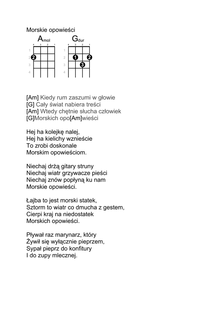 Morskie opowieści [Am] Kiedy rum zaszumi w głowie [G] Cały świat nabiera treści [Am] Wtedy chętnie słucha człowiek [G]Morskich opo[Am]wieści Hej ha kolejkę nalej, Hej ha kielichy wznieście To zrobi doskonale Morskim opowieściom. Niechaj drżą gitary struny Niechaj wiatr grzywacze pieści Niechaj znów popłyną ku nam Morskie opowieści. Łajba to jest morski statek, Sztorm to wiatr co dmucha z gestem, Cierpi kraj na niedostatek Morskich opowieści. Pływał raz marynarz, który Żywił się wyłącznie pieprzem, Sypał pieprz do konfitury I do zupy mlecznej.