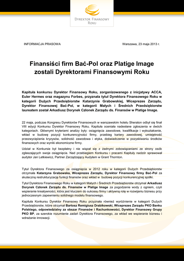 INFORMACJA PRASOWA Warszawa, 23 maja 2013 r. Finansiści firm Bać-Pol oraz Platige Image zostali Dyrektorami Finansowymi Roku Kapituła konkursu Dyrektor Finansowy Roku, zorganizowanego z inicjatywy ACCA, Euler Hermes oraz magazynu Forbes, przyznała tytuł Dyrektora Finansowego Roku w kategorii Dużych Przedsiębiorstw Katarzynie Grabowskiej, Wiceprezes Zarządu, Dyrektor Finansowej Bać-Pol, w kategorii Małych i Średnich Przedsiębiorstw laureatem został Arkadiusz Dorynek Członek Zarządu ds. Finansów w Platige Image. 22 maja, podczas Kongresu Dyrektorów Finansowych w warszawskim hotelu Sheraton odbył się finał VIII edycji Konkursu Dyrektor Finansowy Roku. Kapituła oceniała nadesłane zgłoszenia w dwóch kategoriach. Głównymi kryteriami analizy były: osiągnięcia zawodowe, kwalifikacje i wykształcenie, wkład w budowę pozycji konkurencyjności firmy, przebieg kariery zawodowej, umiejętność przezwyciężania kryzysów, solidność zawodowa i etyka, doświadczenie w pozyskiwaniu środków finansowych oraz wyniki ekonomiczne firmy. Udział w Konkursie był bezpłatny i nie wiązał się z żadnymi zobowiązaniami ze strony osób zgłaszających swoje osiągnięcia. Nad przebiegiem Konkursu i pracami Kapituły nadzór sprawował audytor Jan Letkiewicz, Partner Zarządzający Audytem w Grant Thornton. Tytuł Dyrektora Finansowego za osiągnięcia w 2012 roku w kategorii Dużych Przedsiębiorstw otrzymała Katarzyna Grabowska, Wiceprezes Zarządu, Dyrektor Finansowy firmy Bać-Pol za skuteczną restrukturyzację funkcji finansów oraz wkład w budowę pozycji konkurencyjnej spółki. Tytuł Dyrektora Finansowego Roku w kategorii Małych i Średnich Przedsiębiorstw otrzymał Arkadiusz Dorynek Członek Zarządu ds. Finansów w Platige Image za pogodzenie wody z ogniem, czyli wspieranie kreatywności, która jest kluczem do sukcesu firmy i aktywną rolę w rozwijaniu biznesu przy jednoczesnym zapewnieniu solidnego modelu finansowego. Kapituła Konkursu Dyrektor Finansowy Roku przyznała również wyróżnienie w kategorii Dużych Przedsiębiorstw, które otrzymał Bartosz Remigiusz Drabikowski, Wiceprezes Zarządu PKO Banku Polskiego, odpowiedzialny za obszar Finansów i Rachunkowości, Dyrektor Finansowy Grupy PKO BP, za szerokie rozumienie zadań Dyrektora Finansowego, za wkład we wspieranie biznesu i wdrażanie innowacji. Wyboru laureatów dokonała kapituła składająca się z niezależnych ekspertów - osób zaufania publicznego oraz aktywnych zawodowo finansistów: Magdalena Hernandez, Przewodnicząca Kapituły, Dyrektor Zarządzająca ACCA w Polsce, Jan Letkiewicz, Audytor Konkursu, Partner Zarządzający w Grant Thornton, Gustaw Duda, Prezydent ACCA Polska w latach 2006-2009, obecnie członek ACCA Global Council oraz CFO Huty Pokój, Waldemar Frąckowiak, Profesor Uniwersytetu Ekonomicznego w Poznaniu, Janusz Jankowiak, Główny Ekonomista Polskiej Rady Biznesu, Jacek Lisowski, Profesor Uniwersytetu Ekonomicznego w Poznaniu, Andrzej S. Nartowski, Prezes Fundacji Polski Instytut Dyrektorów, Robert T. Nowakowski, Partner w Spencer Stuart, Jacek Pochłopień, Zastępca Redaktora Naczelnego Forbes, Wiesław Rozłucki, Współzałożyciel i wieloletni Prezes Zarządu Giełdy Papierów Wartościowych w Warszawie, obecnie doradca banku inwestycyjnego Rothschild Polska, Andrzej Rzońca, Członek Rady Polityki Pieniężnej, Małgorzata Starczewska-Krzysztoszek, Główna Ekonomistka, Dyrektor Departamentu Badań i Analiz Polskiej Konfederacji Pracodawców Prywatnych Lewiatan, Tomasz Starus, Dyrektor Biura Oceny Ryzyka w Towarzystwie Ubezpieczeń Euler Hermes, Tomasz Szeląg, CFO Cyfrowego Polsatu, Laureat Konkursu Dyrektor Finansowy Roku w kategorii Duże Przedsiębiorstwa - edycja za rok 2011. W poprzednich edycjach Konkursu statuetka i tytuł Dyrektora Finansowego Roku trafiły do: Adama Pieniackiego, York International (2005), Karen Burgess, TVN (2006), Krzysztofa Zoły, Złomrex (2007), Tadeusza Piotra Kozaczyńskiego, Trakcja Polska (2008), Mariusza Machajewskiego, Grupa Lotos (2009), Sławomira Kubickiego, Grupa Allegro i Grzegorza Grabowicza, Magellan (2010) oraz Tomasza Szeląga, Cyfrowy Polsat i Damiana Bijowskiego, Górnośląskie Towarzystwo Lotnicze (edycja za rok 2011). Organizatorami Konkursu oraz Kongresów Dyrektorów Finansowych są: Association of Chartered Certified Accountants (ACCA), Euler Hermes oraz magazynu Forbes. Partnerem strategicznym tegorocznej edycji był HSBC Bank Polska. Partnerami wspierającymi zostali: Econocom, Grant Thornton, Itella Information, Krajowy Rejestr Długów, LeasePlan, PCTA, Randstad, RWE, Union Investments. Patronat medialny nad Kongresem i Konkursem objęli: UbezpieczeniaNaleznosci.pl, Gazeta Małych i Średnich Przedsiębiorstw, wnp.pl, biznes2biznes.com, onet, Obserwatorfinansowy.pl, Newsweek, Nowy Przemysł, Biznes.pl oraz KarierawFinansach.pl. Szczegółowe informacje o www.dyrektorfinansowyroku.pl. Dodatkowych informacji udziela: Artur Niewrzędowski Talking Heads tel. 509-433-874 e-mail: [email protected] Kongresie i Konkursie są dostępne na stronie: