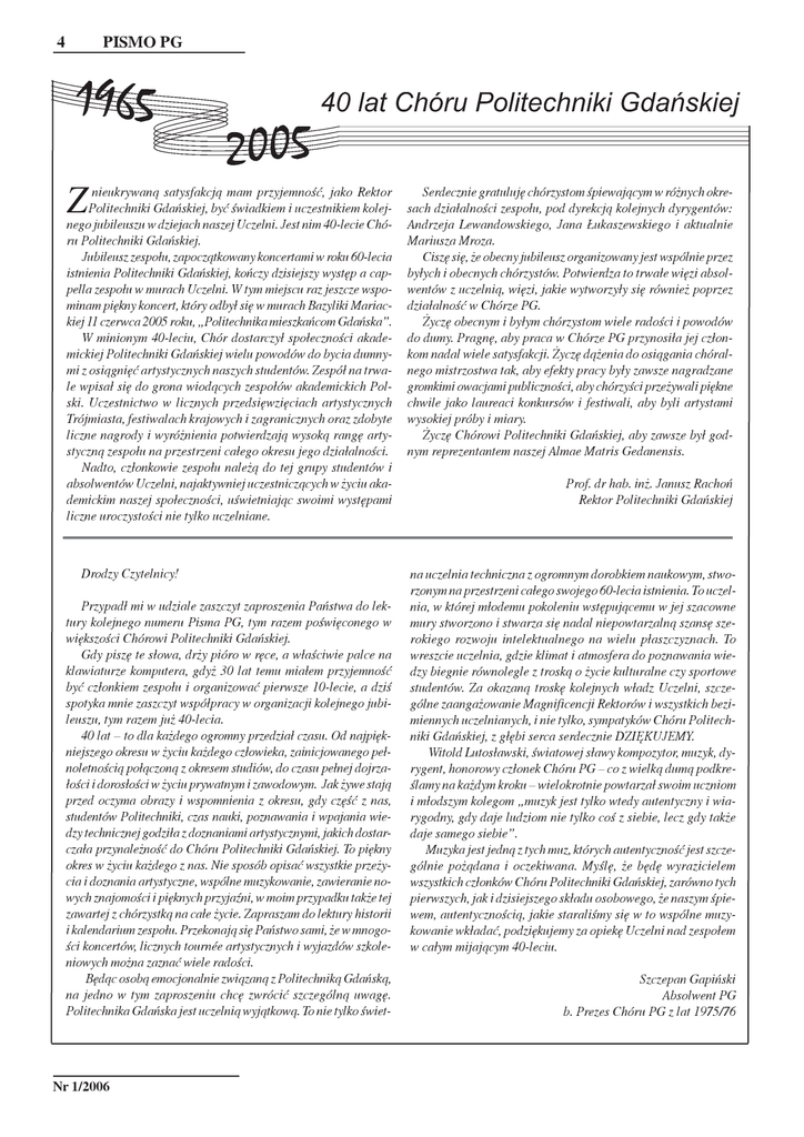 4 PISMO PG Z nieukrywan¹ satysfakcj¹ mam przyjemnoœæ, jako Rektor Politechniki Gdañskiej, byæ œwiadkiem i uczestnikiem kolejnego jubileuszu w dziejach naszej Uczelni. Jest nim 40-lecie Chóru Politechniki Gdañskiej. Jubileusz zespo³u, zapocz¹tkowany koncertami w roku 60-lecia istnienia Politechniki Gdañskiej, koñczy dzisiejszy wystêp a cappella zespo³u w murach Uczelni. W tym miejscu raz jeszcze wspominam piêkny koncert, który odby³ siê w murach Bazyliki Mariackiej 11 czerwca 2005 roku, „Politechnika mieszkañcom Gdañska”. W minionym 40-leciu, Chór dostarczy³ spo³ecznoœci akademickiej Politechniki Gdañskiej wielu powodów do bycia dumnymi z osi¹gniêæ artystycznych naszych studentów. Zespó³ na trwale wpisa³ siê do grona wiod¹cych zespo³ów akademickich Polski. Uczestnictwo w licznych przedsiêwziêciach artystycznych Trójmiasta, festiwalach krajowych i zagranicznych oraz zdobyte liczne nagrody i wyró¿nienia potwierdzaj¹ wysok¹ rangê artystyczn¹ zespo³u na przestrzeni ca³ego okresu jego dzia³alnoœci. Nadto, cz³onkowie zespo³u nale¿¹ do tej grupy studentów i absolwentów Uczelni, najaktywniej uczestnicz¹cych w ¿yciu akademickim naszej spo³ecznoœci, uœwietniaj¹c swoimi wystêpami liczne uroczystoœci nie tylko uczelniane. Drodzy Czytelnicy! Przypad³ mi w udziale zaszczyt zaproszenia Pañstwa do lektury kolejnego numeru Pisma PG, tym razem poœwiêconego w wiêkszoœci Chórowi Politechniki Gdañskiej. Gdy piszê te s³owa, dr¿y pióro w rêce, a w³aœciwie palce na klawiaturze komputera, gdy¿ 30 lat temu mia³em przyjemnoœæ byæ cz³onkiem zespo³u i organizowaæ pierwsze 10-lecie, a dziœ spotyka mnie zaszczyt wspó³pracy w organizacji kolejnego jubileuszu, tym razem ju¿ 40-lecia. 40 lat – to dla ka¿dego ogromny przedzia³ czasu. Od najpiêkniejszego okresu w ¿yciu ka¿dego cz³owieka, zainicjowanego pe³noletnoœci¹ po³¹czon¹ z okresem studiów, do czasu pe³nej dojrza³oœci i doros³oœci w ¿yciu prywatnym i zawodowym. Jak ¿ywe staj¹ przed oczyma obrazy i wspomnienia z okresu, gdy czêœæ z nas, studentów Politechniki, czas nauki, poznawania i wpajania wiedzy technicznej godzi³a z doznaniami artystycznymi, jakich dostarcza³a przynale¿noœæ do Chóru Politechniki Gdañskiej. To piêkny okres w ¿yciu ka¿dego z nas. Nie sposób opisaæ wszystkie prze¿ycia i doznania artystyczne, wspólne muzykowanie, zawieranie nowych znajomoœci i piêknych przyjaŸni, w moim przypadku tak¿e tej zawartej z chórzystk¹ na ca³e ¿ycie. Zapraszam do lektury historii i kalendarium zespo³u. Przekonaj¹ siê Pañstwo sami, ¿e w mnogoœci koncertów, licznych tournée artystycznych i wyjazdów szkoleniowych mo¿na zaznaæ wiele radoœci. Bêd¹c osob¹ emocjonalnie zwi¹zan¹ z Politechnik¹ Gdañsk¹, na jedno w tym zaproszeniu chcê zwróciæ szczególn¹ uwagê. Politechnika Gdañska jest uczelni¹ wyj¹tkow¹. To nie tylko œwiet- Nr 1/2006 Serdecznie gratulujê chórzystom œpiewaj¹cym w ró¿nych okresach dzia³alnoœci zespo³u, pod dyrekcj¹ kolejnych dyrygentów: Andrzeja Lewandowskiego, Jana £ukaszewskiego i aktualnie Mariusza Mroza. Ciszê siê, ¿e obecny jubileusz organizowany jest wspólnie przez by³ych i obecnych chórzystów. Potwierdza to trwa³e wiêzi absolwentów z uczelni¹, wiêzi, jakie wytworzy³y siê równie¿ poprzez dzia³alnoœæ w Chórze PG. ¯yczê obecnym i by³ym chórzystom wiele radoœci i powodów do dumy. Pragnê, aby praca w Chórze PG przynosi³a jej cz³onkom nadal wiele satysfakcji. ¯yczê d¹¿enia do osi¹gania chóralnego mistrzostwa tak, aby efekty pracy by³y zawsze nagradzane gromkimi owacjami publicznoœci, aby chórzyœci prze¿ywali piêkne chwile jako laureaci konkursów i festiwali, aby byli artystami wysokiej próby i miary. ¯yczê Chórowi Politechniki Gdañskiej, aby zawsze by³ godnym reprezentantem naszej Almae Matris Gedanensis. Prof. dr hab. in¿. Janusz Rachoñ Rektor Politechniki Gdañskiej na uczelnia techniczna z ogromnym dorobkiem naukowym, stworzonym na przestrzeni ca³ego swojego 60-lecia istnienia. To uczelnia, w której m³odemu pokoleniu wstêpuj¹cemu w jej szacowne mury stworzono i stwarza siê nadal niepowtarzaln¹ szansê szerokiego rozwoju intelektualnego na wielu p³aszczyznach. To wreszcie uczelnia, gdzie klimat i atmosfera do poznawania wiedzy biegnie równolegle z trosk¹ o ¿ycie kulturalne czy sportowe studentów. Za okazan¹ troskê kolejnych w³adz Uczelni, szczególne zaanga¿owanie Magnificencji Rektorów i wszystkich bezimiennych uczelnianych, i nie tylko, sympatyków Chóru Politechniki Gdañskiej, z g³êbi serca serdecznie DZIÊKUJEMY. Witold Lutos³awski, œwiatowej s³awy kompozytor, muzyk, dyrygent, honorowy cz³onek Chóru PG – co z wielk¹ dum¹ podkreœlamy na ka¿dym kroku – wielokrotnie powtarza³ swoim uczniom i m³odszym kolegom „muzyk jest tylko wtedy autentyczny i wiarygodny, gdy daje ludziom nie tylko coœ z siebie, lecz gdy tak¿e daje samego siebie”. Muzyka jest jedn¹ z tych muz, których autentycznoœæ jest szczególnie po¿¹dana i oczekiwana. Myœlê, ¿e bêdê wyrazicielem wszystkich cz³onków Chóru Politechniki Gdañskiej, zarówno tych pierwszych, jak i dzisiejszego sk³adu osobowego, ¿e naszym œpiewem, autentycznoœci¹, jakie staraliœmy siê w to wspólne muzykowanie wk³adaæ, podziêkujemy za opiekê Uczelni nad zespo³em w ca³ym mijaj¹cym 40-leciu. Szczepan Gapiñski Absolwent PG b. Prezes Chóru PG z lat 1975/76 PISMO PG Chór Politechniki Gdañskiej P ierwsze próby za³o¿enia zespo³u œpiewaczego na Politechnice Gdañskiej maj¹ swój pocz¹tek w latach 1948/49, z inicjatywy podjêtej przez Henryka Jab³oñskiego i Zbigniewa Chwedczuka – póŸniejszego kierownika artystycznego Opery Ba³tyckiej. Politechnicznym ¿yciem muzycznym zajmowali siê równie¿: Leon i Ireneusz £ukaszewscy, Longin Orski, Longin Partyka, Romuald Starski, Jacek Ujazdowski. Ostateczne narodziny nieprzerwan
