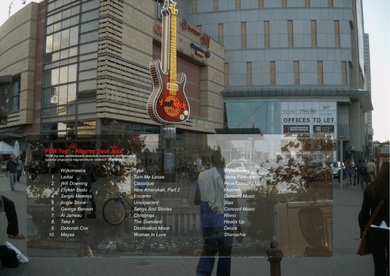 PLM Top* - Albumy Soul Jazz aktualizacja 15.04.2010 *PLM top jest zestawieniem dowolnie wybranych plyt i utworów sposród propozycji nagraniowych ostatnich 36 miesięcy. 1. 2. 3. 4. 5. 6. 7. 8. 9. 10. Wykonawca Ledisi Will Downing Erykah Badu Sergio Mendes Angie Stone George Benson Al Jarreau Take 6 Deborah Cox Maysa Tytuł Turn Me Loose Classique New Amerykah, Part 2 Encanto Unexpected Songs And Stories Christmas The Standard Destination Moon Woman In Love Wytwórnia Verve Forecast Peak/Concord Music Motown Concord Music Stax Concord Music Rhino Heads Up Decca Shanachie