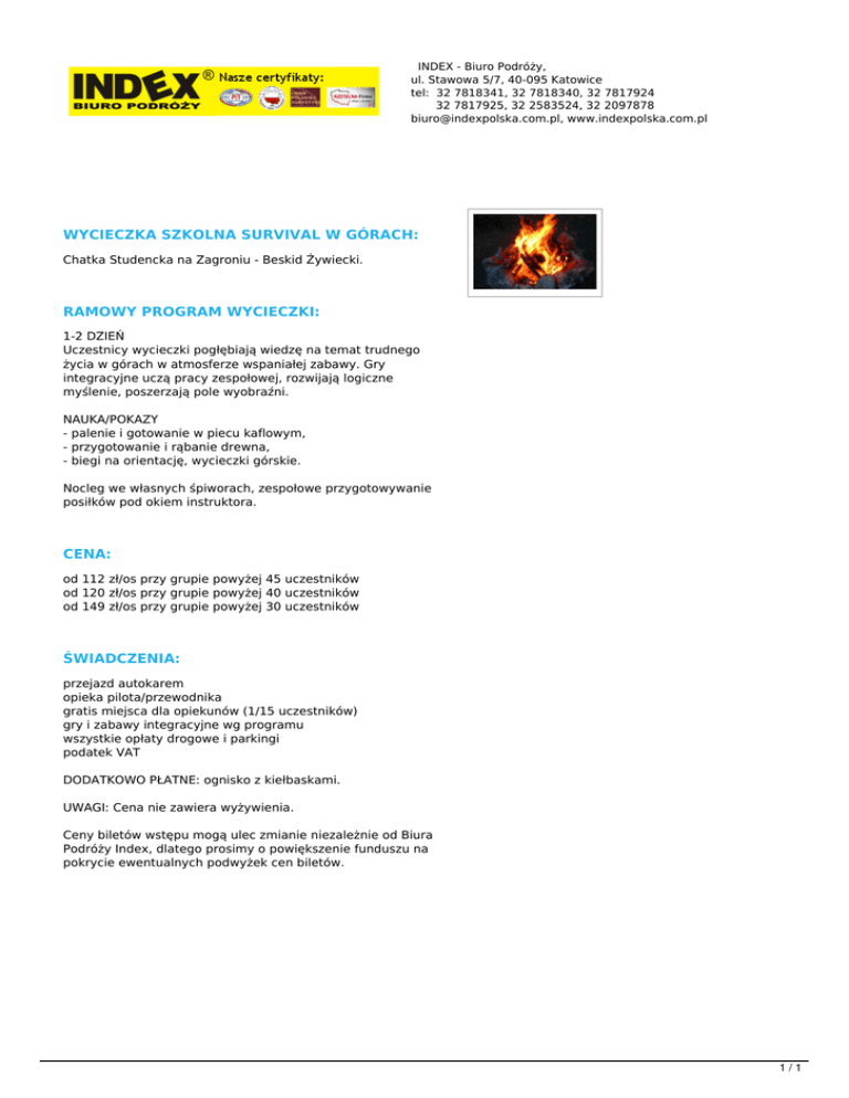 INDEX - Biuro Podróży, ul. Stawowa 5/7, 40-095 Katowice tel: 32 7818341, 32 7818340, 32 7817924 32 7817925, 32 2583524, 32 2097878 [email protected], www.indexpolska.com.pl WYCIECZKA SZKOLNA SURVIVAL W GÓRACH: Chatka Studencka na Zagroniu - Beskid Żywiecki. RAMOWY PROGRAM WYCIECZKI: 1-2 DZIEŃ Uczestnicy wycieczki pogłębiają wiedzę na temat trudnego życia w górach w atmosferze wspaniałej zabawy. Gry integracyjne uczą pracy zespołowej, rozwijają logiczne myślenie, poszerzają pole wyobraźni. NAUKA/POKAZY - palenie i gotowanie w piecu kaflowym, - przygotowanie i rąbanie drewna, - biegi na orientację, wycieczki górskie. Nocleg we własnych śpiworach, zespołowe przygotowywanie posiłków pod okiem instruktora. CENA: od 112 zł/os przy grupie powyżej 45 uczestników od 120 zł/os przy grupie powyżej 40 uczestników od 149 zł/os przy grupie powyżej 30 uczestników ŚWIADCZENIA: przejazd autokarem opieka pilota/przewodnika gratis miejsca dla opiekunów (1/15 uczestników) gry i zabawy integracyjne wg programu wszystkie opłaty drogowe i parkingi podatek VAT DODATKOWO PŁATNE: ognisko z kiełbaskami. UWAGI: Cena nie zawiera wyżywienia. Ceny biletów wstępu mogą ulec zmianie niezależnie od Biura Podróży Index, dlatego prosimy o powiększenie funduszu na pokrycie ewentualnych podwyżek cen biletów. 1/1 Powered by TCPDF (www.tcpdf.org)