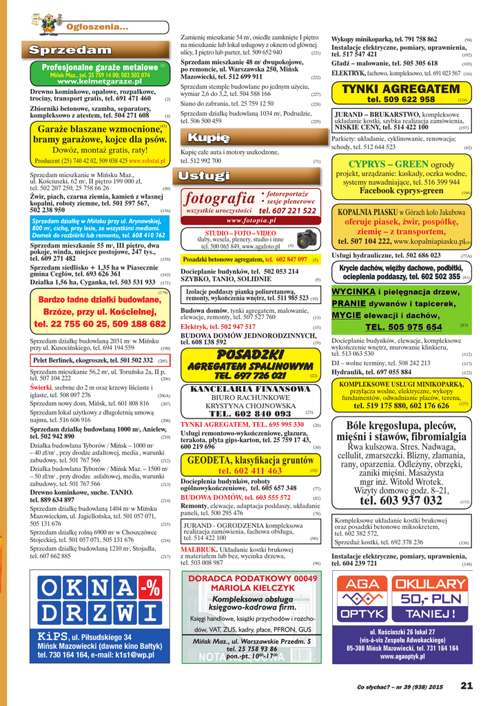 Ogłoszenia... Zamienię mieszkanie 54 m2, osiedle zamknięte I piętro na mieszkanie lub lokal usługowy z oknem od głównej ulicy, I piętro lub parter, tel. 509 652 940 (221) Sprzedam Profesjonalne garaże metalowe (1) Mińsk Maz., tel. 25 759 14 00; 502 502 074 www.kelmetgaraze.pl Drewno kominkowe, opałowe, rozpałkowe, trociny, transport gratis, tel. 691 471 460 (2) Zbiorniki betonowe, szamba, separatory, kompleksowo z atestem, tel. 504 271 608 (4) Garaże blaszane wzmocnione, bramy garażowe, kojce dla psów. (43) Dowóz, montaż gratis, raty! Producent (25) 740 42 02, 509 038 425 www.robstal.pl Sprzedam mieszkanie w Mińsku Maz., ul. Kościuszki, 62 m2, II piętro 199 000 zł, (90) tel. 502 207 250, 25 758 66 26 Żwir, piach, czarna ziemia, kamień z własnej kopalni, roboty ziemne, tel. 501 597 567, (136) 502 238 950 Sprzedam działkę w Mińsku przy ul. Arynowskiej, 800 m2, cichą, przy lesie, ze wszystkimi mediami. Domek do rozbiórki lub remontu, tel. 608 410 762 Sprzedam mieszkanie 55 m , III piętro, dwa pokoje, winda, miejsce postojowe, 247 tys., (158) tel. 609 271 482 Sprzedam siedlisko + 1,35 ha w Piasecznie (163) gmina Cegłów, tel. 693 626 361 Działka 1,56 ha, Cyganka, tel. 503 531 933 (171) 2 (174) (174) Bardzo ładne działki budowlane, Brzóze, przy ul. Kościelnej, tel. 22 755 60 25, 509 188 682 Sprzedam działkę budowlaną 2031 m2 w Mińsku przy ul. Kusocińskiego, tel. 694 194 559 Pelet Berlinek, ekogroszek, tel. 501 502 332 (190) (205) Sprzedam mieszkanie 56,2 m2, ul. Toruńska 2a, II p, (206) tel. 507 104 222 Świerki, srebrne do 2 m oraz krzewy liściaste i iglaste, tel. 508 097 276 Sprzedam nowy dom, Mińsk, tel. 601 808 816 Sprzedam lokal użytkowy z długoletnią umową najmu, tel. 516 606 916 (206A) (207) (208) Sprzedam działkę budowlaną 1000 m2, Anielew, tel. 502 942 890 (210) Działka budowlana Tyborów / Mińsk – 1000 m2 – 40 zł/m2 , przy drodze asfaltowej, media , warunki zabudowy, tel. 501 767 566 (212) Działka budowlana Tyborów / Mińsk Maz. – 1500 m2 – 50 zł/m2 , przy drodze asfaltowej, media, warunki zabudowy, tel. 501 767 566 (213) Drewno kominkowe, suche. TANIO. tel. 889 634 897 (214) Sprzedam działkę budowlaną 1404 m2 w Mińsku Mazowieckim, ul. Jagiellońska, tel. 501 057 071, 505 131 676 (215) Sprzedam działkę rolną 6900 m2 w Choszczówce Stojeckiej, tel. 501 057 071, 505 131 676 (216) Sprzedam działkę budowlaną 1210 m2, Stojadła, tel. 607 662 885 (217) Sprzedam mieszkanie 48 m2 dwupokojowe, po remoncie, ul. Warszawska 250, Mińsk Mazowiecki, tel. 512 699 911 (222) Sprzedam stemple budowlane po jednym użyciu, wymiar 2,6 do 3,2, tel. 504 588 166 (227) Siano do zabrania, tel. 25 759 12 50 (228) Sprzedam działkę budowlaną 1034 m2, Podrudzie, tel. 506 500 459 (229) Kupię (71) TYNKI AGREGATEM tel. 509 622 958 (124) JURAND – BRUKARSTWO, kompleksowe układanie kostki, szybka realizacja zamówienia, NISKIE CENY, tel. 514 422 100 (197) (62) CYPRYS – GREEN ogrody Krycie dachów, więźby dachowe, podbitki, (81) projekt, urządzanie: kaskady, oczka wodne, ocieplenia poddaszy, tel. 602 502 355 systemy nawadniające, tel. 516 399 944 Usługi wszystkie uroczystości ELEKTRYK, fachowo, kompleksowo, tel. 691 023 567 (116) Parkiety: układanie, cyklinowanie, renowacja; schody, tel. 512 644 523 Kupię całe auta i motory uszkodzone, tel. 512 992 700 fotografia Wykopy minikoparką, tel. 791 758 862 (94) Instalacje elektryczne, pomiary, uprawnienia, (102) tel. 517 547 421 Gładź – malowanie, tel. 505 305 618 (103) Facebook cyprys-green • fotoreportaże • sesje plenerowe tel. 607 221 522 www.fotopia.pl STUDIO – FOTO – VIDEO śluby, wesela, plenery, studio i inne tel. 500 065 849, www.agafoto.pl (166) KOPALNIA PIASKU w Górach koło Jakubowa oferuje piasek, żwir, pospółkę, ziemię – z transportem, tel. 507 104 222, www.kopalniapiasku.pl(69) (4) Posadzki betonowe agregatem, tel. 602 847 097 (5) Docieplanie budynków, tel. 502 053 214 SZYBKO, TANIO, SOLIDNIE (9) Usługi hydrauliczne, tel. 502 686 023 (77A) Krycie dachów, więźby dachowe, podbitki, ocieplenia poddaszy, tel. 602 502 355 (81) Izolacje poddaszy pianką poliuretanową, remonty, wykończenia wnętrz, tel. 511 985 523 (10) Budowa domów, tynki agregatem, malowanie, elewacje, remonty, tel. 507 527 760 (13) Elektryk, tel. 502 947 517 (15) BUDOWA DOMÓW JEDNORODZINNYCH, (19) tel. 608 138 592 Posadzki agregatem spalinowym tel. 697 726 021 (22) TEL. 602 840 093 (23) TYNKI AGREGATEM, TEL. 695 995 330 Usługi remontowo-wykończeniowe, glazura, terakota, płyta gips-karton, tel. 25 759 17 43, 600 219 696 (26) (30) GEODETA, klasyfikacja gruntów tel. 602 411 463 (32) Docieplenia budynków, roboty ogólnowykończeniowe, tel. 605 657 348 (77) BUDOWA DOMÓW, tel. 603 555 572 (82) Remonty, elewacje, adaptacja poddaszy, układanie paneli, tel. 500 295 476 (78) JURAND - OGRODZENIA kompleksowa realizacja zamówienia, fachowa obsługa, tel. 514 422 100 Docieplanie budynków, elewacje, kompleksowe wykończenie wnętrz, murowanie klinkieru, (112) tel. 513 063 530 DJ – wolne terminy, tel. 508 242 213 (117) Hydraulik, tel. 697 055 884 (122) KOMPLEKSOWE USŁUGI MINIKOPARKĄ, przyłącza wodne, elektryczne, wykopy fundamentów, odwadnianie placów, terenu, KANCELARIA FINANSOWA BIURO RACHUNKOWE KRYSTYNA CHOJNOWSKA (83) (90) MALBRUK. Układanie kostki brukowej z materiałem lub bez, wycinka drzewa, tel. 503 008 987 (96) tel. 519 175 880, 602 176 626 (125) Bóle kręgosłupa, pleców, mięśni i stawów, fibromialgia Rwa kulszowa. Stres. Nadwaga, cellulit, zmarszczki. Blizny, złamania, rany, oparzenia. Odleżyny, obrzęki, zaniki mięśni. Masażysta mgr inż. Witold Wrotek. Wizyty domowe godz. 8–21, tel. 603 937 032 Kompleksowe układanie kostki brukowej oraz posadzki betonowe miksokretem, tel. 602 382 572, Sprzedaż kostki, tel. 692 378 236 (132) (136) Instalacje elektryczne, pomiary, uprawnienia, tel. 604 239 721 (148) DORADCA PODATKOWY 00049 MARIOLA KIELCZYK Kompleksow