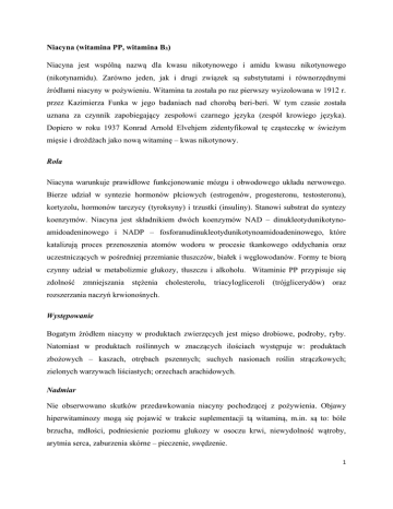 Niacyna (witamina PP, witamina B3) Niacyna jest wspólną nazwą dla kwasu nikotynowego i amidu kwasu nikotynowego (nikotynamidu). Zarówno jeden, jak i drugi związek są substytutami i równorzędnymi źródłami niacyny w pożywieniu. Witamina ta została po raz pierwszy wyizolowana w 1912 r. przez Kazimierza Funka w jego badaniach nad chorobą beri-beri. W tym czasie została uznana za czynnik zapobiegający zespołowi czarnego języka (zespół krowiego języka). Dopiero w roku 1937 Konrad Arnold Elvehjem zidentyfikował tę cząsteczkę w świeżym mięsie i drożdżach jako nową witaminę – kwas nikotynowy. Rola Niacyna warunkuje prawidłowe funkcjonowanie mózgu i obwodowego układu nerwowego. Bierze udział w syntezie hormonów płciowych (estrogenów, progesteronu, testosteronu), kortyzolu, hormonów tarczycy (tyroksyny) i trzustki (insuliny). Stanowi substrat do syntezy koenzymów. Niacyna jest składnikiem dwóch koenzymów NAD – dinukleotydunikotynoamidoadeninowego i NADP – fosforanudinukleotydunikotynoamidoadeninowego, które katalizują proces przenoszenia atomów wodoru w procesie tkankowego oddychania oraz uczestniczących w pośredniej przemianie tłuszczów, białek i węglowodanów. Formy te biorą czynny udział w metabolizmie glukozy, tłuszczu i alkoholu. Witaminie PP przypisuje się zdolność zmniejszania stężenia cholesterolu, triacylogliceroli (trójglicerydów) oraz rozszerzania naczyń krwionośnych. Występowanie Bogatym źródłem niacyny w produktach zwierzęcych jest mięso drobiowe, podroby, ryby. Natomiast w produktach roślinnych w znaczących ilościach występuje w: produktach zbożowych – kaszach, otrębach pszennych; suchych nasionach roślin strączkowych; zielonych warzywach liściastych; orzechach arachidowych. Nadmiar Nie obserwowano skutków przedawkowania niacyny pochodzącej z pożywienia. Objawy hiperwitaminozy mogą się pojawić w trakcie suplementacji tą witaminą, m.in. są to: bóle brzucha, mdłości, podniesienie poziomu glukozy w osoczu krwi, niewydolność wątroby, arytmia serca, zaburzenia skórne – pieczenie, swędzenie. 1 Niedobór • Brak niacyny w diecie wywołuje pelagrę. Do najistotniejszych objawów tej choroby zalicza się: zapalenie skóry, biegunki, nudności, zmiany na języku i w jamie ustnej, niedokrwistość, a nawet paraliż kończyn i demencję. • Niedobór witaminy PP może powodować zaburzenia w funkcjonowaniu przewodu pokarmowego, tj.: biegunkę, spadek masy ciała, osłabienie oraz ze strony układu nerwowego: bezsenność, zawroty i bóle głowy, zapalenia nerwów, zaburzenia pamięci, stany rozstroju nerwowego. W przypadku zbilansowanej diety niedobory niacyny są bardzo rzadkie ze względu na jej powszechne występowanie w wielu produktach spożywczych. 2