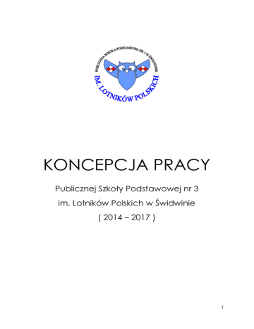 KONCEPCJA PRACY Publicznej Szkoły Podstawowej nr 3 im. Lotników Polskich w Świdwinie ( 2014 – 2017 ) 1 I. Charakterystyka szkoły 1.Dane szkoły: Publiczna Szkoła Podstawowa nr3 w Świdwinie im. Lotników Polskich. adres: 78 -300 Świdwin ul.Szturmowców1, telefon/ fax: 943655092, e-mail: [email protected] 2.Historia i tradycja szkoły: Kiedy sięgamy do historii Publicznej Szkoły Podstawowej nr 3 im. Lotników Polskich, wspomnień i archiwalnych zdjęć, naszym oczom jawi się budynek w stanie surowym – biały, „jak okręt pośrodku oceanu”. Wokół pustka. To był 1967 rok – rok pełen nadziei i planów na przyszłość. Od tamtego czasu wiele się zmieniło i jak ptaki z gniazda wyfrunęło z tych białych murów wiele pokoleń dzieci. A zaczęło się z potrzeby serca. Dzieci z terenu Garnizonu Jednostki Wojskowej dowożone były na zajęcia do miasta. Było to dosyć uciążliwe, dlatego na terenie Klubu Garnizonowego utworzono filię szkoły podstawowej. Z czasem samorzutnie zawiązał się Komitet Budowy Szkoły, na którego czele stanął dowódca dywizji – płk Adam Bidziński. Do organu doradczego dołączyli płk Stanisław Lajter, płk Eugeniusz Myśliwiec i Inspektor Oświaty – p. Stanisław Spychalski. I tak w 1966 r. położono kamień węgielny pod budowę szkoły. Nadszedł sierpień 1967 r. i pierwsze posiedzenie Rady Pedagogicznej (17 osób), na której czele stanął p. Kazimierz Czartowski. Nowy rok szkolny zainaugurowało 332 uczniów zakupiono pomoce dydaktyczne, brakujący sprzęt, pierwsze książki do biblioteki szkolnej – kształtowało się centrum – „serce” osiedla wojskowego. Powstały koła naukowe, a swą działalność rozpoczęło również harcerstwo (i zuchy). Kolejny dyrektor – p. Jan Kwiatkowski od września 1970 r. rozpoczął rozbudowę szkoły. W ciągu dwóch lat – w czynie społecznym rozszerzono w znaczący sposób bazę lokalową. Przyczyniło się to do powiększenia obwodu szkoły. W tym samym roku na czele szkoły stanęła p. Anna Teresińska. Rok 1978 przyniósł szkole wyjątkowy sukces – sad szkolny, zasadzony pod kierunkiem poprzedniego dyrektora został nagrodzony I miejscem w wojewódzkim konkursie „Szkoły Sadami Kwitnące”. Z początkiem lutego 1980 roku stanowisko dyrektora szkoły objęła dotychczasowa wicedyrektor – p. Stefania Olesiejuk – szkoła rozwijała się. Zakupiono sprzęt audiowizualny, nowe meble , sporo książek do biblioteki szkolnej. W 1987 dyrektorem zostaje p. Teresa Domasik. Z myślą o budowie pełnowymiarowej hali sportowej, powołano Społeczny Komitet Rozbudowy 2 Szkoły. Na jego czele stanął płk Stanisław Targasz, a duży wkład w tą inicjatywę wnieśli Burmistrz Miasta Świdwin – p. Franciszek Paszel i p. Mieczysław Romanowski. Dzięki staraniom wielu wspaniałych ludzi i ciężkiej pracy 14 października 1992 r. – w dniu obchodów Jubileuszu 25 - lecia otwarto salę gimnastyczną. Powstały również nowe klasopracownie, a w 1997 r. np. do użytku oddano pracownię komputerową. Z początkiem września 1998 r. stanowisko obejmuje p. Anna Masłowska. W tym samym roku Rada Miejska w Świdwinie, doceniając wkład świdwińskiego Garnizonu w rozwój miasta, budowę szkoły i kultywowanie wśród dzieci i młodzieży postaw patriotycznych i tradycji lotniczych, nadała naszej szkole zaszczytne imię Lotników Polskich. Ukoronowaniem działań z tym związanych stało się nadanie szkole imienia i wręczenie sztandaru, co miało miejsce w dniu 3 października 1998 r. Sekretarz Miasta Świdwin – p. Genowefa Pożoga i wicekurator – p. Andrzej Derkacz, odsłonili ufundowaną przez Samorząd Miasta tablicę pamiątkową z logo szkoły. Od tego dnia data 3 października – uchwałą Rady Pedagogicznej stała się dniem Święta Szkoły. W roku 2010 dyrektorem szkoły zostaje mgr Izabella Starzyńska. Nie brak sukcesów, zarówno naukowych, artystycznych, jak i sportowych, co jest zasługą doskonale wykształconej i ciągle poszukującej nowych kierunków swej twórczej pracy kadry pedagogicznej. Rozwija się nie tylko potencjał ludzki, ale również zaplecze techniczne – z myślą o najmłodszych i reformach w szkolnictwie, o społeczności, którą tworzymy i dzieciach, które są naszą największą radością. 4. Kadra szkoły: Nauczyciele zapewniają wysoki poziom pracy dydaktycznej, wychowawczej i opiekuńczej oraz wykonywanych zadań organizacyjnych. Rozwój zawodowy nauczycieli jest związany z jakościowym rozwojem szkoły oraz indywidualnymi potrzebami. Nauczyciele uczestniczą w różnorodnych formach doskonalenia zawodowego i zdobywają kolejne stopnie awansu. Realizują różne projekty, programy edukacyjne oraz zdobywają wraz z uczniami kolejne sukcesy. 5. Baza szkoły: Budynek szkoły jest dwukondygnacyjny. Na parterze szkoły znajdują się trzy sale do edukacji wczesnoszkolnej. Każda z nich posiada komplet ergonomicznych stolików i krzeseł, przystosowanych do wzrostu uczniów oraz 3 regały. Gabinety wyposażone są w nowoczesne i różnorodne pomoce dydaktyczne, w tym w tablice interaktywne. Wystrój pomieszczeń jest bogaty i estetyczny. Sale te, urządzone są zgodnie z potrzebami dzieci młodszych. Posiadają kąciki do relaksacji i zabawy. Kolejne pomieszczenia to: gabinet logopedyczny, sala oddziału przedszkolnego, bawialnia, biblioteka szkolna wraz z Centrum Multimedialnym posiadającym stały dostęp do Internetu, sala gimnastyczna, gabinet higieny szkolnej oraz stołówka. Na parterze znajduje się również pokój nauczycielski oraz świetlica szkolna, która obejmuje swoją opieką uczniów klas I-VI w tym wszystkich uczniów dojeżdżających. Uczniowie przebywający na świetlicy biorą udział w zajęciach prowadzonych przez wychowawców świetlicy, mogą korzystać z gier, występować z własnymi pomysłami organizowania czasu spędzanego na świetlicy. W szkole funkcjonuje także osobna świetlica dla dzieci przedsz
