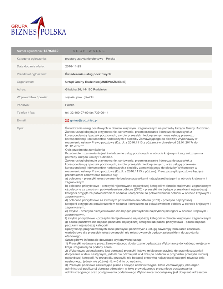 Numer ogłoszenia: 12793869 A RCHI WA L N E Kategoria ogłoszenia: przetarg zapytanie ofertowe - Polska Data dodania oferty: 2016-11-25 Przedmiot ogłoszenia: Świadczenie usług pocztowych Organizator: Urząd Gminy Rudziniec[UNIEWAŻNIENIE] Adres: Gliwicka 26, 44-160 Rudziniec Województwo / powiat: śląskie, pow. gliwicki Państwo: Polska Telefon / fax: tel. 32 400-07-00 fax 739-06-14 E-mail: Opis: [email protected] Świadczenie usług pocztowych w obrocie krajowym i zagranicznym na potrzeby Urzędu Gminy Rudziniec. Zakres usługi obejmuje przyjmowanie, sortowanie, przemieszczanie i doręczanie przesyłek z korespondencją i paczek pocztowych, zwrotu przesyłek niedoręczonych oraz usługę przewozu korespondencji i dokumentów nadawczych z siedziby Zamawiającego do siedziby Wykonawcy w rozumieniu ustawy Prawo pocztowe (Dz. U. z 2016.1113 z póź.zm.) w okresie od 02.01.2017r do 31.12.2017r." Opis przedmiotu zamówienia Przedmiotem zamówienia jest świadczenie usług pocztowych w obrocie krajowym i zagranicznym na potrzeby Urzędu Gminy Rudziniec. Zakres usługi obejmuje przyjmowanie, sortowanie, przemieszczanie i doręczanie przesyłek z korespondencją i paczek pocztowych, zwrotu przesyłek niedoręczonych , oraz usługę przewozu korespondencji i dokumentów nadawczych z siedziby zamawiającego do siedziby Wykonawcy w rozumieniu ustawy Prawo pocztowe (Dz.U. z 2016.1113 z póź.zm). Przez przesyłki pocztowe będące przedmiotem zamówienia rozumie się: a) polecone - przesyłki rejestrowane nie będące przesyłkami najszybszej kategorii w obrocie krajowym i zagranicznym b) polecone priorytetowe - przesyłki rejestrowane najszybszej kategorii w obrocie krajowym i zagranicznym c) polecone za zwrotnym potwierdzeniem odbioru (ZPO) - przesyłki nie będące przesyłkami najszybszej kategorii przyjęte za potwierdzeniem nadania i doręczone za pokwitowaniem odbioru w obrocie krajowym i zagranicznym, d) polecone priorytetowe za zwrotnym potwierdzeniem odbioru (ZPO) - przesyłki najszybszej kategorii przyjęte za potwierdzeniem nadania i doręczone za pokwitowaniem odbioru w obrocie krajowym i zagranicznym, e) zwykle - przesyłki nierejestrowane nie będące przesyłkami najszybszej kategorii w obrocie krajowym i zagranicznym, f) zwykłe priorytetowe - przesyłki nierejestrowane najszybszej kategorii w obrocie krajowym i zagranicznym g) paczki pocztowe nie będące paczkami najszybszej kategorii lub paczki priorytetowe - paczki będące paczkami najszybszej kategorii Specyfikację prognozowanych ilości przesyłek pocztowych i usługę zawierają formularze ilościowowartościowe dla przesyłek rejestrowanych i nie rejestrowanych będący załącznikiem do zapytania ofertowego. Szczegółowe informacje dotyczące wykonywanej usługi 1) Przesyłki nadawane przez Zamawiającego dostarczane będą przez Wykonawcę do każdego miejsca w kraju i zagranicą na podany adres. 2) Wykonawca zobowiązany jest doręczać przesyłki listowe miejscowe przyjęte do przemieszczenia i doręczenia w dniu następnym, jednak nie później niż w 4 dniu po nadaniu w przypadku przesyłki listowej najszybszej kategorii. W przypadku przesyłki nie będącej przesyłką najszybszej kategorii również dnia następnego, jednak nie później niż w 6 dniu po nadaniu. 3) Przesyłki pocztowe zawierające pisma i decyzje administracyjne, które Zamawiający jako organ administracji publicznej doręcza adresatom w toku prowadzonego przez niego postępowania administracyjnego oraz postępowania podatkowego Wykonawca zobowiązany jest doręczać adresatom zgodnie z trybem i sposobem określonym w Kodeksie postępowania administracyjnego oraz Ordynacji podatkowej. 4) Przesyłki pocztowe polecone, których adresatem jest Sąd oraz w sytuacji, gdy Zamawiającemu niezbędne jest uzyskanie potwierdzenia nadania, które ma moc dokumentu urzędowego, Wykonawca zobowiązany jest odebrać w tym samym dniu, w którym Zamawiający zgłosi mu taką konieczność oraz nadać w tym samym dniu w polskiej palcówce pocztowej operatora wyznaczonego tj. Poczty Polskiej S.A. Wykonawca zobowiązany jest do uzyskania potwierdzenia przesyłki, a otrzymane potwierdzenie niezwłocznie dostarczyć Zamawiającemu. 5) Przesyłki pocztowe będą nadawane przez Wykonawcę w dniu ich odbioru z siedziby Zamawiającego. 6) Miejscem odbioru przez Wykonawcę od Zamawiającego przesyłek do nadania oraz stosownej dokumentacji potwierdzającej ich ilość i rodzaj jest siedziba Zamawiającego tj. Urząd Gminy Rudziniec, ul. Gliwicka 26, 44-160 Rudziniec. 7) Przesyłki przeznaczone do nadania odbierane będą z siedziby Zamawiającego w dni robocze od poniedziałku do piątku między godziną 13.00, a godz. 14.00. 8) Wykonawca potwierdza odbiór przesyłek do nadania w zestawieniu ilościowym oraz potwierdza pieczęcią w książce nadawczej odbiór przesyłek rejestrowanych. 9) Odbiór przesyłek przeznaczonych do nadania dokonywać będzie upoważniony przedstawiciel Wykonawcy po okazaniu stosownego upoważnienia. 10) Odpowiedzialność za przesyłki przechodzi na Wykonawcę z chwilą ich przekazania upoważnianemu przez niego przedstawicielowi. 11) Zamawiający nadaje przesyłki w stanie umożliwiającym Wykonawcy doręczenie do miejsca przeznaczenia poprzez umieszczenie na przesyłce listowej lub paczce nazwy odbiorcy wraz z jego adresem określając rodzaj przesyłki oraz umieszczania na stronie adresowej każdej nadawanej przesyłkinadruku lub pieczęci określającej pełną nazwę i adres Zamawiającego. 12) Zamawiający zobowiązany jest do umieszczania na stronie adresowej przesyłek, w miejscu przeznaczonym na znak opłaty pocztowej, oznaczenia potwierdzającego wniesienie opłaty za usługę w postaci napisu, nadruku lub odcisku pieczęci o treści wskazanej przez Wykonawcę. 13) Zamawiający będzie korzystał ze swojego opakowania dla przesyłek i paczek. 14) Zamawiający będzie korzystał z własnych wzorów druków ,,potwierdzenia odbioru
