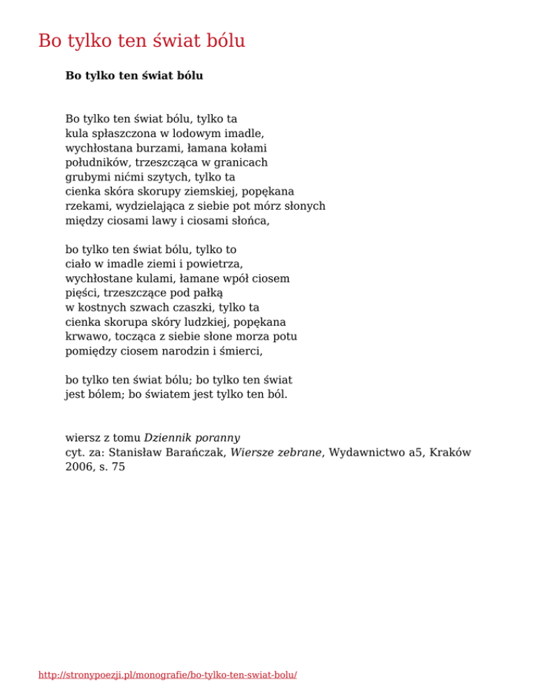 Bo tylko ten świat bólu Bo tylko ten świat bólu Bo tylko ten świat bólu, tylko ta kula spłaszczona w lodowym imadle, wychłostana burzami, łamana kołami południków, trzeszcząca w granicach grubymi nićmi szytych, tylko ta cienka skóra skorupy ziemskiej, popękana rzekami, wydzielająca z siebie pot mórz słonych między ciosami lawy i ciosami słońca, bo tylko ten świat bólu, tylko to ciało w imadle ziemi i powietrza, wychłostane kulami, łamane wpół ciosem pięści, trzeszczące pod pałką w kostnych szwach czaszki, tylko ta cienka skorupa skóry ludzkiej, popękana krwawo, tocząca z siebie słone morza potu pomiędzy ciosem narodzin i śmierci, bo tylko ten świat bólu; bo tylko ten świat jest bólem; bo światem jest tylko ten ból. wiersz z tomu Dziennik poranny cyt. za: Stanisław Barańczak, Wiersze zebrane, Wydawnictwo a5, Kraków 2006, s. 75 http://stronypoezji.pl/monografie/bo-tylko-ten-swiat-bolu/