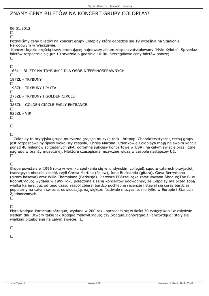Gigs.pl - Koncerty :: Festiwale :: Imprezy ZNAMY CENY BILETÓW NA KONCERT GRUPY COLDPLAY! 06.01.2012 Poznaliśmy ceny biletów na koncert grupy Coldplay który odbędzie się 19 września na Stadionie Narodowym w Warszawie. Koncert będzie częścią trasy promującej najnowszy album zespołu zatytułowany "Mylo Xyloto". Sprzedaż biletów rozpocznie się już 10 stycznia o godzinie 10:00. Szczegółowe ceny biletów poniżej: 165zł - BILETY NA TRYBUNY I DLA OSÓB NIEPEŁNOSPRAWNYCH 187ZŁ - TRYBUNY 198ZŁ - TRYBUNY I PŁYTA 275ZŁ - TRYBUNY I GOLDEN CIRCLE 385ZŁ - GOLDEN CIRCLE EARLY ENTRANCE 825ZŁ - VIP Coldplay to brytyjska grupa muzyczna grająca muzykę rock i britpop. Charakterystyczną cechą grupy jest rozpoznawalny śpiew wokalisty zespołu, Chrisa Martina. Członkowie Coldplaya mają na swoim koncie ponad 40 milionów sprzedanych płyt, ogromne sukcesy koncertowe w USA i na całym świecie oraz liczne nagrody w branży muzycznej. Niektóre czasopisma muzyczne widzą w zespole następców U2. Grupa powstała w 1996 roku w wyniku spotkania się w londyńskim college’u czterech przyjaciół, tworzących obecnie zespół, czyli Chrisa Martina (śpiew), Jona Bucklanda (gitara), Guya Berrymana (gitara basowa) oraz Willa Championa (Perkusja). Pierwsza EP’ka zatytułowana „The Blue Room” wydana w 1999 roku połączona z serią koncertów udowodniły, że Colpdlay ma przed sobą wielka karierę. Już od tego czasu zespół zbierał bardzo pochlebne recenzje i stawał się coraz bardziej popularny na całym świecie, odwiedzając największe festiwale muzyczne, nie tylko w Europie i Stanach Zjednoczonych. Płyta „Parachutes” wydana w 200 roku sprzedała się w ilości 70 tysięcy kopii w zaledwie siedem dni. Utwory takie jak „Yellow” czy „Don’t Panic” stały się wielkimi przebojami na całym świecie. http://gigs.pl Kreator PDF Utworzono 4 March, 2017, 05:45