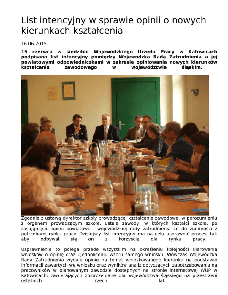 List intencyjny w sprawie opinii o nowych kierunkach kształcenia 16.06.2015 15 czerwca w siedzibie Wojewódzkiego Urzędu Pracy w Katowicach podpisano list intencyjny pomiędzy Wojewódzką Radą Zatrudnienia a jej powiatowymi odpowiedniczkami w zakresie opiniowania nowych kierunków kształcenia zawodowego w województwie śląskim. Zgodnie z ustawą dyrektor szkoły prowadzącej kształcenie zawodowe, w porozumieniu z organem prowadzącym szkołę, ustala zawody, w których kształci szkoła, po zasięgnięciu opinii powiatowej i wojewódzkiej rady zatrudnienia co do zgodności z potrzebami rynku pracy. Dzisiejszy list intencyjny ma na celu usprawnić proces, tak aby odbywał się on z korzyścią dla rynku pracy. Usprawnienie to polega przede wszystkim na określeniu kolejności kierowania wniosków o opinię oraz ujednoliceniu wzoru samego wniosku. Wówczas Wojewódzka Rada Zatrudnienia wydaje opinię na temat wnioskowanego kierunku na podstawie informacji zawartych we wniosku oraz wyników analiz dotyczących zapotrzebowania na pracowników w planowanym zawodzie dostępnych na stronie internetowej WUP w Katowicach, zawierających zbiorcze dane dla województwa śląskiego na przestrzeni ostatnich trzech lat. Dokumentacja dot. zasad wydawania opinii przez WRZ dostępna jest TUTAJ