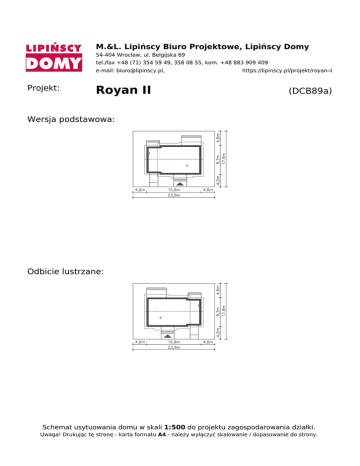 M.&L. Lipińscy Biuro Projektowe, Lipińscy Domy 54-404 Wrocław, ul. Belgijska 69 tel./fax +48 (71) 354 59 49, 358 08 55, kom. +48 883 909 409 e-mail: [email protected], Projekt: Royan II https://lipinscy.pl/projekt/royan-ii (DCB89a) Wersja podstawowa: Odbicie lustrzane: Schemat usytuowania domu w skali 1:500 do projektu zagospodarowania działki. Uwaga! Drukując tę stronę - karta formatu A4 - należy wyłączyć skalowanie / dopasowanie do strony. Powered by TCPDF (www.tcpdf.org)