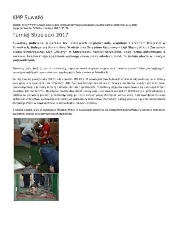 KMP Suwałki Źródło: http://www.suwalki.policja.gov.pl/po3/informacje/aktualnosci/42802,TurniejStrzelecki2017.html Wygenerowano: Sobota, 4 marca 2017, 05:36 Turniej Strzelecki 2017 Suwalscy policjanci w okresie ferii zimowych zorganizowali, wspólnie z Urzędem Miejskim w Suwałkach, Delegaturą Kuratorium Oświaty oraz Zarządem Rejonowym Ligi Obrony Kraju i Zarządem Klubu Strzeleckiego LOK ,,Wigry” w Suwałkach, Turniej Strzelecki. Taka forma aktywnego, a zarazem bezpiecznego spędzania wolnego czasu przez młodych ludzi, to jedyna oferta w naszym województwie. Suwalscy policjanci, już po raz dziewiąty, zaproponowali aktywne zajęcia ze strzelania uczniom klas gimnazjalnych, ponadgimnazjalnych oraz studentom, spędzającym ferie zimowe w Suwałkach. Turniej trwa od poniedziałku (30.01.) do czwartku (02.02.). W pierwszych dwóch dniach strzelanie odbywało się na strzelnicy policyjnej, a w kolejnych - na strzelnicy LOK. Podczas turnieju zawodnicy strzelają z karabinów sportowych oraz broni pneumatycznej, z postawy leżącej i stojącej do tarcz sportowych. Uczestnicy najpierw zapoznawani są z obsługą broni i zasadami bezpieczeństwa. Następnie przechodzą krótki trening oraz - pod okiem suwalskich WOPR-owców, przeszkolenie z udzielania pierwszej pomocy przedmedycznej, po czym rozpoczynają strzelanie konkursowe. Nad zawodami czuwają sędziowie strzelectwa sportowego oraz policyjni instruktorzy strzelectwa. Zawodnicy walczą grupowo o puchar Komendanta Miejskiego Policji w Suwałkach oraz o indywidualne medale i dyplomy. 3 lutego o godz. 9:00 w Komendzie Miejskiej Policji w Suwałkach odbędzie się podsumowanie turnieju i uroczyste wręczanie pucharów, medali oraz pamiątkowych dyplomów. Ocena: 0/5 (0) Tweetnij