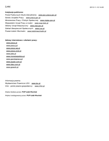 Linki 2013-11-10 14:45 Instytucje publiczne: Portal Publicznych Służb Zatrudnienia: www.psz.praca.gov.pl Serwis Urzędów Pracy: www.praca.gov.pl Ministerstwo Pracy i Polityki Społecznej: www.mpips.gov.pl Wojewódzki Urząd Pracy w Łodzi: www.wup.lodz.pl Główny Urząd Statystyczny: www.stat.gov.pl Zakład Ubezpieczeń Społecznych: www.zus.pl Powiat Łódzki Wschodni: www.lodzkiwschodni.pl Adresy internetowe z ofertami pracy: www.praca.pl www.pracuj.pl www.praca.wp.pl www.praca.onet.pl www.jobs.pl www.monsterpolska.pl www.gazetapraca.pl www.aupair.com.pl www.ides.com.pl www.gowork.pl Informacja prawna: Wydawnictwo Prawnicze LEX: www.lex.pl Infor - portal prawno-gospodarczy: www.infor.pl Artykuł dodany przez: PUP Łódź-Wschód Artykuł zredagowany przez: PUP Łódź-Wschód