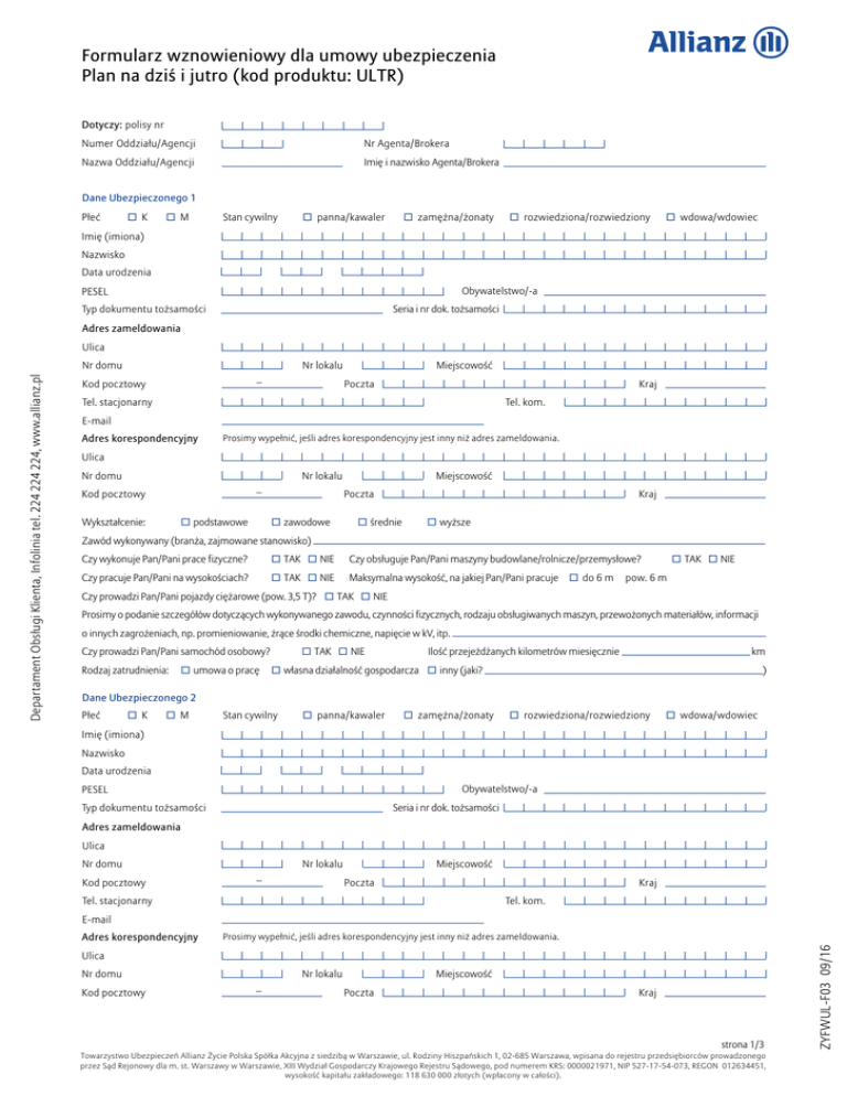 Formularz wznowieniowy dla umowy ubezpieczenia Plan na dziś i jutro (kod produktu: ULTR) Dotyczy: polisy nr Numer Oddziału/Agencji Nr Agenta/Brokera Nazwa Oddziału/Agencji Imię i nazwisko Agenta/Brokera Dane Ubezpieczonego 1 Płeć ☐ K ☐ M Stan cywilny ☐ panna/kawaler ☐ zamężna/żonaty ☐ rozwiedziona/rozwiedziony ☐ wdowa/wdowiec Imię (imiona) Nazwisko Data urodzenia Obywatelstwo/-a PESEL Seria i nr dok. tożsamości Typ dokumentu tożsamości Adres zameldowania Ulica Nr lokalu – Kod pocztowy Miejscowość Poczta Kraj Tel. stacjonarny Tel. kom. E-mail Adres korespondencyjny Prosimy wypełnić, jeśli adres korespondencyjny jest inny niż adres zameldowania. Ulica Nr domu Nr lokalu – Kod pocztowy Wykształcenie: ☐ podstawowe Miejscowość Poczta ☐ zawodowe Kraj ☐ średnie ☐ wyższe Zawód wykonywany (branża, zajmowane stanowisko) Czy wykonuje Pan/Pani prace fizyczne? ☐ TAK ☐ NIE Czy obsługuje Pan/Pani maszyny budowlane/rolnicze/przemysłowe? Czy pracuje Pan/Pani na wysokościach? ☐ TAK ☐ NIE Maksymalna wysokość, na jakiej Pan/Pani pracuje ☐ do 6 m ☐ TAK ☐ NIE pow. 6 m Czy prowadzi Pan/Pani pojazdy ciężarowe (pow. 3,5 T)? ☐ TAK ☐ NIE Prosimy o podanie szczegółów dotyczących wykonywanego zawodu, czynności fizycznych, rodzaju obsługiwanych maszyn, przewożonych materiałów, informacji o innych zagrożeniach, np. promieniowanie, żrące środki chemiczne, napięcie w kV, itp. ☐ TAK ☐ NIE Czy prowadzi Pan/Pani samochód osobowy? Rodzaj zatrudnienia: ☐ umowa o pracę Ilość przejeżdżanych kilometrów miesięcznie km ☐ własna działalność gospodarcza ☐ inny (jaki? ) Dane Ubezpieczonego 2 Płeć ☐ K ☐ M Stan cywilny ☐ panna/kawaler ☐ zamężna/żonaty ☐ rozwiedziona/rozwiedziony ☐ wdowa/wdowiec Imię (imiona) Nazwisko Data urodzenia Obywatelstwo/-a PESEL Seria i nr dok. tożsamości Typ dokumentu tożsamości Adres zameldowania Ulica Nr domu Kod pocztowy Nr lokalu – Miejscowość Poczta Kraj Tel. stacjonarny Tel. kom. E-mail Adres korespondencyjny Prosimy wypełnić, jeśli adres korespondencyjny jest inny niż adres zameldowania. Ulica Nr domu Kod pocztowy Nr lokalu – Miejscowość Poczta Kraj strona 1/3 Towarzystwo Ubezpieczeń Allianz Życie Polska Spółka Akcyjna z siedzibą w Warszawie, ul. Rodziny Hiszpańskich 1, 02-685 Warszawa, wpisana do rejestru przedsiębiorców prowadzonego przez Sąd Rejonowy dla m. st. Warszawy w Warszawie, XIII Wydział Gospodarczy Krajowego Rejestru Sądowego, pod numerem KRS: 0000021971, NIP 527-17-54-073, REGON 012634451, wysokość kapitału zakładowego: 118 630 000 złotych (wpłacony w całości). ZYFWUL-F03 09/16 Departament Obsługi Klienta, Infolinia tel. 224 224 224, www.allianz.pl Nr domu Wykształcenie: ☐ podstawowe ☐ zawodowe ☐ średnie ☐ wyższe Zawód wykonywany (branża, zajmowane stanowisko) Czy wykonuje Pan/Pani prace fizyczne? ☐ TAK ☐ NIE Czy obsługuje Pan/Pani maszyny budowlane/rolnicze/przemysłowe? Czy pracuje Pan/Pani na wysokościach? ☐ TAK ☐ NIE Maksymalna wysokość, na jakiej Pan/Pani pracuje ☐ do 6 m ☐ TAK ☐ NIE ☐ pow. 6 m Czy prowadzi Pan/Pani pojazdy ciężarowe (pow. 3,5 T)? ☐ TAK ☐ NIE Prosimy o podanie szczegółów dotyczących wykonywanego zawodu, czynności fizycznych, rodzaju obsługiwanych maszyn, przewożonych materiałów, informacji o innych zagrożeniach, np. promieniowanie, żrące środki chemiczne, napięcie w kV, itp. ☐ TAK ☐ NIE Czy prowadzi Pan/Pani samochód osobowy? Departament Obsługi Klienta, Infolinia tel. 224 224 224, www.allianz.pl Rodzaj zatrudnienia: ☐ umowa o pracę Ilość przejeżdżanych kilometrów miesięcznie km ☐ własna działalność gospodarcza ☐ inny (jaki? ) Dane Ubezpieczonego Dziecka 1 Imię Nazwisko Dane Ubezpieczonego Dziecka 2 Imię Nazwisko Data urodzenia Data urodzenia PESEL PESEL Obywatelstwo/-a Obywatelstwo/-a Typ dok. tożsamości Typ dok. tożsamości Seria i nr dok. toż. Seria i nr dok. toż. Adres zameldowania ☐ jak adres zam. Ubezpieczonego 1 ☐ jak adres zam. Ubezpieczonego 2 Adres zameldowania ☐ jak adres zam. Ubezpieczonego 1 ☐ jak adres zam. Ubezpieczonego 2 ☐ inny ☐ inny Adres korespondencyjny ☐ jak adres koresp. Ubezpieczonego 1 ☐ jak adres koresp. Ubezpieczonego 2 Adres korespondencyjny ☐ jak adres koresp. Ubezpieczonego 1 ☐ jak adres koresp. Ubezpieczonego 2 ☐ inny ☐ inny Dane Ubezpieczającego ☐ jak dane Pierwszego Ubezpieczonego ☐ jak dane Drugiego Ubezpieczonego Prosimy wypełnić, jeśli Ubezpieczającym nie jest ani Pierwszy, ani Drugi Ubezpieczony Typ podmiotu ☐ osoba fizyczna ☐ osoba prawna ☐ jednostka organizacyjna nie posiadająca osobowości prawnej (w przypadku osób prawnych, jednostek organizacyjnych nie posiadających osobowości prawnej oraz osób fizycznych prowadzących działalność gospodarczą należy wypełnić dodatkowy druk – Dane osoby reprezentującej dany podmiot lub daną osobę fizyczną) Płeć ☐ K ☐ M Wykształcenie Stan cywilny ☐ panna/kawaler ☐ podstawowe ☐ zamężna/żonaty ☐ zawodowe ☐ rozwiedziona/rozwiedziony ☐ średnie ☐ wdowa/wdowiec ☐ wyższe Imię (imiona)/nazwa firmy Nazwisko/nazwa firmy cd. PESEL Data urodzenia Seria i nr dok. tożsamości Typ dokumentu tożsamości Obywatelstwo/-a REGON NIP* PKD wiodąca KRS/RHB Liczba zatrudnionych osób Obrót roczny w ostatnim roku obrachunkowym: ☐ do 3 mln zł ☐ do 40 mln zł ☐ pow. 40 mln zł * W przypadku osób fizycznych numer NIP wymagany jest jedynie od osób prowadzących działalność gospodarczą lub będących zarejestrowanymi podatnikami podatku od towarów i usług. Adres zameldowania / siedziba firmy Ulica Nr domu Kod pocztowy Nr lokalu – Miejscowość Poczta Kraj Tel. stacjonarny Tel. kom. E-mail Adres korespondencyjny (jeżeli inny niż zameldowania /siedziby) Ulica Nr domu Kod pocztowy Nr lokalu – Miejscowość Poczta Kraj Tryb opłacania składek polecenie zapłaty obowiązujące