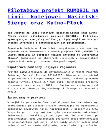 Pilotażowy projekt RUMOBIL na linii kolejowej NasielskSierpc oraz Kutno-Płock Już wkrótce na linii kolejowej Nasielsk-Sierpc oraz KutnoPłock ruszy pilotażowy projekt RUMOBIL. Podróżni, wykorzystując specjalną aplikację, będą mogli na bieżąco śledzić informacje o interesujących ich połączeniach. Inwestycja będzie możliwa dzięki pozyskanemu przez samorząd województwa dofinansowaniu w ramach projektu CE55 „RUMOBIL” – „Rural Mobility in European Regions affected by Demographic Change” (mobilność na obszarach wiejskich w europejskich regionach dotkniętych zmianami demograficznymi). Współpraca pomiędzy unijnymi regionami Projekt zakwalifikowano do dofinansowania w ramach Programu Interreg Central Europe 2014–2020. Bierze w nim udział 13 partnerów z 7 krajów Europy centralnej. Całkowity budżet zadania wynosi prawie 2,7 mln euro. Zakończenie projektu planowane jest w maju 2019 r. Partnerem wiodącym jest Ministerstwo Rozwoju Regionalnego i Transportu SaksoniiAnhalt. Sprawdzamy w praktyce W najbliższym czasie Samorząd Województwa Mazowieckiego przeprowadzi pilotażowy projekt polegający na wyposażeniu autobusów szynowych Kolei Mazowieckich w odbiorniki GPS. Wszystko po to, aby możliwe było pozyskiwanie dokładnych informacji o lokalizacji pociągów KM. Zebrane dane, po przetworzeniu, będą udostępnione podróżnym drogą elektroniczną za pośrednictwem aplikacji, którą każdy pasażer będzie mógł zainstalować na swoim telefonie, smartfonie czy tablecie. Wszyscy pasażerowie będą mogli śledzić pozycję pociągu, który ich interesuje. Trasa Pilotaż będzie na liniach kolejowych nr 27 Nasielsk–Sierpc oraz nr 31 Kutno–Płock, czyli tam, gdzie kursują nowoczesne szynobusy KM. W ramach projektu przewidziany jest również zakup 2 infokiosków, które znajdą się na stacjach PKP. Pozwoli to na dostęp do informacji także tym pasażerom, którzy na co dzień nie korzystają z mobilnych usług IT. W ramach zadania realizowane będą kampanie promocyjne, zachęcające mieszkańców Mazowsza do korzystania z publicznego transportu. W spotkaniu uczestniczyli m.in. Marszałek Województwa Mazowieckiego Adam Struzik, Starosta Sierpecki Jan Laskowski, Przewodniczący Rady Powiatu Jan Rzeszotarski, Burmistrz Miasta Sierpca Jarosław Perzyński a także przedstawiciele ościennych powiatów. info. http://www.mazovia.pl/aktualnosci/art,5595,rumobil-pilotaz-w-s ierpcu.html Pilotażowy projekt RUMOBIL na linii kolejowej Nasielsk- Sierpc oraz Kutno-Płock