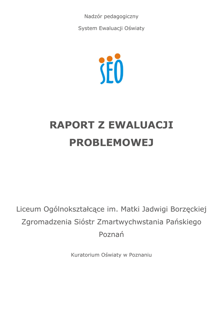 Nadzór pedagogiczny System Ewaluacji Oświaty RAPORT Z EWALUACJI PROBLEMOWEJ Liceum Ogólnokształcące im. Matki Jadwigi Borzęckiej Zgromadzenia Sióstr Zmartwychwstania Pańskiego Poznań Kuratorium Oświaty w Poznaniu Wstęp Prezentowany raport jest rezultatem ewaluacji zewnętrznej przeprowadzonej w szkole przez wizytatorów do spraw ewaluacji. Raport z ewaluacji problemowej dotyczy jednego lub kilku z przedstawionych poniżej wymagań państwa. Ewaluacja zewnętrzna polega na zbieraniu i analizowaniu informacji na temat funkcjonowania szkoły w obszarach wyznaczonych przez wymagania państwa: 1. Szkoła lub placówka realizuje koncepcję pracy ukierunkowaną na rozwój uczniów. 2. Procesy edukacyjne są zorganizowane w sposób sprzyjający uczeniu się. 3. Uczniowie nabywają wiadomości i umiejętności określone w podstawie programowej. 4. Uczniowie są aktywni. 5. Respektowane są normy społeczne. 6. Szkoła lub placówka wspomaga rozwój uczniów, z uwzględnieniem ich indywidualnej sytuacji. 7. Nauczyciele współpracują w planowaniu i realizowaniu procesów edukacyjnych. 8. Promowana jest wartość edukacji. 9. Rodzice są partnerami szkoły lub placówki. 10. Wykorzystywane są zasoby szkoły lub placówki oraz środowiska lokalnego na rzecz wzajemnego rozwoju. 11. Szkoła lub placówka, organizując procesy edukacyjne, uwzględnia wnioski z analizy wyników sprawdzianu, egzaminu gimnazjalnego, egzaminu maturalnego, egzaminu potwierdzającego kwalifikacje zawodowe i egzaminu potwierdzającego kwalifikacje w zawodzie oraz innych badań zewnętrznych i wewnętrznych. 12. Zarządzanie szkołą lub placówką służy jej rozwojowi. Ewaluacja ma także na celu ustalenie poziomu spełniania przez szkołę wymagań zawartych w rozporządzeniu Ministra Edukacji Narodowej z dnia 7.10.2009r. wraz ze zmianami z dnia 10.05.2013r. Szkoła może spełniać te wymagania na pięciu poziomach: ● Poziom E - oznaczający niski stopień wypełniania wymagania przez szkołę. ● Poziom D - oznaczający podstawowy stopień wypełniania wymagania przez szkołę. ● Poziom C - oznaczający średni stopień wypełniania wymagania przez szkołę. ● Poziom B - oznaczający wysoki stopień wypełniania wymagania przez szkołę. ● Poziom A - oznaczający bardzo wysoki stopień wypełniania wymagania przez szkołę. Liceum Ogólnokształcące im. Matki Jadwigi Borzęckiej Zgromadzenia Sióstr Zmartwychwstania Pańskiego 2/38 Opis metodologii Badanie zostało zrealizowane w dniach 09-10-2014 - 23-10-2014 przez zespół wizytatorów ds. ewaluacji, w skład którego weszli: Renata Pawlak i Izabela Liebert-Jędroszkowiak. Badaniem objęto 19 uczniów (ankiety i wywiad grupowy), 21 rodziców (ankiety i wywiad grupowy) i 16 nauczycieli (ankiety i wywiady grupowe). Przeprowadzono ankietowanie, wywiad indywidualny z dyrektorem placówki, grupowy z przedstawicielami partnerów szkoły, a także obserwacje lekcji i analizę dokumentacji. Na podstawie zebranych danych został sporządzony raport, który obejmuje podstawowe obszary działania szkoły lub placówki. Wyjaśnienie skrótów dla narzędzi: OZ - Arkusz obserwacji zajęć AD - Kwestionariusz ankiety dla dyrektora/dyrektorki szkoły AN - Kwestionariusz ankiety dla nauczycieli AR - Kwestionariusz ankiety dla rodziców AMD - Kwestionariusz ankiety dla uczniów "Mój dzień" AMS - Kwestionariusz ankiety dla uczniów "Moja szkoła" APW - Kwestionariusz ankiety poewaluacyjnej dla wizytatora ADZ - Kwestionariusz badania "Analiza danych zastanych" WN - Scenariusz wywiadu grupowego z nauczycielami WR - Scenariusz wywiadu grupowego z rodzicami WU - Scenariusz wywiadu grupowego z uczniami WD - Scenariusz wywiadu z dyrektorem/dyrektorką szkoły WNPO - Scenariusz wywiadu z nauczycielem po obserwacji WP - Scenariusz wywiadu z partnerami WPN - Scenariusz wywiadu z pracownikami niepedagogicznymi WNO - Scenariusz wywiadu z zespołem nauczycieli uczących w jednym oddziale Liceum Ogólnokształcące im. Matki Jadwigi Borzęckiej Zgromadzenia Sióstr Zmartwychwstania Pańskiego 3/38 Obraz szkoły Liceum Ogólnokształcące im. Matki Jadwigi Borzęckiej w Poznaniu usytuowane jest przy ulicy Głogowskiej 147. Jest to szkoła katolicka, oparta na tradycyjnych wartościach. Główną dewizą pracy placówki jest hasło: "Miłością i Prawdą". W budynku szkoły znajdują się sale lekcyjne, w tym laboratorium językowe, pracownia fizyko-chemiczna, plastyczna, informatyczna i multimedialna, a także biblioteka i kaplica. Biblioteka szkolna pełni też funkcję międzyprzedmiotowej pracowni i jest szkolnym ośrodkiem informacji służącym uczniom, pracownikom szkoły oraz rodzicom. Szkoła dysponuje boiskiem i salą gimnastyczną o wysokim standardzie w Zmartwychwstańskim Centrum Sportu i Rehabilitacji. W okresie wiosenno-letnim uczniowie mają do dyspozycji boisko szkolne. W ostatnim tygodniu roku szkolnego na boisku organizowany jest zwykle piknik szkolny i dzień sportu, gdzie uczniowie mogą brać udział w wielu konkurencjach sportowych i grach zespołowych. Przyszkolny ogród dendrologiczny zaprojektowali i opiekują się nim pracownicy naukowi i studenci Uniwersytetu Przyrodniczego w Poznaniu. Wszystkie posadzone w nim gatunki roślin, z różnych części świata, zaopatrzone są specjalną tabliczką z nazwą w języku polskim i łacińskim oraz miejscem pochodzenia. Starannie dobrana kolekcja roślin stanowi dla uczniów cenny materiał do zgłębiania wiedzy z zakresu botaniki, a urocze zakątki ogrodu są także inspiracją dla uczniów uzdolnionych artystycznie. W trosce o najlepszą jakość edukacji uczniów szkoła nieustannie wzbogaca swoją bazę dydaktyczną. Działania szkoły w każdym roku skoncentrowane są wokół konkretnego hasła. W poprzednich latach były to m.in. "Rok Rodziny", "Rok Patronki Szkoły", "Rok Talentów", "Rok Wielkopolski", "Rok Dobrych Obyczajów", "Rok Nauki", a w bieżącym roku szkolnym: "Rok Spotkania z Jezusem". W