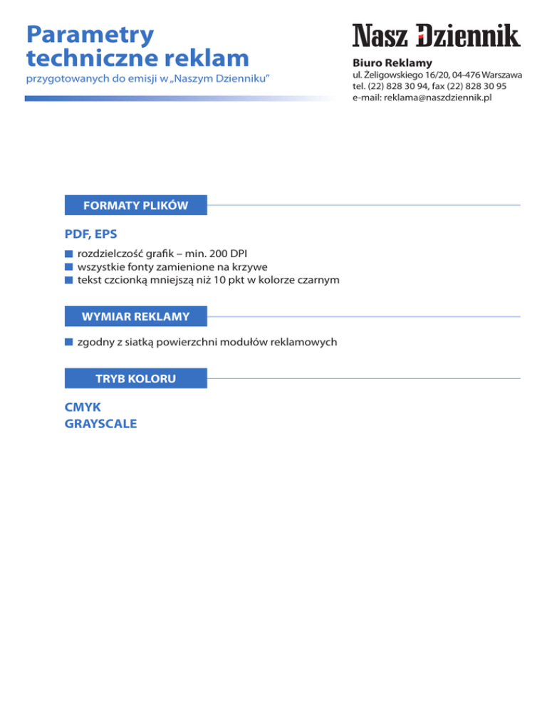 Parametry techniczne reklam przygotowanych do emisji w „Naszym Dzienniku” FORMATY PLIKÓW PDF, EPS rozdzielczość grafik – min. 200 DPI wszystkie fonty zamienione na krzywe tekst czcionką mniejszą niż 10 pkt w kolorze czarnym WYMIAR REKLAMY zgodny z siatką powierzchni modułów reklamowych TRYB KOLORU CMYK GRAYSCALE Biuro Reklamy ul. Żeligowskiego 16/20, 04-476 Warszawa tel. (22) 828 30 94, fax (22) 828 30 95 e-mail: [email protected]