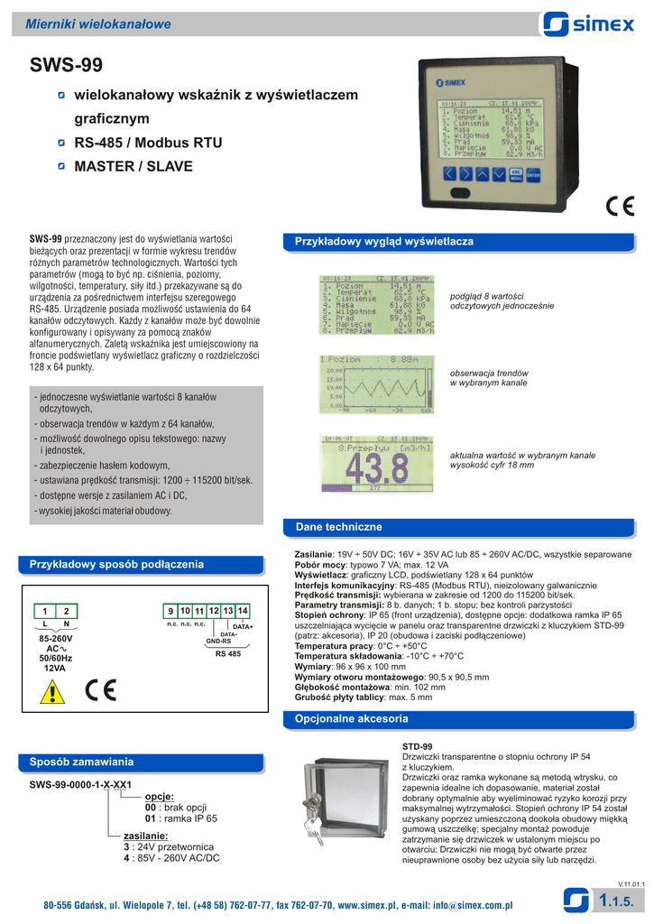 Mierniki wielokana³owe SWS-99 wielokana³owy wskaŸnik z wyœwietlaczem graficznym RS-485 / Modbus RTU MASTER / SLAVE SWS-99 przeznaczony jest do wyœwietlania wartoœci bie¿¹cych oraz prezentacji w formie wykresu trendów ró¿nych parametrów technologicznych. Wartoœci tych parametrów (mog¹ to byæ np. ciœnienia, poziomy, wilgotnoœci, temperatury, si³y itd.) przekazywane s¹ do urz¹dzenia za poœrednictwem interfejsu szeregowego RS-485. Urz¹dzenie posiada mo¿liwoœæ ustawienia do 64 kana³ów odczytowych. Ka¿dy z kana³ów mo¿e byæ dowolnie konfigurowany i opisywany za pomoc¹ znaków alfanumerycznych. Zalet¹ wskaŸnika jest umiejscowiony na froncie podœwietlany wyœwietlacz graficzny o rozdzielczoœci 128 x 64 punkty. Przyk³adowy wygl¹d wyœwietlacza podgl¹d 8 wartoœci odczytowych jednoczeœnie obserwacja trendów w wybranym kanale - jednoczesne wyœwietlanie wartoœci 8 kana³ów odczytowych, - obserwacja trendów w ka¿dym z 64 kana³ów, - mo¿liwoœæ dowolnego opisu tekstowego: nazwy i jednostek, aktualna wartoœæ w wybranym kanale wysokoœæ cyfr 18 mm - zabezpieczenie has³em kodowym, - ustawiana prêdkoœæ transmisji: 1200 ÷ 115200 bit/sek. - dostêpne wersje z zasilaniem AC i DC, - wysokiej jakoœci materia³ obudowy. Dane techniczne Przyk³adowy sposób pod³¹czenia 1 2 9 10 11 12 13 14 L N n.c. n.c. n.c. DATA+ DATA- 85-260V AC 50/60Hz 12VA GND-RS RS 485 Zasilanie: 19V ÷ 50V DC; 16V ÷ 35V AC lub 85 ÷ 260V AC/DC, wszystkie separowane Pobór mocy: typowo 7 VA; max. 12 VA Wyœwietlacz: graficzny LCD, podœwietlany 128 x 64 punktów Interfejs komunikacyjny: RS-485 (Modbus RTU), nieizolowany galwanicznie Prêdkoœæ transmisji: wybierana w zakresie od 1200 do 115200 bit/sek. Parametry transmisji: 8 b. danych; 1 b. stopu; bez kontroli parzystoœci Stopieñ ochrony: IP 65 (front urz¹dzenia), dostêpne opcje: dodatkowa ramka IP 65 uszczelniaj¹ca wyciêcie w panelu oraz transparentne drzwiczki z kluczykiem STD-99 (patrz: akcesoria), IP 20 (obudowa i zaciski pod³¹czeniowe) Temperatura pracy: 0°C ÷ +50°C Temperatura sk³adowania: -10°C ÷ +70°C Wymiary: 96 x 96 x 100 mm Wymiary otworu monta¿owego: 90,5 x 90,5 mm G³êbokoœæ monta¿owa: min. 102 mm Gruboœæ p³yty tablicy: max. 5 mm Opcjonalne akcesoria Sposób zamawiania SWS-99-0000-1-X-XX1 opcje: 00 : brak opcji 01 : ramka IP 65 zasilanie: 3 : 24V przetwornica 4 : 85V - 260V AC/DC STD-99 Drzwiczki transparentne o stopniu ochrony IP 54 z kluczykiem. Drzwiczki oraz ramka wykonane s¹ metodà wtrysku, co zapewnia idealne ich dopasowanie, materia³ zosta³ dobrany optymalnie aby wyeliminowaæ ryzyko korozji przy maksymalnej wytrzyma³oœci. Stopieñ ochrony IP 54 zosta³ uzyskany poprzez umieszczon¹ dooko³a obudowy miêkk¹ gumow¹ uszczelkê; specjalny monta¿ powoduje zatrzymanie siê drzwiczek w ustalonym miejscu po otwarciu; Drzwiczki nie mogà byæ otwarte przez nieuprawnione osoby bez u¿ycia si³y lub narzêdzi. V.11.01.1 80-556 Gdañsk, ul. Wielopole 7, tel. (+48 58) 762-07-77, fax 762-07-70, www.simex.pl, e-mail: [email protected] 1.1.5.
