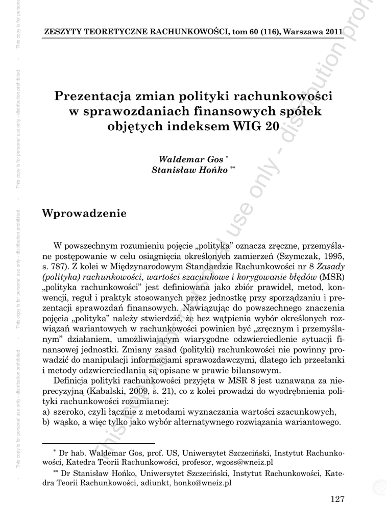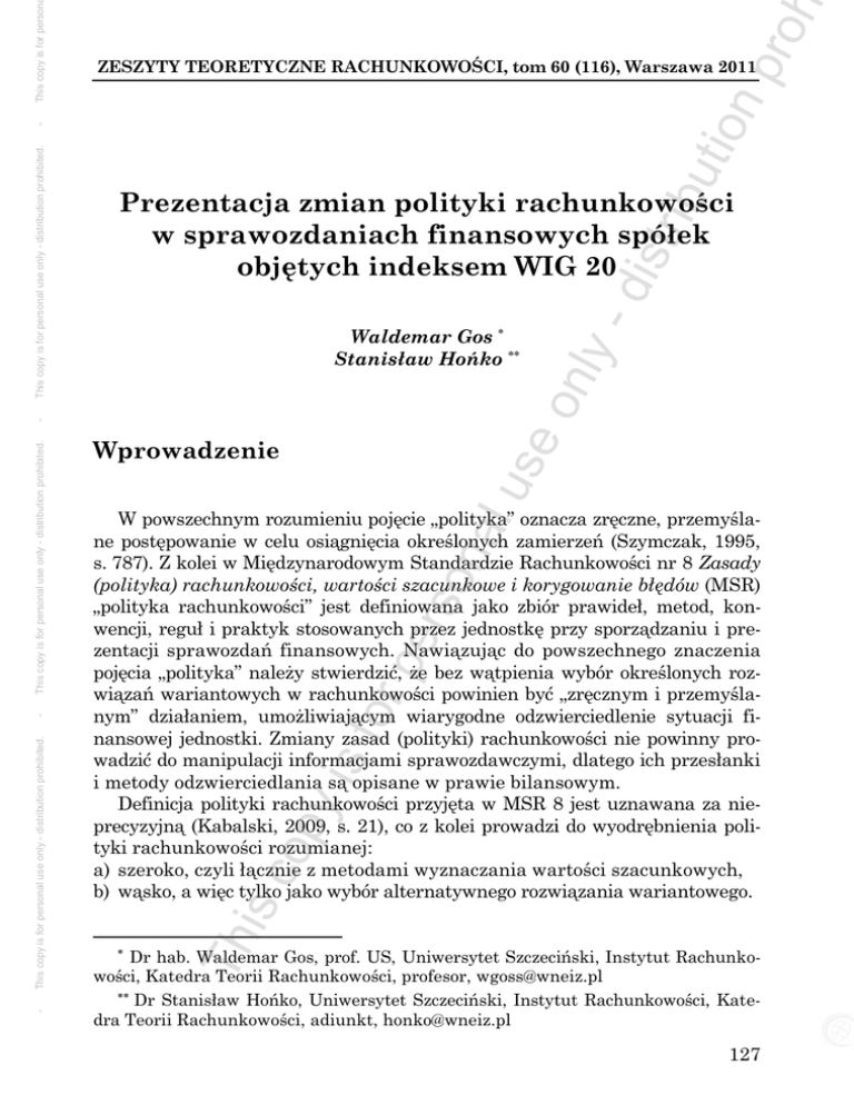 This copy is for person ibu tio np roh Waldemar Gos Stanisław Hońko se lu is c op y is for pe rso na W powszechnym rozumieniu pojęcie „polityka” oznacza zręczne, przemyślane postępowanie w celu osiągnięcia określonych zamierzeń (Szymczak, 1995, s. 787). Z kolei w Międzynarodowym Standardzie Rachunkowości nr 8 Zasady (polityka) rachunkowości, wartości szacunkowe i korygowanie błędów (MSR) „polityka rachunkowości” jest definiowana jako zbiór prawideł, metod, konwencji, reguł i praktyk stosowanych przez jednostkę przy sporządzaniu i prezentacji sprawozdań finansowych. Nawiązując do powszechnego znaczenia pojęcia „polityka” należy stwierdzić, że bez wątpienia wybór określonych rozwiązań wariantowych w rachunkowości powinien być „zręcznym i przemyślanym” działaniem, umożliwiającym wiarygodne odzwierciedlenie sytuacji finansowej jednostki. Zmiany zasad (polityki) rachunkowości nie powinny prowadzić do manipulacji informacjami sprawozdawczymi, dlatego ich przesłanki i metody odzwierciedlania są opisane w prawie bilansowym. Definicja polityki rachunkowości przyjęta w MSR 8 jest uznawana za nieprecyzyjną (Kabalski, 2009, s. 21), co z kolei prowadzi do wyodrębnienia polityki rachunkowości rozumianej: a) szeroko, czyli łącznie z metodami wyznaczania wartości szacunkowych, b) wąsko, a więc tylko jako wybór alternatywnego rozwiązania wariantowego. Th This copy is for personal use only - distribution prohibited. This copy is for personal use only - distribution prohibited. - Wprowadzenie on ly - dis tr Prezentacja zmian polityki rachunkowości w sprawozdaniach finansowych spółek objętych indeksem WIG 20 - This copy is for personal use only - distribution prohibited. - ZESZYTY TEORETYCZNE RACHUNKOWOŚCI, tom 60 (116), Warszawa 2011 Dr hab. Waldemar Gos, prof. US, Uniwersytet Szczeciński, Instytut Rachunkowości, Katedra Teorii Rachunkowości, profesor, [email protected] Dr Stanisław Hońko, Uniwersytet Szczeciński, Instytut Rachunkowości, Katedra Teorii Rachunkowości, adiunkt, [email protected] 127 ibu tio np roh dis tr on ly - se lu na rso pe for This copy is for person This copy is for personal use only - distribution prohibited. - is c op y is 1. Przesłanki modyfikacji zasad (polityki) rachunkowości oraz metody ich odzwierciedlania w sprawozdaniu finansowym Zasady (polityka) rachunkowości nie powinny być narzędziem gry kierownictwa, czy idąc dalej – manipulacji informacjami zawartymi w sprawozdaniu finansowym w celu wywarcia pożądanych wrażeń na interesariuszach. Modyfikacja przyjętych zasad następuje z zachowaniem nadrzędnych zasad rachunkowości, w tym głównie zasady ciągłości i istotności. Zasady te muszą być stosowane konsekwentnie w odniesieniu do takich samych transakcji, zdarzeń Th This copy is for personal use only - distribution prohibited. - This copy is for personal use only - distribution prohibited. Wąskie rozumienie zasad (polityki) rachunkowości skutkuje koniecznością rozróżnienia zmian tej polityki od zmian wartości szacunkowych. Zagadnienie jest istotne ze względu na odmienny sposób ujmowania zmian polityki rachunkowości i zmian wartości szacunkowych w sprawozdaniu finansowym. Konsekwencją obu zmian jest konieczność zagwarantowania porównywalności informacji sprawozdawczych w kolejnych okresach. W niniejszym artykule przedstawiono zakres zmian polityki rachunkowości i wartości szacunkowych wybranych spółek giełdowych. Przedmiotem analizy są skonsolidowane sprawozdania finansowe spółek objętych WIG 20 za 2009 r. Ze względu na najwyższą kapitalizację, spółki te można uznać za reprezentatywne dla polskiej gospodarki. Nie bez znaczenia jest fakt, że spółki uwzględniane w WIG 20 reprezentują różne sektory gospodarki, takie jak: bankowość, budownictwo, energetyka czy telewizja. Artykuł jest próbą odpowiedzi na pytanie o korelację między rodzajem działalności a kierunkami modyfikacji polityki rachunkowości. Autorzy nie dotarli do wyników podobnych badań prowadzonych w Polsce i za granicą. Sprawozdania finansowe wszystkich badanych jednostek zostały sporządzone zgodnie z Międzynarodowymi Standardami Sprawozdań Finansowych (MSR/MSSF). Od 1 stycznia 2009 r. obowiązuje szereg zmian w MSR/MSSF, które mogą wpływać na zasady (politykę) rachunkowości spółek zobligowanych do ich stosowania. Kolejną kwestią, interesującą autorów, było sprawdzenie, czy zmiany MSR/MSSF wpłynęły na zmianę zasad (polityki) rachunkowości analizowanych spółek. Celem artykułu jest ocena kierunków zmian zasad (polityki) rachunkowości, ze wskazaniem przesłanek modyfikacji. Autorzy poddają również ocenie sposób prezentacji zmian polityki rachunkowości i najważniejszych wartości szacunkowych oraz błędów w badanych sprawozdaniach finansowych. Analiza sprawozdań jest poprzedzona opisem przesłanek decydujących o modyfikacji polityki rachunkowości. 128 ibu tio np roh dis tr rso Przesłanki zmian polityki rachunkowości pe Przymusowe wynikające ze wynikające zmian dotychczaz wprowadzenia sowych wytycznych nowych wytycznych y is wprowadzane wtedy i tylko wtedy, gdy zastosowanie nowych zasad poprawi wiarygodność informacji sprawozdawczych Konsekwencje zmian są ujmowane retrospektywnie, w ten sposób, jakby przyjęte rozwiązania były stosowane we wcześniejszych okresach is c op uregulowane przez nieuregulowane zmienione (wpro- w przepisach przejwadzone) wytyczne ściowych zmienio(np. standardy) nych (wprowadzonych) wytycznych Dobrowolne Sposób ujęcia zmian polityki rachunkowości następuje według przepisów przejściowych Th This copy is for personal use only - distribution prohibited. - Ujęcie skutków zmian for This copy is for person This copy is for personal use only - distribution prohibited. - on ly - se lu na Rysunek 1. Typy zmian polityki rachunkowości - This copy is for personal use only - distribution prohibited