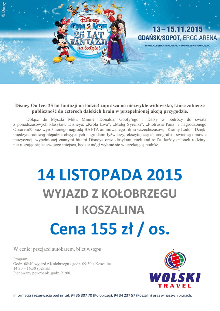 Disney On Ice: 25 lat fantazji na lodzie! zaprasza na niezwykłe widowisko, które zabierze publiczność do czterech dalekich krain w przepełnionej akcją przygodzie. Dołącz do Myszki Miki, Minnie, Donalda, Goofy’ego i Daisy w podróży do świata z ponadczasowych klasyków Disneya: „Króla Lwa”, „Małej Syrenki”, „Piotrusia Pana” i nagrodzonego Oscarem® oraz wyróżnionego nagrodą BAFTA animowanego filmu wszechczasów, „Krainy Lodu”. Dzięki międzynarodowej plejadzie obsypanych nagrodami łyżwiarzy, ekscytującej choreografii i świetnej oprawie muzycznej, wypełnionej znanymi hitami Disneya oraz klasykami rock-and-roll’a, każdy członek rodziny, nie ruszając się ze swojego miejsca, będzie mógł wybrać się w urzekającą podróż. 14 LISTOPADA 2015 WYJAZD Z KOŁOBRZEGU I KOSZALINA Cena 155 zł / os. W cenie: przejazd autokarem, bilet wstępu. Program: Godz. 08:40 wyjazd z Kołobrzegu / godz. 09:30 z Koszalina 14:30 – 16:30 spektakl Planowany powrót ok. godz. 21:00. Informacja i rezerwacja pod nr tel. 94 35 307 70 (Kołobrzeg), 94 34 237 57 (Koszalin) oraz w naszych biurach.