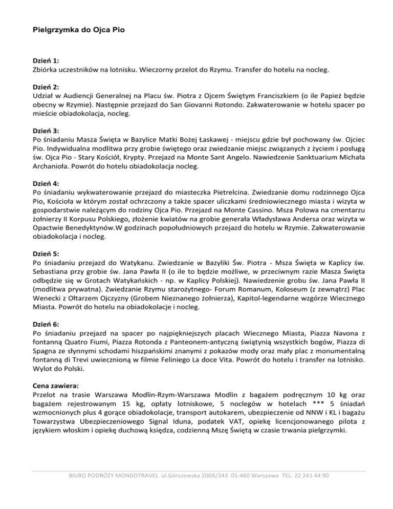 Pielgrzymka do Ojca Pio Dzień 1: Zbiórka uczestników na lotnisku. Wieczorny przelot do Rzymu. Transfer do hotelu na nocleg. Dzień 2: Udział w Audiencji Generalnej na Placu św. Piotra z Ojcem Świętym Franciszkiem (o ile Papież będzie obecny w Rzymie). Następnie przejazd do San Giovanni Rotondo. Zakwaterowanie w hotelu spacer po mieście obiadokolacja, nocleg. Dzień 3: Po śniadaniu Masza Święta w Bazylice Matki Bożej Łaskawej - miejscu gdzie był pochowany św. Ojciec Pio. Indywidualna modlitwa przy grobie świętego oraz zwiedzanie miejsc związanych z życiem i posługą św. Ojca Pio - Stary Kościół, Krypty. Przejazd na Monte Sant Angelo. Nawiedzenie Sanktuarium Michała Archanioła. Powrót do hotelu obiadokolacja nocleg. Dzień 4: Po śniadaniu wykwaterowanie przejazd do miasteczka Pietrelcina. Zwiedzanie domu rodzinnego Ojca Pio, Kościoła w którym został ochrzczony a także spacer uliczkami średniowiecznego miasta i wizyta w gospodarstwie należącym do rodziny Ojca Pio. Przejazd na Monte Cassino. Msza Polowa na cmentarzu żołnierzy II Korpusu Polskiego, złożenie kwiatów na grobie generała Władysława Andersa oraz wizyta w Opactwie Benedyktynów.W godzinach popołudniowych przejazd do hotelu w Rzymie. Zakwaterowanie obiadokolacja i nocleg. Dzień 5: Po śniadaniu przejazd do Watykanu. Zwiedzanie w Bazyliki Św. Piotra - Msza Święta w Kaplicy św. Sebastiana przy grobie św. Jana Pawła II (o ile to będzie możliwe, w przeciwnym razie Masza Święta odbędzie się w Grotach Watykańskich - np. w Kaplicy Polskiej). Nawiedzenie grobu św. Jana Pawła II (modlitwa prywatna). Zwiedzanie Rzymu starożytnego- Forum Romanum, Koloseum (z zewnątrz) Plac Wenecki z Ołtarzem Ojczyzny (Grobem Nieznanego żołnierza), Kapitol-legendarne wzgórze Wiecznego Miasta. Powrót do hotelu na obiadokolacje i nocleg. Dzień 6: Po śniadaniu przejazd na spacer po najpiękniejszych placach Wiecznego Miasta, Piazza Navona z fontanną Quatro Fiumi, Piazza Rotonda z Panteonem-antyczną świątynią wszystkich bogów, Piazza di Spagna ze słynnymi schodami hiszpańskimi znanymi z pokazów mody oraz mały plac z monumentalną fontanną di Trevi uwiecznioną w filmie Feliniego La doce Vita. Powrót do hotelu i transfer na lotnisko. Wylot do Polski. Cena zawiera: Przelot na trasie Warszawa Modlin-Rzym-Warszawa Modlin z bagażem podręcznym 10 kg oraz bagażem rejestrowanym 15 kg, opłaty lotniskowe, 5 noclegów w hotelach *** 5 śniadań wzmocnionych plus 4 gorące obiadokolacje, transport autokarem, ubezpieczenie od NNW i KL i bagażu Towarzystwa Ubezpieczeniowego Signal Iduna, podatek VAT, opiekę licencjonowanego pilota z językiem włoskim i opiekę duchową księdza, codzienną Mszę Świętą w czasie trwania pielgrzymki. BIURO PODRÓŻY MONDOTRAVEL ul.Górczewska 200A/243 01-460 Warszawa TEL: 22 241 44 90 Cena nie zawiera: Biletów wstępu do zwiedzanych obiektów, przewodników lokalnych, podatku miejskiego w Rzymie (4 Euro/noc), systemu nagłaśniającego dla grupy, biletów komunikacji miejskiej. Razem około 89 Euro płatne u pilota na miejscu. Uwagi: W pierwszym dniu przylot do Rzymu nastąpi w późnych godzinach wieczornych, przejazdy po Rzymie odbywają się komunikacją miejską, kolejność zwiedzania może ulec zmianie, spotkanie z pilotem nastąpi w porcie wylotu lub po przylocie do Rzymu, dopłata do pokoju jednoosobowego 400 PLN, napoje do obiadokolacji są dodatkowo płatne. Odprawa ON-LINE: w związku z wprowadzeniem przez linie lotnicze Ryanair oraz Wizzair obowiązkowej odprawy on-line i wysokimi karami związanymi z brakiem karty pokładowej, bardzo prosimy o zwrócenie szczególnej uwagi na dokładne wypełnianie formularza umowy-zgłoszenia. Dotyczy to w szczególności pełnego nazwiska (zgodnego z dokumentem z którym będą Państwo podróżować -dowód osobisty lub paszport), daty urodzenia, obywatelstwa oraz numeru i pełnej daty ważności w/w dokumentu. Ubezpieczenie: podczas imprezy turystycznej wszyscy uczestnicy są objęci ubezpieczeniem jakie zapewnia im Towarzystwo Ubezpieczeniowe Signal Iduna z siedzibą w Warszawie. Głównym pakietem, którym są objęte uczestniczące w wycieczce (pielgrzymce) osoby to pakiet podstawowy-STANDARD. W/w pakiet zawiera ubezpieczenie od kosztów leczenia (KL do 10.000 Euro), następstw nieszczęśliwych wypadków (NNW do 15.000 PLN), bagażu (do 1.000 PLN). Istnieje także możliwość skorzystania z opcji dodatkowego ubezpieczenia jest to tzw. ubezpieczenie STANDARD PLUS (jest to rozszerzenie pakietu podstawowego STANDARD). Ubezpieczenie STANDARD PLUS zawiera ubezpieczenie od kosztów leczenia (KL do 20.000 Euro), następstw nieszczęśliwych wypadków (NNW do 15.000 PLN), bagażu (do 1.000 PLN)-dopłata + 50 zł. Innym rodzajem ubezpieczenia, z którego może skorzystać uczestnik jest UBEZPIECZENIE KR. Jest to ubezpieczenie od kosztów rezygnacji z wycieczki (pielgrzymki)-dopłata + 3% wartości wycieczki a także UBEZPIECZENIE KRCHP. UBEZPIECZENIE KRCHP to ubezpieczenie od kosztów rezygnacji z wycieczki (pielgrzymki) dla osób przewlekle chorych -dopłata 7,5% wartości wycieczki. Bagaż: We wszystkich cenach podstawowych wliczony jest bagaż pod- ręczny o następujących parametrach WIZZAIR - bagaż podręczny o wymiarach 42x32x25cm, waga nieokreślona. RYANAIR - bagaż podręczny o wymiarach 55x40x20cm, waga do 10 kg. Za dopłatą można zakupić bagaż rejestrowany. Różnią się one parametrami w zależności od linii lotniczej - WIZZAIR - bagaż rejestrowany do 32kg - RYANAIR - bagaż rejestrowany do 15kg lub 20 kg Bagaż rejestrowany do 15 kg (Wrocław) 240 PLN/os Bagaż rejestrowany do 20 kg (Wrocław) 360PLN/os Bagaż rejestrowany do 32 kg (Gdańsk) 260 PLN/os Bagaż rejestrowany do 15 kg (Poznań, Warszawa) 240 PLN/os Bagaż rejestrowany do 20 kg (Poznań, Warszawa) 360 PLN/os Bagaż rejestrowany do 32 kg (Katowice) 260 PLN/os BIURO PODRÓŻY MONDOTRAVEL ul.Górczewska 200A/243 01-460 Warszaw
