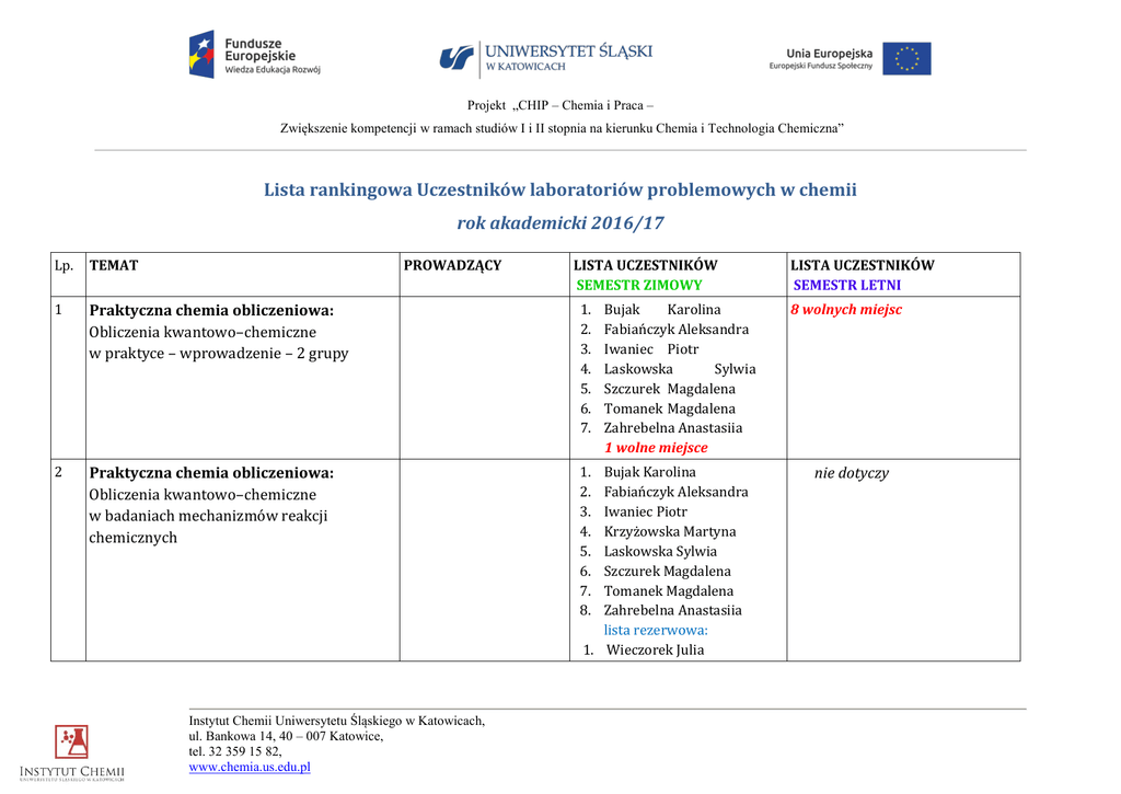 Projekt „CHIP – Chemia i Praca – Zwiększenie kompetencji w ramach studiów I i II stopnia na kierunku Chemia i Technologia Chemiczna” Lista rankingowa Uczestników laboratoriów problemowych w chemii rok akademicki 2016/17 Lp. TEMAT PROWADZĄCY 1 Praktyczna chemia obliczeniowa: Obliczenia kwantowo–chemiczne w praktyce – wprowadzenie – 2 grupy 1. 2. 3. 4. 5. 6. 7. 2 Praktyczna chemia obliczeniowa: Obliczenia kwantowo–chemiczne w badaniach mechanizmów reakcji chemicznych 1. 2. 3. 4. 5. 6. 7. 8. Instytut Chemii Uniwersytetu Śląskiego w Katowicach, ul. Bankowa 14, 40 – 007 Katowice, tel. 32 359 15 82, www.chemia.us.edu.pl LISTA UCZESTNIKÓW SEMESTR ZIMOWY Bujak Karolina Fabiańczyk Aleksandra Iwaniec Piotr Laskowska Sylwia Szczurek Magdalena Tomanek Magdalena Zahrebelna Anastasiia 1 wolne miejsce Bujak Karolina Fabiańczyk Aleksandra Iwaniec Piotr Krzyżowska Martyna Laskowska Sylwia Szczurek Magdalena Tomanek Magdalena Zahrebelna Anastasiia lista rezerwowa: 1. Wieczorek Julia LISTA UCZESTNIKÓW SEMESTR LETNI 8 wolnych miejsc nie dotyczy Projekt „CHIP – Chemia i Praca – Zwiększenie kompetencji w ramach studiów I i II stopnia na kierunku Chemia i Technologia Chemiczna” Lp. TEMAT PROWADZĄCY 3 Analiza i prezentacja danych: Elementy rachunku prawdopodobieństwa, statystyka opisowa i wizualizacja danych 1. 2. 3. 4. 5. 6. 7. 8. 9. 10. 11. 12. Babula Piotr Duda Sara Gnida Paweł Grabowiecka Dagmara Kubica Sylwia Łucka Justyna Pająk Agnieszka Rzyman Anna Trojankowska Anna Wieszołek Mirela Wojciech Marta Żaba Monika 1. 2. 3. 4. 5. 6. 4 Analiza i prezentacja danych: Statystyka matematyczna i wizualizacja danych 1. 2. 3. 4. 5. 6. 7. 8. 9. 10. 11. 12. Babula Piotr Duda Sara Fulczyk Agnieszka Gnida Paweł Iwaniec Piotr Jasiok Bernadeta Łata Eliza Pająk Agnieszka Rzyman Anna Skalik Karolina Zahrebelna Anastasiia Żaba Monika 1. Kowieska Katarzyna 2. Podgórska Aleksandra 3. Liberda Danuta 9 wolnych miejsc Instytut Chemii Uniwersytetu Śląskiego w Katowicach, ul. Bankowa 14, 40 – 007 Katowice, tel. 32 359 15 82, www.chemia.us.edu.pl LISTA UCZESTNIKÓW SEMESTR ZIMOWY LISTA UCZESTNIKÓW SEMESTR LETNI Górska Nikola Kowieska Katarzyna Liberda Danuta Walento Anna Walkowiak Michał Wieczorek Julia 6 wolnych miejsc Projekt „CHIP – Chemia i Praca – Zwiększenie kompetencji w ramach studiów I i II stopnia na kierunku Chemia i Technologia Chemiczna” Lp. TEMAT PROWADZĄCY 5 Bezpieczeństwo danych elektronicznych i systemów komputerowych 6 Elements of Scientific English for Chemistry Students: Oxidation and reduction mechanisms 7 Elements of Scientific English for Chemistry Students: Introduction to molecular spectroscopy LISTA UCZESTNIKÓW SEMESTR ZIMOWY 1. 2. 3. 4. 5. 6. 7. 8. 9. 10. 11. 12. Czyrwik Kinga Duda Sara Fulczyk Agnieszka Grabowiecka Dagmara Iwaniec Piotr Łata Eliza Pająk Agnieszka Piernik Mariola Rzyman Anna Synoradzki Wojciech Trojankowska Anna Żaba Monika 1. 2. 3. 4. 5. 6. Babula Piotr Duda Sara Gnida Paweł Iwaniec Piotr Pająk Agnieszka Zahrebelna Anastasiia lista rezerwowa: 1. Żaba Monika 2. Rzyman Anna zajęcia nie będą realizowane Instytut Chemii Uniwersytetu Śląskiego w Katowicach, ul. Bankowa 14, 40 – 007 Katowice, tel. 32 359 15 82, www.chemia.us.edu.pl LISTA UCZESTNIKÓW SEMESTR LETNI 1. 2. 3. 4. 5. Dybał Paulina Górska Nikola Walkowiak Michał Wieszołek Mirela Wojciech Marta 7 wolnych miejsc Projekt „CHIP – Chemia i Praca – Zwiększenie kompetencji w ramach studiów I i II stopnia na kierunku Chemia i Technologia Chemiczna” Lp. TEMAT PROWADZĄCY 8 Elements of Scientific English for Chemistry Students: Biologically active compounds for potential use as antifungal agents Elements of Scientific English for Chemistry Students: Potential anticancer drugs Instytut Chemii Uniwersytetu Śląskiego w Katowicach, ul. Bankowa 14, 40 – 007 Katowice, tel. 32 359 15 82, www.chemia.us.edu.pl LISTA UCZESTNIKÓW SEMESTR ZIMOWY LISTA UCZESTNIKÓW SEMESTR LETNI 1. 2. 3. 4. 5. 6. Fulczyk Agnieszka Górska Nikola Nawrot Daria Walento Anna Walkowiak Michał Zahrebelna Anastasiia lista rezerwowa: 1. Dybał Paulina 2. Łata Eliza 3. Walczak Karolina 1. 2. 3. 4. 5. 6. Fulczyk Agnieszka Grabowiecka Dagmara Matuszewski Paweł Wieszołek Mirela Wojciech Marta Zahrebelna Anastasiia lista rezerwowa: 1. Łucka Justyna 2. Łata Eliza 3. Liberda Danuta 4. Podgórska Aleksandra 5. Kowieska Katarzyna Projekt „CHIP – Chemia i Praca – Zwiększenie kompetencji w ramach studiów I i II stopnia na kierunku Chemia i Technologia Chemiczna” Lp. TEMAT PROWADZĄCY LISTA UCZESTNIKÓW SEMESTR ZIMOWY LISTA UCZESTNIKÓW SEMESTR LETNI zajęcia nie będa Chemistry in English: Redox properties of non-innocent ligands in realizowane coordination and organometallic chemistry, and in switchable molecular materials Chemistry in English: General and Inorganic Chemistry Praktyczne zajęcia u pracodawcy: Innowacyjne procesy biooczyszczania powietrza z lotnych związków organicznych (LZO) i odorów w Kompaktowych Bioreaktorach Trójfazowych 1. Iwaniec Piotr 2. Wieczorek Julia 3. Zahrebelna Anastasiia 2 wolne miejsca 1. 2. 3. 4. 5. 1. 2. 3. 4. 5. 6. 7. Instytut Chemii Uniwersytetu Śląskiego w Katowicach, ul. Bankowa 14, 40 – 007 Katowice, tel. 32 359 15 82, www.chemia.us.edu.pl Duda Sara Iwaniec Piotr Pająk Agnieszka Walkowiak Michał Zahrebelna Anastasiia lista rezerwowa: Górska Nikola Wojciech Marta Żaba Monika Synoradzki Wojciech Łucka Justyna Rzyman Anna Piernik Mariola Projekt „CHIP – Chemia i Praca – Zwiększenie kompetencji w ramach studiów I i II stopnia na kierunku Chemia i Technologia Chemiczna” Lp. TEMAT PROWADZĄCY LISTA UCZESTNIKÓW SEMESTR ZIMOWY Praktyczne zajęcia u pracodawcy: Analiza wielopierwiastkowa próbek środowiskowych i rzeczywistych Praktyczne zajęcia u pracodawcy: Metody wyosabniania oraz analiza materiału dowodowego i materiału biologicznego za pomocą testów ELISA oraz metod Instytut Chemii Uniwersytetu Śląskiego w K
