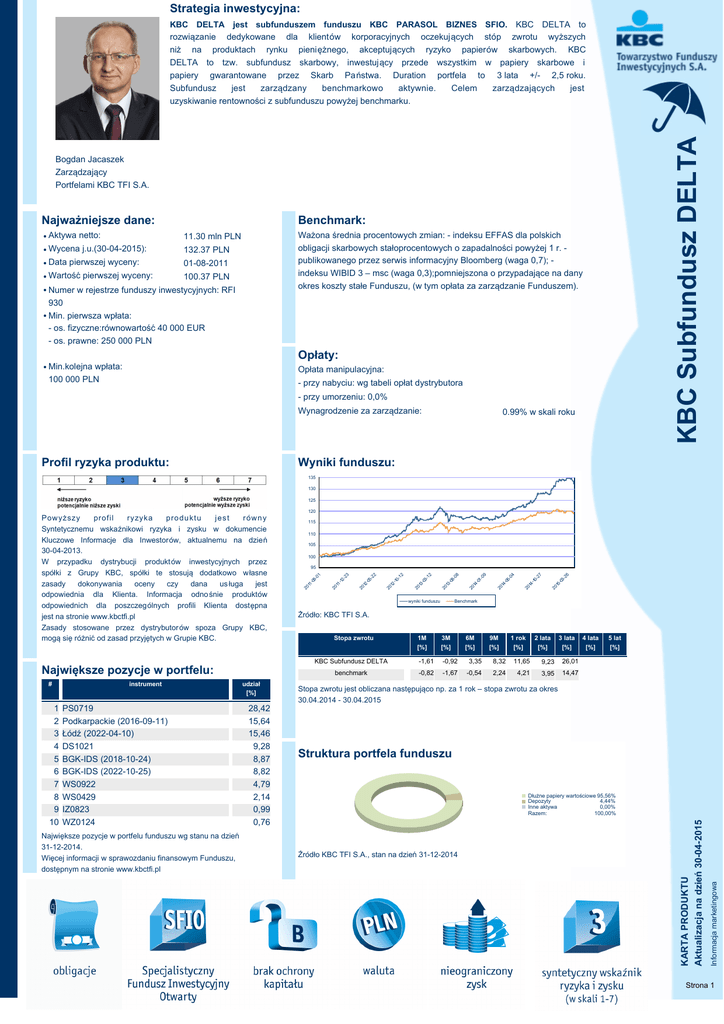 Strategia inwestycyjna: KBC DELTA to rozwiązanie dedykowane dla klientów korporacyjnych oczekujących stóp zwrotu wyższych niż na produktach rynku pieniężnego, akceptujących ryzyko papierów skarbowych. KBC DELTA to tzw. subfundusz skarbowy, inwestujący przede wszystkim w papiery skarbowe i papiery gwarantowane przez Skarb Państwa. Duration portfela to 3 lata +/- 2,5 roku. Subfundusz jest zarządzany benchmarkowo aktywnie. Celem zarządzających jest uzyskiwanie rentowności z subfunduszu powyżej benchmarku. KBC Subfundusz DELTA KBC DELTA jest subfunduszem funduszu KBC PARASOL BIZNES SFIO. Bogdan Jacaszek Zarządzający Portfelami KBC TFI S.A. Najważniejsze dane: Benchmark: 11.30 mln PLN • Aktywa netto: 132.37 PLN • Wycena j.u.(30-04-2015): 01-08-2011 • Data pierwszej wyceny: 100.37 PLN • Wartość pierwszej wyceny: • Numer w rejestrze funduszy inwestycyjnych: RFI Ważona średnia procentowych zmian: - indeksu EFFAS dla polskich obligacji skarbowych stałoprocentowych o zapadalności powyżej 1 r. publikowanego przez serwis informacyjny Bloomberg (waga 0,7); indeksu WIBID 3 – msc (waga 0,3);pomniejszona o przypadające na dany okres koszty stałe Funduszu, (w tym opłata za zarządzanie Funduszem). 930 • Min. pierwsza wpłata: - os. fizyczne:równowartość 40 000 EUR - os. prawne: 250 000 PLN Opłaty: • Min.kolejna wpłata: Opłata manipulacyjna: 100 000 PLN - przy nabyciu: wg tabeli opłat dystrybutora - przy umorzeniu: 0,0% Wynagrodzenie za zarządzanie: Profil ryzyka produktu: 0.99% w skali roku Wyniki funduszu: 135 130 125 1 2 3 4 5 6 7 8 9 10 instrument PS0719 Podkarpackie (2016-09-11) Łódź (2022-04-10) DS1021 BGK-IDS (2018-10-24) BGK-IDS (2022-10-25) WS0922 WS0429 IZ0823 WZ0124 Największe pozycje w portfelu funduszu wg stanu na dzień 31-12-2014. Więcej informacji w sprawozdaniu finansowym Funduszu, dostępnym na stronie www.kbctfi.pl udział [%] 28,42 15,64 15,46 9,28 8,87 8,82 4,79 2,14 0,99 0,76 110 105 100 26 03 - 27 20 15 - 10 - 04 20 14 - 06 - 09 20 14 - 01 - 08 wyniki funduszu 20 14 - 08 - 12 20 13 - 12 03 20 13 - 10 - 22 20 12 - 23 05 20 12 - 12 20 11 - 08 - 01 95 Benchmark Żródło: KBC TFI S.A. Stopa zwrotu 1M [%] 3M [%] 6M [%] 9M [%] 1 rok [%] 2 lata [%] 3 lata [%] KBC Subfundusz DELTA -1,61 -0,92 3,35 8,32 11,65 9,23 26,01 benchmark -0,82 -1,67 -0,54 2,24 4,21 3,95 14,47 4 lata [%] 5 lat [%] Stopa zwrotu jest obliczana następująco np. za 1 rok – stopa zwrotu za okres 30.04.2014 - 30.04.2015 Struktura portfela funduszu Dłużne papiery wartościowe 95,56% Depozyty 4,44% Inne aktywa 0,00% Razem: 100,00% Źródło KBC TFI S.A., stan na dzień 31-12-2014 Informacja marketingowa # 115 KARTA PRODUKTU Aktualizacja na dzień 30-04-2015 Największe pozycje w portfelu: 120 20 11 - Powyższy profil ryzyka pr o d u k t u jest równy Syntetycznemu wskaźnikowi ryzyka i zysku w dokumencie Kluczowe Informacje dla Inwestorów, aktualnemu na dzień 30-04-2013. W przypadku dystrybucji produkt ów inwestycyjnych przez spółki z Grupy KBC, spółki te stosują dodatkowo własne zasady dokonywania oceny czy dana us ługa jest odpowiednia dla Klienta. Informacja odno śnie produktów odpowiednich dla poszczególnych profili Klienta dostępna jest na stronie www.kbctfi.pl Zasady stosowane przez dystrybutor ów spoza Grupy KBC, mogą się różnić od zasad przyjętych w Grupie KBC. Strona 1 KBC Towarzystwo Funduszy Inwestycyjnych S.A. Informacje podstawowe: Siedziba: ul. Chmielna 85/87, 00-805 Warszawa Kontakt: [email protected]; infolinia: (22) 582 88 58 Aktywa w zarządzaniu: 4,024 mld PLN (stan na 31.12.2014) Data powstania: 20.04.2005 r.; połączenie WARTA TFI S.A., WARTA AM S.A., TFI KB S.A., KB ZA S.A. Zezwolenie Komisji Nadzoru Finansowego z dn. 14.05.2002, decyzja nr DFN1 - 4030–23-1/02-1452 Gdzie kupić fundusze KBC TFI? informacja na www.kbctfi.pl Komentarz analityka: Kwiecień przyniósł kontynuację niekorzystnej tendencji na rynku d ługu z dwóch wcześniejszych miesięcy. Dobre dane z naszej gospodarki w połączeniu z psującym się klimatem na rynkach światowych spowodowały wzrost rentowności na całej długości krzywej. W przypadku 10-latek wyniosła ona 2,63% na koniec kwietnia wobec 2,31%na koniec marca. Na krajowym podwórku inwestorzy pozostawali pod wrażeniem korzystnych danych z polskiej gospodarki. Pomimo obni żenia się zarówno w marcu, jak kwietniu, wskaźnika PMI, obrazującego aktywność w przemyśle, pozostawał on na wysokim poziomie (54 pkt w kwietniu). Twarde dane gospodarcze wypadały zaskakująco dobrze. Produkcja przemysłowa zwiększyła się w marcu o 8,8% w skali roku (po odsezonowaniu o 6%). Sprzedaż detaliczna była wyższa o 3% w porównaniu z tym samym miesiącem 2014 r. Wynagrodzenia zwiększyły się aż o 4,9%, a zatrudnienie o 1,1%, co przy wciąż wyraźnej deflacji (1,5% w kwietniu) zapewnia solidny wzrost funduszu płac, od którego zależą wydatki gospodarstw domowych. Sygnalne dane GUS o koniunkturze gospodarczej w kwietniu, czy wska źniki zaufania konsumentów pokazują, że również w kwietniu w gospodarce panował optymizm. Nastroje na krajowym rynku psuły też wydarzenia na świecie, gdzie coraz wyraźniej zauważalna stawała się korekta cen paliw. Trzeba przypomnie ć, że taniejąca W zasadzie do stycznia ropa naftowa przyczyniała się w bardzo dużym stopniu do osiągania przez rentowność obligacji skarbowych w wielu miejscach na świecie, rekordowo niskich poziomów. Polski rynek też na tym korzystał. Odwrócenie się tendencji na rynku paliw w naturalny sposób skłaniało do realizowania zysków na rynku długu. Tym bardziej, że na świecie towarzyszy nam wciąż duża skłonność do ryzyka, której przejawem są rekordy wszech czasów na globalnym rynku akcji. KBC Subfundusz DELTA Akcjonariusz: 100% KBC Asset Management WAŻNE INFORMACJE: Informacja marketingowa KBC Towarzystwo Funduszy Inwestycyjnych Spółka Akcyjna wpisana przez Sąd Rejonowy dla m.st. Warszawy d