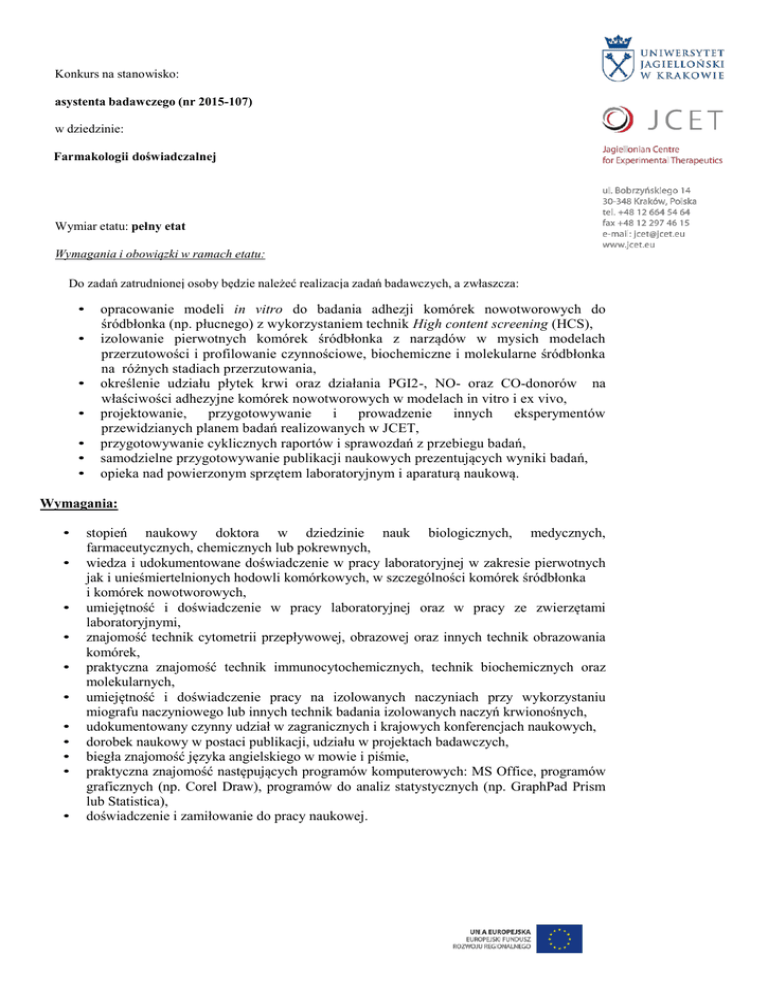 Konkurs na stanowisko: asystenta badawczego (nr 2015-107) w dziedzinie: Farmakologii doświadczalnej Wymiar etatu: pełny etat Wymagania i obowiązki w ramach etatu: Do zadań zatrudnionej osoby będzie należeć realizacja zadań badawczych, a zwłaszcza: • • • • • • • opracowanie modeli in vitro do badania adhezji komórek nowotworowych do śródbłonka (np. płucnego) z wykorzystaniem technik High content screening (HCS), izolowanie pierwotnych komórek śródbłonka z narządów w mysich modelach przerzutowości i profilowanie czynnościowe, biochemiczne i molekularne śródbłonka na różnych stadiach przerzutowania, określenie udziału płytek krwi oraz działania PGI2-, NO- oraz CO-donorów na właściwości adhezyjne komórek nowotworowych w modelach in vitro i ex vivo, projektowanie, przygotowywanie i prowadzenie innych eksperymentów przewidzianych planem badań realizowanych w JCET, przygotowywanie cyklicznych raportów i sprawozdań z przebiegu badań, samodzielne przygotowywanie publikacji naukowych prezentujących wyniki badań, opieka nad powierzonym sprzętem laboratoryjnym i aparaturą naukową. Wymagania: • • • • • • • • • • • stopień naukowy doktora w dziedzinie nauk biologicznych, medycznych, farmaceutycznych, chemicznych lub pokrewnych, wiedza i udokumentowane doświadczenie w pracy laboratoryjnej w zakresie pierwotnych jak i unieśmiertelnionych hodowli komórkowych, w szczególności komórek śródbłonka i komórek nowotworowych, umiejętność i doświadczenie w pracy laboratoryjnej oraz w pracy ze zwierzętami laboratoryjnymi, znajomość technik cytometrii przepływowej, obrazowej oraz innych technik obrazowania komórek, praktyczna znajomość technik immunocytochemicznych, technik biochemicznych oraz molekularnych, umiejętność i doświadczenie pracy na izolowanych naczyniach przy wykorzystaniu miografu naczyniowego lub innych technik badania izolowanych naczyń krwionośnych, udokumentowany czynny udział w zagranicznych i krajowych konferencjach naukowych, dorobek naukowy w postaci publikacji, udziału w projektach badawczych, biegła znajomość języka angielskiego w mowie i piśmie, praktyczna znajomość następujących programów komputerowych: MS Office, programów graficznych (np. Corel Draw), programów do analiz statystycznych (np. GraphPad Prism lub Statistica), doświadczenie i zamiłowanie do pracy naukowej.