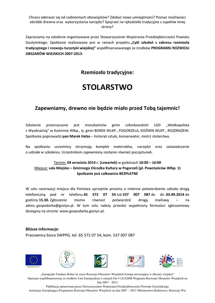 Chcesz oderwać się od codziennych obowiązków? Zdobyć nowe umiejętności? Poznać możliwości obróbki drewna oraz wykorzystania narzędzi? Spojrzeć na rękodzieło tradycyjne z zupełnie innej strony? Zapraszamy na szkolenie organizowane przez Stowarzyszenie Wspierania Przedsiębiorczości Powiatu Gostyńskiego. Spotkanie realizowane jest w ramach projektu „Cykl szkoleń z zakresu rzemiosła tradycyjnego i rozwoju turystyki wiejskiej” współfinansowanego ze środków PROGRAMU ROZWOJU OBSZARÓW WIEJSKICH 2007-2013: Rzemiosło tradycyjne: STOLARSTWO Zapewniamy, drewno nie będzie miało przed Tobą tajemnic! Szkolenie przeznaczone jest mieszkańców gmin członkowskich LGD „Wielkopolska z Wyobraźnią” w Koźminie Wlkp., tj. gmin BOREK WLKP., POGORZELA, KOŹMIN WLKP., ROZDRAŻEW. Spotkanie poprowadzi pan Marek Hałas – historyk sztuki, konserwator, mistrz stolarstwa. Na spotkaniu uczestnicy otrzymają komplet materiałów, narzędzi oraz o udziale w szkoleniu. Uczestnikom zapewniony zostanie również poczęstunek. zaświadczenie Termin: 04 września 2014 r. (czwartek) w godzinach 10:00 – 16:00 Miejsce: sala Miejsko – Gminnego Ośrodka Kultury w Pogorzeli (pl. Powstańców Wlkp. 1) Spotkanie jest całkowicie BEZPŁATNE W celu rezerwacji miejsca dla Państwa uprzejmie prosimy o imienne potwierdzenie udziału drogą telefoniczną pod nr telefonu 65 572 07 54 lub 537 007 087 do dn. 03.09.2014 do godziny 15.30. Zgłoszenie można również potwierdzić drogą mailową – na adres: [email protected]. W tym celu należy przesłać wypełniony formularz zgłoszeniowy dostępny na stronie: www.gospodarka.gostyn.pl. Bliższe informacje: Pracownicy biura SWPPG, tel. 65 572 07 54, kom. 537 007 087 „Europejski Fundusz Rolny na rzecz Rozwoju Obszarów Wiejskich Europa inwestująca w obszary wiejskie” Operacja współfinansowana ze środków Unii Europejskiej w ramach Osi 4 LEADER Programu Rozwoju Obszarów Wiejskich na lata 2007 – 2013 Publikacja opracowana przez Stowarzyszenie Wspierania Przedsiębiorczości Powiatu Gostyńskiego Instytucja Zarządzająca Programem Rozwoju Obszarów Wiejskich na lata 2007 – 2013 Ministerstwo Rolnictwa i Rozwoju Wsi