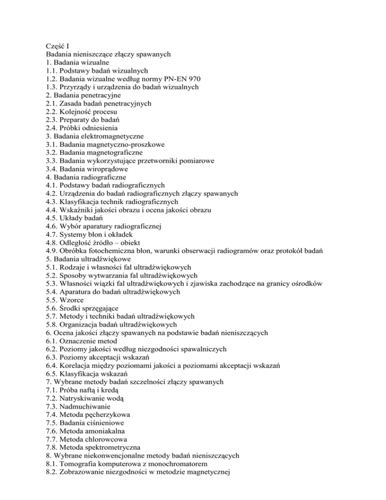 Część I Badania nieniszczące złączy spawanych 1. Badania wizualne 1.1. Podstawy badań wizualnych 1.2. Badania wizualne według normy PN-EN 970 1.3. Przyrządy i urządzenia do badań wizualnych 2. Badania penetracyjne 2.1. Zasada badań penetracyjnych 2.2. Kolejność procesu 2.3. Preparaty do badań 2.4. Próbki odniesienia 3. Badania elektromagnetyczne 3.1. Badania magnetyczno-proszkowe 3.2. Badania magnetograficzne 3.3. Badania wykorzystujące przetworniki pomiarowe 3.4. Badania wiroprądowe 4. Badania radiograficzne 4.1. Podstawy badań radiograficznych 4.2. Urządzenia do badań radiograficznych złączy spawanych 4.3. Klasyfikacja technik radiograficznych 4.4. Wskaźniki jakości obrazu i ocena jakości obrazu 4.5. Układy badań 4.6. Wybór aparatury radiograficznej 4.7. Systemy błon i okładek 4.8. Odległość źródło – obiekt 4.9. Obróbka fotochemiczna błon, warunki obserwacji radiogramów oraz protokół badań 5. Badania ultradźwiękowe 5.1. Rodzaje i własności fal ultradźwiękowych 5.2. Sposoby wytwarzania fal ultradźwiękowych 5.3. Własności wiązki fal ultradźwiękowych i zjawiska zachodzące na granicy ośrodków 5.4. Aparatura do badań ultradźwiękowych 5.5. Wzorce 5.6. Środki sprzęgające 5.7. Metody i techniki badań ultradźwiękowych 5.8. Organizacja badań ultradźwiękowych 6. Ocena jakości złączy spawanych na podstawie badań nieniszczących 6.1. Oznaczenie metod 6.2. Poziomy jakości według niezgodności spawalniczych 6.3. Poziomy akceptacji wskazań 6.4. Korelacja między poziomami jakości a poziomami akceptacji wskazań 6.5. Klasyfikacja wskazań 7. Wybrane metody badań szczelności złączy spawanych 7.1. Próba naftą i kredą 7.2. Natryskiwanie wodą 7.3. Nadmuchiwanie 7.4. Metoda pęcherzykowa 7.5. Badania ciśnieniowe 7.6. Metoda amoniakalna 7.7. Metoda chlorowcowa 7.8. Metoda spektrometryczna 8. Wybrane niekonwencjonalne metody badań nieniszczących 8.1. Tomografia komputerowa z monochromatorem 8.2. Zobrazowanie niezgodności w metodzie magnetycznej 8.4. Metoda magnetycznej pamięci metalu 8.5. Jądrowy rezonans magnetyczny 8.6. Elektronowy rezonans paramagnetyczny 8.7. Termowizja Wykaz wykorzystanych norm Literatura Część II Badania niszczące złączy metalowych 1. Wprowadzenie 2. Badania własności mechanicznych 3. Statyczna próba rozciągania materiałów, stopiw i spoin 4. Statyczna próba poprzecznego rozciągania doczołowych złączy spawanych 5. Statyczna próba rozciągania złączy spawanych krzyżowych i zakładkowych 6. Statyczna próba zginania złączy spawanych 7. Statyczna próba łamania złączy spawanych 8. Dynamiczna próba łamania złączy spawanych 9. Dynamiczna próba udarności materiałów i złączy spawanych 9.1. Dynamiczne próby udarności w niskiej lub podwyższonej temperaturze 10. Badania zmęczeniowe materiałów i złączy spawanych 11. Długotrwałe próby pełzania materiałów 12. Badanie twardości materiałów i złączy spajanych 12.1. Wprowadzenie 12.2. Pomiar twardości metodą Brinella 12.3. Pomiar twardości metodą Rockwella 12.4. Pomiar twardości metodą Vickersa 15.2. Próby makrotwardości złączy spawanych łukowo 12.6. Pomiary mikrotwardości złączy spajanych 12.7. Kryteria oceny pomiarów twardości złączy spajanych 13. Badania metalograficzne – makroskopowe i mikroskopowe – metalowych złączy spajanych 14. Próby badania wrażliwości na spajanie materiałów i spoiw stosowanych na spajane konstrukcje 14.1. Wprowadzenie 14.2. Badanie skłonności stali do powstawania pęknięć kruchych 14.3. Badanie skłonności stali do powstawania pęknięć zimnych 14.3.1. Wprowadzenie 14.3.2. Próba kołkowa (próba implant) 14.3.3. Próba Tekken (próba Lehigh) 14.3.4. Próba regulowanej ostrości cieplnej CTS 14.3.5. Próba krzyżowa 14.4. Badanie skłonności stali i spoiw do powstawania pęknięć gorących 14.4.1. Wprowadzenie 14.4.2. Próba teowa ze spoiną pachwinową 14.4.3. Próba rozciągania metalu spoiny 14.4.4. Próba wzdłużnego zginania 14.5. Badanie skłonności stali do powstawania pęknięć lamelarnych 14.6. Badanie skłonność stali i spoiw do powstawania pęknięć wyżarzeniowych Literatura Wykaz wykorzystanych norm