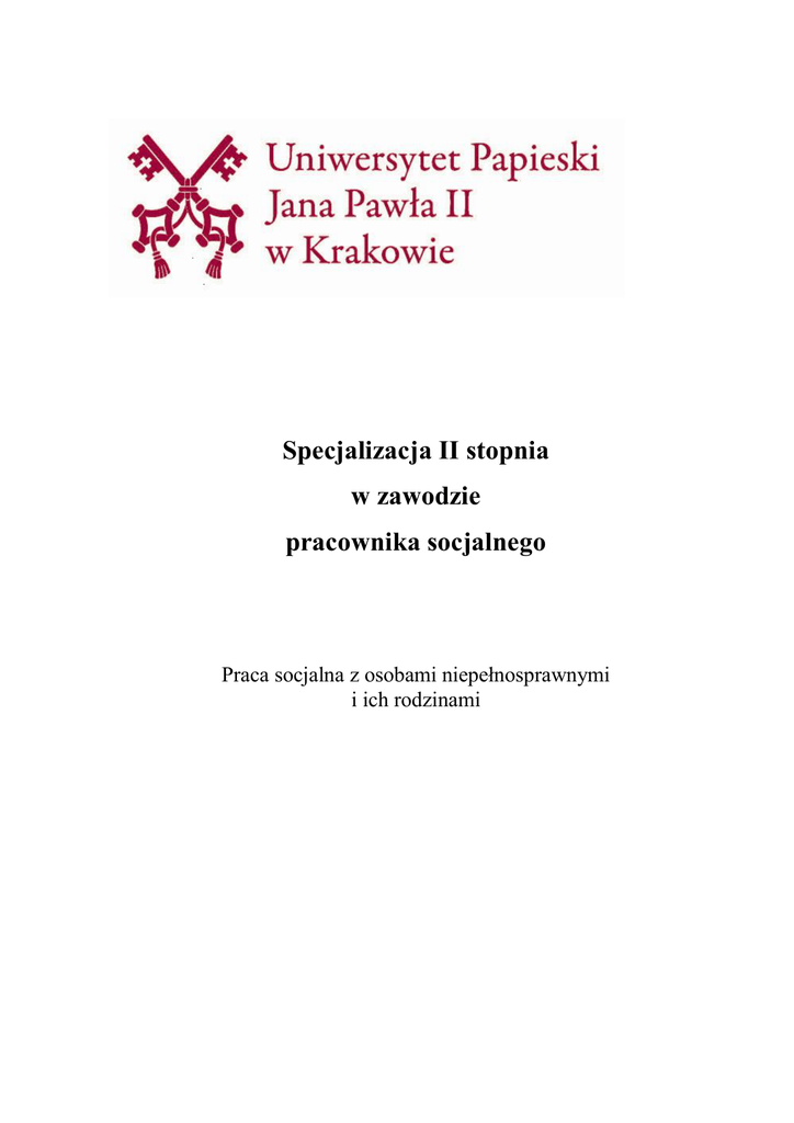 Specjalizacja II stopnia w zawodzie pracownika socjalnego Praca socjalna z osobami niepełnosprawnymi i ich rodzinami Nazwa podmiotu: Uniwersytet Papieski Jana Pawła II w Krakowie Wydział Nauk Społecznych Instytut Pracy Socjalnej Dane teleadresowe: Rektorat – ul. Kanonicza 25, 31-002 Kraków e-mail: [email protected] phone: 12-421-84-16 Instytut Pracy Socjalnej ul. Kanonicza 18, 31-002 Kraków e-mail: [email protected] phone: 12-422-21-21 Osoba odpowiedzialna: mgr Katarzyna Kutek-Sładek e-mail: [email protected] Program szkolenia w zakresie przygotowania podstawowego MODUŁ 1 A Projekt socjalny – 40 godzin I. ZAŁOŻENIA DO REALIZACJI MODUŁU Uczestnicy szkolenia zapoznają się z metodologią tworzenia projektu socjalnego oraz nabędą umiejętności jego opracowania i realizacji, jako narzędzia stosowanego w pracy socjalnej. Ważnym elementem skutecznej pracy socjalnej jest umiejętność formułowania adekwatnych celów w oparciu o diagnozę problemów społecznych oraz koordynacja i realizacja zaplanowanych działań wraz z ewaluacją i oceną uzyskania założonych efektów. II. EFEKTY KSZTAŁCENIA WIEDZA W_01 Zna podstawowe pojęcia z zakresu metodologii badań społecznych. W_02 Posiada wiedzę o funkcjonowaniu mikro, mezzo i makrostruktur społecznych. W_03 Posiada wiedzę o roli różnych instytucji i organizacji w realizacji zadań pomocy społecznej oraz możliwości współdziałania z nimi. W_04 Zna czynniki wspomagające i ograniczające jakość społecznego funkcjonowania jednostek, grup, środowisk. W_05 Posiada wiedzę o znaczeniu zasobów tkwiących w jednostkach, grupach i społecznościach oraz uwzględnia je w podejmowanych działaniach socjalnych. W_06 Zna metodologię i zasady tworzenia projektu socjalnego. W_07 Zna zasady opracowania dokumentacji realizowanego projektu socjalnego. UMIEJĘTNOŚCI U_01 Wykorzystuje wiedzę teoretyczną do szukania rozwiązań i dokonuje wyborów optymalnych dla rozwiązania problemów społecznych określonych w projekcie socjalnym. U_02 Posiada umiejętność sformułowania diagnozy społecznej i wykorzystania jej w przekształcaniu rzeczywistości społecznej. U_03 Posiada umiejętność uruchamiania możliwości jednostek, grup i środowisk oraz pozyskiwania ich do współpracy. U_04 Posiada umiejętność działania planowego i systematycznego w oparciu o opracowane programy pomocy społecznej. U_05 Posiada umiejętność projektowania działań nastawionych na zmianę. U_06 Posiada umiejętność realizacji projektu. U_07 Umie dostrzec i zastosować optymalne rozwiązania w projekcie socjalnym. U_08 Posiada umiejętność wyboru optymalnych rozwiązań problemów społecznych określonych w projekcie socjalnym. U_09 Umie dokonać monitorowania i ewaluacji zrealizowanych przedsięwzięć. U_10 Posiada umiejętność opracowania dokumentacji realizacji projektu socjalnego formułując wnioski uniwersalne i postulatywne. U_11 Wykorzystuje w praktyce zawodowej różne metody pracy socjalnej oraz zasady monitorowania i ewaluacji. U_12 Posiada umiejętności organizacyjne i koordynacyjne KOMPETENCJE SPOŁECZNE III. K_01 Potrafi nawiązać kontakt z różnymi grupami klientów, instytucjami i społecznościami. K_02 Jest przygotowany do interpretowania mechanizmów funkcjonowania człowieka w różnych sytuacjach społecznych. K_03 Potrafi stworzyć sieć usług socjalnych współpracując z różnymi instytucjami, organizacjami i specjalistami funkcjonującymi w społeczności lokalnej. K_04 Ma poczucie odpowiedzialności za pracę własną i zespołu. K_05 Potrafi zastosować posiadaną wiedzę w działaniu. METODY DYDAKTYCZNE 1. Wykład, ćwiczenia IV. PODSTAWOWE ŚRODKI DYDAKTYCZNE 1. Komputer, projektor, prezentacje multimedialne. 2. Materiały szkoleniowe. V. TREŚCI KSZTAŁCENIA ZE WSKAZANIEM FORMY REALIZACJI Projekt socjalny Lp. VI. Tematyka zajęć 1. Tok postępowania projektującego 2. Poszukiwanie mocnych stron klienta i zasobów środowiska jako główne podejście do tworzenia projektu 3. Metody, techniki i narzędzia stosowane podczas realizacji projektu socjalnego 4. Znaczenie i konstrukcja budżetu związanego z projektem socjalnym 5. Rola i znaczenie działalności wolontariuszy biorących udział w realizacji projektu 6. Monitorowanie i ocena projektu 7. Zarządzanie projektem socjalnym KADRA DYDAKTYCZNA mgr Joanna Dyrcz mgr Józefa Kucharska MODUŁ: 1 B Mediacje i negocjacje – 20 godzin I. ZAŁOŻENIA DO REALIZACJI MODUŁU Celem szkolenia jest zapoznanie uczestników z psychologią powstawania sytuacji konfliktowych, zasadami, organizacją oraz przebiegiem procesu mediacji i negocjacji, stosowanych strategii oraz technik oraz doskonalenie i praktyczne ćwiczenie umiejętności mediacyjnych i negocjacyjnych. II. EFEKTY KSZTAŁCENIA WIEDZA W_01 Posiada wiedzę o konfliktach, ich źródłach i możliwych sposobach ich rozwiązywania w drodze negocjacji i mediacji. W_02 Posiada wiedzę o istocie, typach i fazach negocjacji. W_03 Posiada wiedzę o warunkach skutecznego rozwiązywania sporów. W_04 Posiada wiedzę na temat stylów negocjacyjnych oraz zna narzędzia skutecznych negocjacji. W_05 Zna techniki wywierania wpływu na ludzi. W_06 Posiada wiedzę na temat różnic pomiędzy wpływem, władzą a manipulacją. W_07 Posiada wiedzę na temat mediacji i jej praktycznego zastosowania. W_08 Zna uregulowania prawne dotyczące mediacji. W_09 Posiada wiedzę na temat zasad prowadzenia postępowania mediacyjnego. W_10 Posiada wiedzę na temat mediacji rodzinnych, w tym specyfiki sporów rodzinnych. W_11 Posiada wiedzę o zasadach sporządzania kontraktów. W_12 Zna zasady oceny realizacji kontraktu i renegocjacji kontraktu socjalnego. W_13 Posiada wiedzę o znaczeniu etyki w negocjacjach i mediacjach. UMIEJĘTNOŚCI U_01 Posiada umiejętność oceny sytuacji konfliktowej i znajdowania adekwatnych rozwiązań. U_02 Potrafi negocjować i pełnić rolę mediatora. U_03 Potrafi zastosować w praktyce zawodowej stra