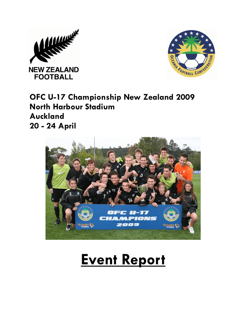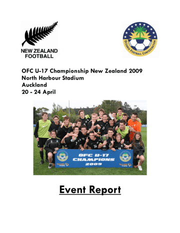 OFC U-17 Championship New Zealand 2009 North Harbour Stadium Auckland 20 - 24 April Event Report CONTENTS Tournament Organisation 3 Foreword 4 General Organisation 5 Media and Marketing 6 Match Officials 7 Story of the Championship 8 Match Day 1 8 Match Day 2 9 Match Day 3 10 Statistics and Team Data 11 New Caledonia 11 New Zealand 13 Tahiti 15 Vanuatu 17 Photo Gallery 19 2 TOURNAMENT ORGANISATION Oceania Football Confederation (OFC) New Zealand Football (NZF) President General Secretary Technical Director Reynald Temarii Tai Nicholas Jim Selby Chairman CEO Frank Van Hattum Michael Glading Address Mount Smart Stadium Address 12 Maurice Road Penrose Lion Foundation House North Harbour Stadium Oteha Valley Rd Albany Auckland New Zealand PO Box 62-586 Kalmia Street Auckland 6 New Zealand Auckland New Zealand PO Box 301-043 Albany Auckland New Zealand Telephone Fax Email +64 9 525 8161 +64 9 525 8164 [email protected] Telephone Fax Email Web www.oceaniafootball.com Web 3 +64 9 414 0175 +64 9 414 0176 [email protected] .nz www.nzfootball.co.nz FOREWORD The OFC U-17 Championship is a significant competition for Oceania because it introduces a whole new crop of young players who will be the future stars of football in our region. We often see the most pure form of the game at this age group as players are eager to attack and have little fear of making mistakes. Oceania’s future depends on the development of our youth and, after a strong display of skill and technical aptitude at the OFC U17 Championship New Zealand 2009, we can look forward to more success on the world stage. This year’s championship featured New Caledonia, New Zealand, Tahiti and Vanuatu. For the players, there was no lack of motivation as they strived to win the 2009 edition and book a place at the FIFA U-17 World Cup in Nigeria. Representing Oceania at the FIFA tournament is not only a huge honour but also an opportunity to shine on the world stage. North Harbour Stadium provided a wonderful backdrop for the event and thanks must be extended to the many volunteers and organisers who worked to deliver a memorable OFC U-17 Championship. I would also like to thank the tournament participants and national associations for their continued commitment to football development. All the players performed to the best of their abilities and I was pleased to see that each match was played in the spirit of fair play. Reynald Temarii President Oceania Football Confederation 4 GENERAL ORGANISATION The OFC U-17 Championship 2009 had been scheduled to take place in Fiji but flood damage forced Oceania Football Confederation (OFC) to change the venue to New Zealand. Initially, seven entries were received with New Caledonia, New Zealand, Tahiti and Vanuatu confirming their participation following the venue change. North Harbour Stadium was chosen to be the setting for the championship with the week’s six matches played on two fields - the artificial ‘No 2’ pitch and the picturesque ‘No 1’ natural pitch. Despite heavy rain on Match Day 1, the natural turf stayed in good condition throughout the week. OFC was responsible for the delivery of the event and received welcome support from New Zealand Football. The Local Organising Committee (LOC) ensured each match kicked off on time and that all run schedules were followed in a timely fashion. The OFC Technical Study Group, consisting of OFC Technical Director Jim Selby and assistant FIFA Development Officer Patrick Jacquemet, were charged with the responsibility of analysing each match as part of the confederation’s ongoing commitment to analysing technical and physiological standards within the OFC region. The recruitment of volunteers in areas such as security, logistics and ball kids proved vital in terms of the delivering of a professional event. Due to a lack of fixed buildings at the venue, extra help was needed to erect the various marquees that were set up on both fields. Special thanks must go to the volunteers for their tireless efforts in what proved to be challenging weather conditions. Also thanks to New Zealand Football for their hard work and commitment. 5 MEDIA AND MARKETING An exciting new partnership between Oceania Football Confederation (OFC) and Radio New Zealand International (RNZI) resulted in extensive coverage of the OFC U-17 Championship. In exchange for the exclusive rights, RNZI broadcast coverage and commentaries through live internet streaming as well as analogue and 19 metre band formats. Radio Vanuatu took the commentary, which was provided by former OFC Media Officer Gordon Watson, but with the lack of French commentary there was not the same pick up in New Caledonia and Tahiti. As is common in New Zealand, the tournament was initially met with indifference from local media but on the final day there were a number of key journalists present to witness the Kiwis qualify for the FIFA U-17 World Cup. This included representatives from TV3 and Prime TV plus major New Zealand newspapers New Zealand Herald and New Zealand Truth. A number of photographers were also present on Match Day 3. External media crews and staff from all participating associations travelled to New Zealand for the OFC U-17 Championship 2009 and this provided additional coverage. The erecting of temporary scaffolding assisted the TV production for all visiting crews, including TNTV’s Olivier Huc from Tahiti and Harry Atisson, who recently started production of Vanuatu’s first football show. As always, OFC Media provided extensive coverage throughout the championship, including live text updates on www.oceaniafootball.com 6 MATCH OFFICIALS OFC is committed to developing world-class match officials and that development programme was furthered in Auckland as the top officials from around the region gathered for the OFC U17 Championship New Zealand 2009. Just prior to the championship, all participants took part in the OFC Elites Referees and Assistants course aimed at improving standar