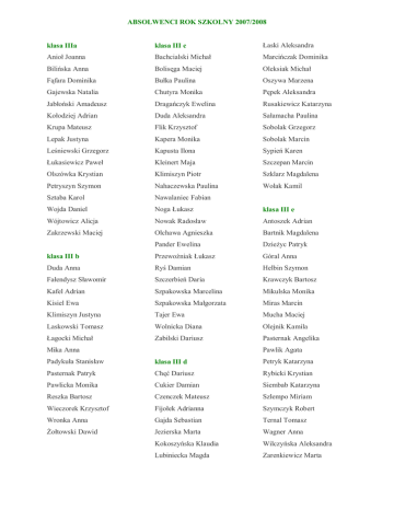 ABSOLWENCI ROK SZKOLNY 2007/2008 klasa IIIa klasa III c Łaski Aleksandra Anioł Joanna Bachcialski Michał Marcińczak Dominika Bilińska Anna Bolisęga Maciej Oleksiak Michał Fąfara Dominika Bułka Paulina Oszywa Marzena Gajewska Natalia Chutyra Monika Pępek Aleksandra Jabłoński Amadeusz Dragańczyk Ewelina Rusakiewicz Katarzyna Kołodziej Adrian Duda Aleksandra Sałamacha Paulina Krupa Mateusz Flik Krzysztof Sobolak Grzegorz Lepak Justyna Kapera Monika Sobolak Marcin Leśniewski Grzegorz Kapusta Ilona Sypień Karen Łukasiewicz Paweł Kleinert Maja Szczepan Marcin Olszówka Krystian Klimiszyn Piotr Szklarz Magdalena Petryszyn Szymon Nahaczewska Paulina Wolak Kamil Sztaba Karol Nawalaniec Fabian Wojda Daniel Noga Łukasz klasa III e Wójtowicz Alicja Nowak Radosław Antoszek Adrian Zakrzewski Maciej Olchawa Agnieszka Bartnik Magdalena Pander Ewelina Dzieżyc Patryk klasa III b Przewoźniak Łukasz Góral Anna Duda Anna Ryś Damian Helbin Szymon Fałendysz Sławomir Szczerbień Daria Krawczyk Bartosz Kafel Adrian Szpakowska Marcelina Mikulska Monika Kisiel Ewa Szpakowska Małgorzata Miras Marcin Klimiszyn Justyna Tajer Ewa Mucha Maciej Laskowski Tomasz Wolnicka Diana Olejnik Kamila Łagocki Michał Zabilski Dariusz Pasternak Angelika Mika Anna Pawlik Agata Padykuła Stanisław klasa III d Petryk Katarzyna Pasternak Patryk Chęć Dariusz Rybicki Krystian Pawlicka Monika Cukier Damian Siembab Katarzyna Reszka Bartosz Czenczek Mateusz Szlempo Miriam Wieczorek Krzysztof Fijołek Adrianna Szymczyk Robert Wronka Anna Gajda Sebastian Ternal Tomasz Żołtowski Dawid Jezierska Marta Wagner Anna Kokoszyńska Klaudia Wilczyńska Aleksandra Lubiniecka Magda Zarenkiewicz Marta Żelazny Damian Krzywy Marcin Podoluk Patrycja klasa III f Kucfir Magdalena Pożeg Marta Borodacz Anna Marczak Tomasz Rudzki Andrzej Drążek Adrian Mazurek Magdalena Sadowska Dorota Drewniak Patrycja Morozińska Marlena Schutterly Łukasz Firlejczyk Angelika Oleksyk Katarzyna Stanek Paulina Gałka Bartosz Polak Aneta Stępiński Mateusz Kamińska Weronika Poparda Marta Szeremeta Tomasz Klimczak Dawid Resakowski Piotr Szewczyk Joanna Komar Katarzyna Rzepska Angelika Wajda Marcin Kozik Tomasz Sadowska Dominika Włosek Angelika Kubisztal Bartosz Sieroń Adrian Kwiatkowski Kristofer Stecko Jowita klasa III m Lorenc Arkadiusz Sztandera Sylwia Buczkowski Marcin Mazur Krzysztof Szura Paulina Cieślik Aleksandra Mazurkiewicz Michał Wideł Anna Copija Tomasz Pałczyński Michał Wideł Katarzyna Czulak Łukasz Pawlik Adriana Zacharko Adrian Drobik Katarzyna Pawluk Grzegorz Zelek Dagmara Giża Adam Podolak Rafał Zielińska Marta Gurbisz Łukasz Potoczak Paweł Harmata Maciej Raniszewski Marek klasa III k Kasperski Dawid Rogalska Joanna Błachowiecka Marta Klimczak Konrad Sobel Michał Bocheńska Marta Kluska Angelika Sobótka Natalia Casamayor Daria Kolanko Karolina Szczęch Tomasz Czarny Karolina Lechowicz Marcin Szczypta Patrycja Fujarczuk Maciej Leśniak Korneliusz Welik Sylwia Grociak Marta Skowronek Weronika Jasek Karolina Sługocki Kamil klasa III g Jahn Gabriela Szczelina Michał Błaszczyszyn Marta Knobloch Alina Sztaba Marek Bubiak Adrian Konieczna Anna Wojtak Mateusz Czajka Patryk Kozik Bartosz Woźniak Tomasz Gryczewska Katarzyna Krzywy Daria Zabilska Aleksandra Jakubiszyn Joanna Kusińska Magdalena Jarek Mariusz Latyńska Dagmara klasa III p Kaczkowska Marta Moskal Paulina Borek Natalia Klamer Mateusz Możejko Joanna Dobosz Rafał Gabryel Aneta Grześków Krzysztof Guziejko Lucyna Hazik Grzegorz Iberat Anastazja Ilich Weronika Jaworska Monika Juszczak Łukasz Kamiński Paweł Kłapkowski Marcin Komarnicki Dawid Krowiak Piotr Kruba Ewelina Maluśki Mateusz Maruniak Paweł Mikołajczyk Patryk Otręba Karolina Piotrowski Kamil Skowron Grzegorz Stećko Karolina Szozda Daniel Tkaczyk Patryk Todorowski Mateusz Warzycha Łukasz Zalewski Wojciech Zarzycki Radosław Zuba Adam Zyzak Wojciech