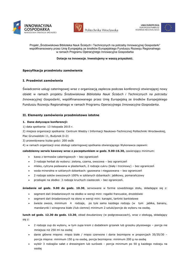 Projekt „Środowiskowa Biblioteka Nauk Ścisłych i Technicznych na potrzeby Innowacyjnej Gospodarki” współfinansowany przez Unię Europejską ze środków Europejskiego Funduszu Rozwoju Regionalnego w ramach Programu Operacyjnego Innowacyjna Gospodarka Dotacje na innowacje. Inwestujemy w waszą przyszłość. Specyfikacja przedmiotu zamówienia I. Przedmiot zamówienia Świadczenie usługi cateringowej wraz z organizacją zaplecza podczas konferencji otwierającej nowy obiekt w ramach projektu Środowiskowa Biblioteka Nauk Ścisłych i Technicznych na potrzeby Innowacyjnej Gospodarki, współfinansowanego przez Unię Europejską ze środków Europejskiego Funduszu Rozwoju Regionalnego w ramach Programu Operacyjnego Innowacyjna Gospodarka. II. Elementy zamówienia przedmiotowo istotne 1. Dane dotyczące konferencji: 1) data spotkania: 13 listopada 2015 r. 2) miejsce organizacji spotkania: Centrum Wiedzy i Informacji Naukowo-Technicznej Politechniki Wrocławskiej, Plac Grunwaldzki 11, Budynek D-21 3) przewidywana liczba gości: 200 osób 4) w ramach organizacji oraz obsługi cateringowej spotkania otwierającego Wykonawca zapewni: całodzienny serwis kawowy wraz z poczęstunkiem w godz. 9.00-16.30, zawierający minimum: kawa z termosów cateringowych – bez ograniczeń 3 rodzaje herbat do wyboru: zielona, czarna, owocowa – bez ograniczeń mleko, cytryna podawana w plasterkach, 2 rodzaje cukru (biały i trzcinowy) – bez ograniczeń woda mineralna w szklanych dzbankach: gazowana i niegazowana – bez ograniczeń 2 rodzaje soków owocowych 100% w szklanych dzbankach: jabłkowy, pomarańczowy przekąski na słodko: 3 rodzaje kruchych ciasteczek – bez ograniczeń. śniadanie od godz. 9.00 do godz. 10.30, serwowane w formie szwedzkiego stołu, składające się z: segment dań śniadaniowych na słodko w wersji mini: rogaliki francuskie, drożdżówki segment dań śniadaniowych na słono w wersji mini: kanapki, tartinki bankietowe świeże owoce, minimum 4 rodzaje, po tyle samo każdego rodzaju (w tym jabłka, banany, mandarynki i winogrona białe i/lub ciemne) minimum 2 sztuki/porcje do wyboru na osobę. lunch od godz. 12.30 do godz. 13.30, obiad dwudaniowy (w podgrzewaczach), wraz z obsługą, składający się z: 2 rodzaje zup do wyboru, w tym zupa krem z dodatkiem grzanek lub groszku ptysiowego – porcja nie mniejsza niż 250 ml na osobę danie główne mięsne: mięso białe / mięso czerwone i danie bezmięsne w proporcjach 35/35/30 – porcja mięsna: minimum 150 g na osobę, porcja bezmięsna: minimum 200 g na osobę wybór 3 rodzajów sałat z dressingiem lub surówek - porcja minimum po 50 g każdego rodzaju na osobę Projekt „Środowiskowa Biblioteka Nauk Ścisłych i Technicznych na potrzeby Innowacyjnej Gospodarki” współfinansowany przez Unię Europejską ze środków Europejskiego Funduszu Rozwoju Regionalnego w ramach Programu Operacyjnego Innowacyjna Gospodarka Dotacje na innowacje. Inwestujemy w waszą przyszłość. 2 rodzaje dodatków do wyboru: pieczone ziemniaki, dziki ryż z dodatkami – porcja minimum 100 g na osobę deser do wyboru w formie świeżo pieczonych, porcjowanych ciast – minimum 2 rodzaje, od 50 g do 100 g każda porcja, minimum po 2 porcje na osobę napoje ciepłe i zimne (kawa, herbata, woda mineralna, soki w szklanych dzbankach) – bez ograniczeń. toast okolicznościowy ok. godz. 13.30 wzniesiony winem musującym, dodatkowo tort w kształcie wiernie odwzorowującym budynek BIBLIOTECHU. Przyjęcie koktajlowe od godz. 15.30 do godz. 16.30 - serwowane w formie szwedzkiego stołu, wraz z obsługą, składające się z bufetu zawierającego minimum: sushi (np. nigiru, hutomaki i maki, husomaki) oraz dania koktajlowe podane w formie finger food – proporcje 50/50 - porcja minimum 150 g na osobę zimna płyta – owoce morza, wybór wędlin i mięs pieczonych oraz serów (w tym sery dojrzewające, pleśniowe, sery twarde) – porcja minimum 200 g na osobę wybór pieczywa porcjowanego, krojonego, minimum 3 rodzaje (białe, razowe, bułeczki białe) świeże owoce, minimum 4 rodzaje (w tym jabłka, banany, mandarynki i winogrona białe i/lub ciemne) minimum 2 sztuki/porcje do wyboru na osobę napoje ciepłe i zimne (kawa, herbata, woda mineralna, soki w szklanych dzbankach) – bez ograniczeń. 2. Wykonawca zobowiązany jest także w ramach usługi cateringowej do: zapewnienia transportu, tj. dostarczenia usługi na miejsce jej świadczenia obsługi technicznej w zakresie przygotowania cateringu, a następnie uprzątnięcia i odbioru pozostałości zapewnienia obsługi kelnerskiej w trakcie trwania konferencji - minimum 4 osoby (w równej ilości mężczyzn i kobiet). Kelnerzy/Kelnerki powinni przede wszystkim być osobami uprzejmymi i grzecznymi. Powinni zachowywać się i być ubrani zgodnie z zasadami savoir vivre kelnera. zapewnienie stolików koktajlowych nakrytych obrusami, serwowane dania podawane na zastawach porcelanowych, sztućce metalowe zapewnienia stołów bufetowych nakrytych obrusami (obrusy nie mogą być jednorazowe – papierowe). Użyte obrusy muszą być bezwzględnie czyste i nieuszkodzone zapewnienia dekoracji florystycznej ze świeżych kwiatów na stołach koktajlowych i bufetowych oraz serwetek papierowych jednowarstwowych stołowych min 300 szt. uprzątnięcia i wywiezienia wszystkich śmieci pozostałych po posiłkach po opuszczeniu lokalu przez wszystkich gości, bądź też na prośbę Zamawiającego. Projekt „Środowiskowa Biblioteka Nauk Ścisłych i Technicznych na potrzeby Innowacyjnej Gospodarki” współfinansowany przez Unię Europejską ze środków Europejskiego Funduszu Rozwoju Regionalnego w ramach Programu Operacyjnego Innowacyjna Gospodarka Dotacje na innowacje. Inwestujemy w waszą przyszłość. III. Informacje o projekcie 1. Tytuł i numer projektu: POIG.02.01.00-02-097/09 pod nazwą „Środowiskowa Biblioteka Nauk Ścisłych i Technicznych na potrzeby Innowacyjnej Gospodarki” współfin