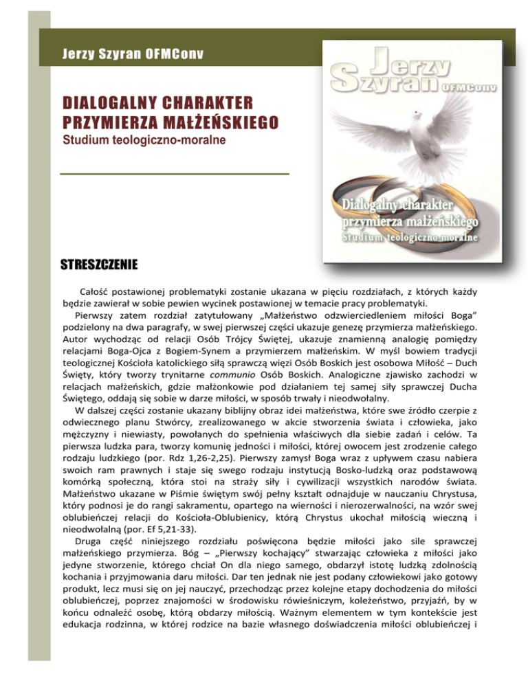 Jerzy Szyran OFMConv DIALOGALNY CHARAKTER PRZYMIERZA MAŁŻEŃSKIEGO Studium teologiczno-moralne STRESZCZENIE Całośd postawionej problematyki zostanie ukazana w pięciu rozdziałach, z których każdy będzie zawierał w sobie pewien wycinek postawionej w temacie pracy problematyki. Pierwszy zatem rozdział zatytułowany „Małżeostwo odzwierciedleniem miłości Boga” podzielony na dwa paragrafy, w swej pierwszej części ukazuje genezę przymierza małżeoskiego. Autor wychodząc od relacji Osób Trójcy Świętej, ukazuje znamienną analogię pomiędzy relacjami Boga-Ojca z Bogiem-Synem a przymierzem małżeoskim. W myśl bowiem tradycji teologicznej Kościoła katolickiego siłą sprawczą więzi Osób Boskich jest osobowa Miłośd – Duch Święty, który tworzy trynitarne communio Osób Boskich. Analogiczne zjawisko zachodzi w relacjach małżeoskich, gdzie małżonkowie pod działaniem tej samej siły sprawczej Ducha Świętego, oddają się sobie w darze miłości, w sposób trwały i nieodwołalny. W dalszej części zostanie ukazany biblijny obraz idei małżeostwa, które swe źródło czerpie z odwiecznego planu Stwórcy, zrealizowanego w akcie stworzenia świata i człowieka, jako mężczyzny i niewiasty, powołanych do spełnienia właściwych dla siebie zadao i celów. Ta pierwsza ludzka para, tworzy komunię jedności i miłości, której owocem jest zrodzenie całego rodzaju ludzkiego (por. Rdz 1,26-2,25). Pierwszy zamysł Boga wraz z upływem czasu nabiera swoich ram prawnych i staje się swego rodzaju instytucją Bosko-ludzką oraz podstawową komórką społeczną, która stoi na straży siły i cywilizacji wszystkich narodów świata. Małżeostwo ukazane w Piśmie świętym swój pełny kształt odnajduje w nauczaniu Chrystusa, który podnosi je do rangi sakramentu, opartego na wierności i nierozerwalności, na wzór swej oblubieoczej relacji do Kościoła-Oblubienicy, którą Chrystus ukochał miłością wieczną i nieodwołalną (por. Ef 5,21-33). Druga częśd niniejszego rozdziału poświęcona będzie miłości jako sile sprawczej małżeoskiego przymierza. Bóg – „Pierwszy kochający” stwarzając człowieka z miłości jako jedyne stworzenie, którego chciał On dla niego samego, obdarzył istotę ludzką zdolnością kochania i przyjmowania daru miłości. Dar ten jednak nie jest podany człowiekowi jako gotowy produkt, lecz musi się on jej nauczyd, przechodząc przez kolejne etapy dochodzenia do miłości oblubieoczej, poprzez znajomości w środowisku rówieśniczym, koleżeostwo, przyjaźo, by w koocu odnaleźd osobę, którą obdarzy miłością. Ważnym elementem w tym kontekście jest edukacja rodzinna, w której rodzice na bazie własnego doświadczenia miłości oblubieoczej i przykładu, kształtują w dziecku prawdziwy obraz miłości i jej autentyczny sens. Na bazie tych analiz, autor podejmuje próbę zdefiniowania miłości jako siły sprawczej małżeostwa. Definicja ta określa również cechy i działanie miłości, które w przełożeniu na życie małżeosko-rodzinne tworzą z „ja” i „ty” mężczyzny i kobiety nowe „my” – communio personarum, które nie naruszając własnej osobowości męża i żony, tworzy z nich jednośd w wymiarze duchowym i życiowym. Owa jednośd znajduje swoje przełożenie także na relacje w wymiarze seksualnym jako znaku jedności i płodności, do której małżonkowie zostali powołani na mocy Bożego zamysłu. Pierwszy rozdział podejmując analizę teologii małżeostwa nakreśla pewien kontekst do dalszej refleksji teologicznej, która w dalszej części pracy przechodzi do ukazania aspektów dialogu małżeoskiego. Drugi rozdział dotyczący teorii komunikacji, zatytułowany jest „Dialog małżeoski jako spotkanie współmałżonków” i składa się z dwóch paragrafów, z których pierwszy będzie dotyczył komunikacji interpersonalnej, drugi zaś komunikacji w relacjach małżeoskich. Pierwsza częśd niniejszego rozdziału podaje definicję oraz cele komunikacji, uwzględniając werbalne i niewerbalne sposoby nadawania komunikatów. Podstawowym założeniem zasad ludzkiego komunikowania jest zdolnośd właściwego sposobu nadawania komunikatów oraz ich odbierania przez adresata. Stąd ważnym elementem teorii komunikacji jest umiejętnośd jasnego przekazu i zdolnośd słuchania lub odczytywania komunikatów niewerbalnych, by w łączności pomiędzy osobami nie powstały różnego rodzaju konflikty komunikacyjne, uniemożliwiające właściwe nadawanie i odbiór. W dzisiejszych czasach coraz częściej stosowana jest tzw. komunikacja pozarelacyjna, która w pewnym sensie nie angażuje całości zdolności percepcyjnych osoby ludzkiej – jego zmysłów i władz, lecz ogranicza całośd komunikacji do wirtualnych kontaktów za pomocą różnego rodzaju komunikatorów, które w znacznym stopniu zubożają, zarówno werbalną, jak i niewerbalną formę komunikowania. Druga częśd rozdziału zostanie poświęcona małżeoskim formom dialogu, gdzie w jego płaszczyźnie werbalnej poczesne miejsce zajmuje tzw. „obowiązek zasiadania”, który stanowi właściwy dialog na płaszczyźnie horyzontalnej mąż-żona oraz wertykalnej małżonkowie-Bóg. Celem tych comiesięcznych spotkao jest poddanie pod obiektywną refleksję relacji panujących w rodzinie pomiędzy samymi małżonkami, małżonkami a ich dziedmi, innymi członkami rodziny, innymi ludźmi i Bogiem. Nie bez znaczenia są także codzienne rozmowy małżonków, które stanowią podstawę ich codziennego komunikowania swoich potrzeb i uczud. Dialog małżeoski na poziomie niewerbalnym rozkłada się na dwa aspekty: gesty dnia codziennego, które powinny byd znakiem ich wzajemnej miłości i szacunku dla siebie oraz dialog jako „mowa ciała”, gdzie małżonkowie w intymnych aktach wyrażają swoją miłośd i jednośd. Na zakooczenie analiz z zakresu komunikacji, refleksji teologicznej zostaną poddane możliwo