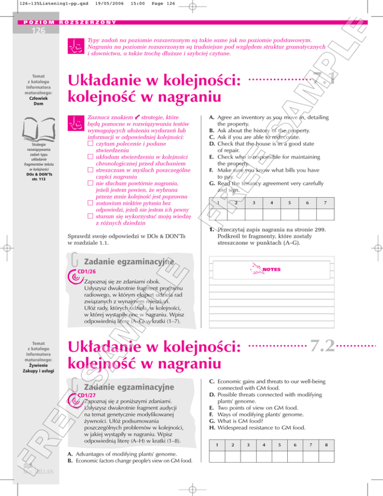 126-135Listening1-pp.qxd 19/05/2006 15:00 Page 126 E POZIOM ROZSZERZONY 126 Temat z katalogu Informatora maturalnego: Cz∏owiek Dom Uk∏adanie w kolejnoÊci: kolejnoÊç w nagraniu Zaznacz znakiem strategie, które b´dà pomocne w rozwiàzywaniu testów wymagajàcych u∏o˝enia wydarzeƒ lub informacji w odpowiedniej kolejnoÊci: 6 czytam polecenie i podane stwierdzenia 6 uk∏adam stwierdzenia w kolejnoÊci chronologicznej przed s∏uchaniem 6 streszczam w myÊlach poszczególne cz´Êci nagrania 6 nie s∏ucham powtórnie nagrania, je˝eli jestem pewien, ˝e wybrana przeze mnie kolejnoÊç jest poprawna 6 zostawiam niektóre pytania bez odpowiedzi, je˝eli nie jestem ich pewny 6 staram si´ wykorzystaç mojà wiedz´ z ró˝nych dziedzin 7.1 A. Agree an inventory as you move in, detailing the property. B. Ask about the history of the property. C. Ask if you are able to redecorate. D. Check that the house is in a good state of repair. E. Check who is responsible for maintaining the property. F. Make sure you know what bills you have to pay. G. Read the tenancy agreement very carefully and sign. FR EE Strategie rozwiàzywania zadaƒ typu uk∏adanie fragmentów tekstu w kolejnoÊci DOs & DON’Ts str. 113 SA M PL Typy zadaƒ na poziomie rozszerzonym sà takie same jak na poziomie podstawowym. Nagrania na poziomie rozszerzonym sà trudniejsze pod wzgl´dem struktur gramatycznych i s∏ownictwa, a tak˝e troch´ d∏u˝sze i szybciej czytane. Sprawdê swoje odpowiedzi w DOs & DON’Ts w rozdziale 1.1. 1 2 3 4 5 6 7 1. Przeczytaj zapis nagrania na stronie 299. PodkreÊl te fragmenty, które zosta∏y streszczone w punktach (A–G). Zadanie egzaminacyjne NOTES E CD1/26 Temat z katalogu Informatora maturalnego: ˚ywienie Zakupy i us∏ugi SA M PL Zapoznaj si´ ze zdaniami obok. Us∏yszysz dwukrotnie fragment programu radiowego, w którym ekspert udziela rad zwiàzanych z wynajmem mieszkaƒ. U∏ó˝ rady, których udziela, w kolejnoÊci, w której wystàpi∏y one w nagraniu. Wpisz odpowiednià liter´ (A–G) w kratki (1–7). Zadanie egzaminacyjne FR EE CD1/27 Zapoznaj si´ z poni˝szymi zdaniami. Us∏yszysz dwukrotnie fragment audycji na temat genetycznie modyfikowanej ˝ywnoÊci. U∏ó˝ podsumowania poszczególnych problemów w kolejnoÊci, w jakiej wystàpi∏y w nagraniu. Wpisz odpowiednià liter´ (A–H) w kratki (1–8). A. Advantages of modifying plants' genome. B. Economic factors change people's view on GM food. MACMILLAN 7.2 Uk∏adanie w kolejnoÊci: kolejnoÊç w nagraniu C. Economic gains and threats to our well-being connected with GM food. D. Possible threats connected with modifying plants' genome. E. Two points of view on GM food. F. Ways of modifying plants' genome. G. What is GM food? H. Widespread resistance to GM food. 1 2 3 4 5 6 7 8 15:04 Page 161 Zaznacz znakiem strategie, pomocne w rozwiàzywaniu testów, wymagajàcych uzupe∏nienia tekstu brakujàcymi zdaniami. WyjaÊnij, dlaczego pozosta∏e strategie sà nieodpowiednie. 6 czytam polecenie 6 zaczynam rozwiàzanie zadania od przeczytania usuni´tych z tekstu zdaƒ 6 zwracam szczególnà uwag´ na spójniki, zaimki osobowe, itp. 6 je˝eli wpisane zdanie wspó∏gra ze zdaniem je poprzedzajàcym, nie sprawdzam, czy pasuje ono równie˝ do zdania nast´pnego 6 po dopasowaniu zdaƒ nie czytam ponownie ca∏ego tekstu 6 wpisuj´ brakujàce zdania po kolei, nawet jeÊli wymaga to przeczytania fragmentu tekstu kilkanaÊcie razy 6 wpisuj´ zdanie w luk´, je˝eli zawiera ono s∏owo, które pojawia si´ bezpoÊrednio przed lukà 6 zostawiam niektóre pytania bez odpowiedzi, je˝eli nie mam co do nich pewnoÊci E Sprawdê swoje odpowiedzi w DOs & DON’Ts w rozdziale 13.5. SA M PL Zadanie egzaminacyjne Przeczytaj uwa˝nie tekst, z którego usuni´to siedem zdaƒ. Wpisz w ka˝de z miejsc (1–7) liter´ (A–H), którà oznaczone jest brakujàce zdanie. Jedno z podanych zdaƒ nie pasuje do tekstu. 499 s∏ów 2,5–3 min Pobie˝ne czytanie powinno zajàç FR EE An Englishman's Home is his Castle – on Credit In nineteen fifties Britain, most people rented their home from either a private landlord or the local council. But in the last twenty years things have changed completely. Now the majority live in homes that they own. Prices of homes in the United Kingdom vary greatly, as in other countries, depending on the type of dwelling and location; a semi-detached house – the typical house in the UK – can be bought in North Wales for around 12,000 upwards. 1 _____ The same house in London will cost around 160,000. A small flat in central London might cost anything from 250,000 to a million pounds, and is very likely to go up in value over time. 2 _____ 18.1 161 Temat z katalogu Informatora maturalnego: Cz∏owiek Dom The nineteen nineties saw house prices shoot up: the average by about 20% in some areas. Borrowing money in the UK is cheap at the moment if you fulfil certain criteria. 3 _____ This is the way the British get a foot on the property ladder. They can go up the ladder by buying a more expensive home later and statistics show that homebuyers move house, on average, once every seven years in England. You might see a house for sale simply by walking past and noticing the 'For Sale' sign outside. 4 _____ The agent does everything for you, and charges about one per cent of the property value. 5 _____ It's much easier to visit the estate agent's; this is really a shop with leaflets showing lots of important information about each property that is for sale, including a photograph. If you like what you see, you can arrange with the estate agent to visit the property. 6 _____ A tour of the property will allow you to see it with the naked eye, which is more realistic than the estate agent's positive description and glossy photograph. Is it what you hoped? If so, you can start to arrange a mortgage. You can visit the banks and building societies for advice; borrowing so much money is a serious undertaking, and you 