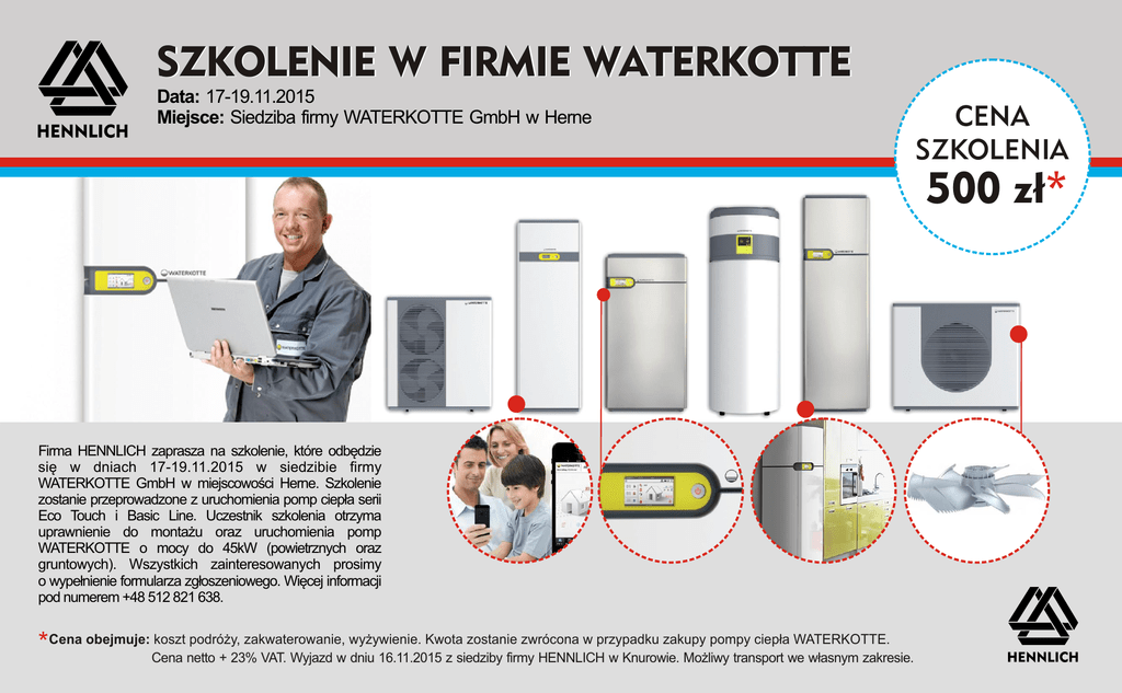 SZKOLENIE W FIRMIE WATERKOTTE Data: 17-19.11.2015 Miejsce: Siedziba firmy WATERKOTTE GmbH w Herne CENA SZKOLENIA 500 zł* Firma HENNLICH zaprasza na szkolenie, które odbędzie się w dniach 17-19.11.2015 w siedzibie firmy WATERKOTTE GmbH w miejscowości Herne. Szkolenie zostanie przeprowadzone z uruchomienia pomp ciepła serii Eco Touch i Basic Line. Uczestnik szkolenia otrzyma uprawnienie do montażu oraz uruchomienia pomp WATERKOTTE o mocy do 45kW (powietrznych oraz gruntowych). Wszystkich zainteresowanych prosimy o wypełnienie formularza zgłoszeniowego. Więcej informacji pod numerem +48 512 821 638. koszt podróży, zakwaterowanie, wyżywienie. Kwota zostanie zwrócona w przypadku zakupy pompy ciepła WATERKOTTE. *Cena obejmuje: Cena netto + 23% VAT. Wyjazd w dniu 16.11.2015 z siedziby firmy HENNLICH w Knurowie. Możliwy transport we własnym zakresie. FORMULARZ ZGŁOSZENIOWY Zgłoszenie uczestnictwa w szkoleniu TRANSPORT WE WŁASNYM ZAKRESIE DATA, MIEJSCOWOŚĆ, PODPIS TRANSPORT ORGANIZOWANY PRZEZ HENNLICH. ZOBOWIĄZUJE SiĘ DO PRZYJAZDU DO SIEDZIBY HENNLICH W DNIU 16.11.2015 DO GODZINY 12:00. UWAGA 1. Wraz z przesłaniem Zgłoszenia Udziału w Szkoleniu należy wpłacić 100% wartości wynikającej z Uczestnictwa w Szkoleniu. Zapłata nastąpi na podstawie faktury wystawionej przez firmę HENNLICH. Cena netto, do której należy doliczyć 23% podatku VAT. 2. Warunkiem przystąpienia do szkolenia jest wpłata 100% należności wynikającej z Uczestnictwa w Szkoleniu. 3. Numer konta, na które należy wnosić opłaty: Raiffeisen Bank Polska S.A. ul. Piękna 20 00-549 Warszawa PL: 03 1750 1237 0000 0000 1336 4516. 4. Uczestnik szkolenia, który zgłosi swoją rezygnację z Udziału w Szkoleniu maksymalnie do 2 tygodni przed szkoleniem (do dnia 30.10.2015) otrzyma zwrot 100% wpłaconej kwoty. 5. Firma HENNLICH zobowiązuje się na czas trwania szkolenia do zapewnienia Uczestnikowi Szkolenia: transportu, zakwaterowania, wyżywienia.