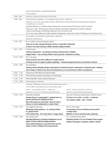 PIERWSZY DZIEŃ KONFERENCJI, CZWARTEK 20 PAŹDZIERNIKA 1 DAY, OCTOBER 2 st TH 8.00 – 9.00 REJESTRACJA UCZESTNIKÓW / REGISTRATION OF PARTICIPANTS 9.00 – 9.30 UROCZYSTE OTWARCIE KONFERENCJI – SALA LUSTRZANA / OFFICIAL OPENING – MIRRORS HALL MODERATOR: DR HAB. PROF. NADZW. MARIOLA ANTCZAK , PRZEWODNICZĄCA KOMITETU NAUKOWEGO I ORGANIZACYJNEGO KONFERENCJI / CHAIRPERSON OF THE COMMITTEE mgr Maja Jakóbczyk, p.o. Dyrektor Muzeum Miasta Łodzi / Acting Director of The Museum of the City of Lodz dr hab. prof. nadzw. Mariola Antczak, Kierownik Katedry Informatologii i Bibliologii Uniwersytetu Łódzkiego / Head of Informatology and Bibliology Department of the University of Lodz prof. dr hab. Joanna Jabłkowska, Dziekan Wydziału Filologicznego / Dean of the Faculty of Philology of the University of Lodz SESJA PLENARNA – SALA LUSTRZANA / PLENARY SESSION – MIRRORS HALL MODERATOR: DR MICHAŁ ZAJĄC 9.30 – 9.50 Ph.D. candidate Ana Maria Margarita Salvador Czytać czy nie czytać: słuchając dziecięcych rozmów o motywacjach czytelniczych To read or not to read: listening to children talk about reading motivation 9.50 – 10.10 dr Zofia Zasacka Czytelnicy zaangażowani – jak rozbudzać motywacje czytelnicze dzieci i młodzieży Engaged readers – how to develop children’s and young adults’ motivations for reading 10.10 – 10.30 Ph.D. Juan Araujo Writing instruction that makes a difference for English Learners Informacja zwrotna od uczących się języka angielskiego – kompetencje językowe kluczem do uczestnictwa w kulturze 10.30 – 10.50 mgr Paweł Braun Aranżacja wnętrza biblioteki pod kątem wykorzystania do działań kulturalnych i oświatowych w środowisku dzieci i młodzieży Interior design of a library for the cultural and educational use in the environment of children and adolescents 10.50 – 11.05 Wydawnictwo PWN IBUK Libra, Zbigniew Meller 11.05 – 11.20 Polskie Bractwo Kawalerów Gutenberga, Ewa Pogorzelska 11.20 – 11.35 Polska Sekcja IBBY, Tatiana Audycka-Szatrawska 11.35 – 12.00 PRZERWA KAWOWA / COFFEE BREAK PO GODZINIE 12.00 OBRADY ODBYWAJĄ SIĘ W DWÓCH RÓWNOLEGŁYCH SEKCJACH / AFTER 12.00 12.00 – 12.20 THE PROCEEDINGS ARE HELD IN TWO PARALLEL PANELS SEKCJA 1 – SALA LUSTRZANA / SECTION 1 – MIRRORS HALL SEKCJA 2 – RETRO CAFE / SECTION 2 – RETRO CAFE MODERATOR: DR HAB. PROF. UŁ STANISŁAWA KUREK-KOKOCIŃSKA MODERATOR: DR AGATA WALCZAK-NIEWIADOMSKA Aleksandra Dziubdziela assoc prof. Hülya Kartal, Nazife Dikmen, Mehmet Soyucok Dlaczego Polacy nie czytają książek? O wpływie historii na poziom czytelnictwa we współczesnej Polsce The three in one: a book – an author – an illustrator Trzy w jednym: książka – autor – ilustrator Why Polish people don’t read books? About the history’s influence on current reading trends in modern Poland 12.20 – 12.40 12.40 – 13.00 mgr Magdalena Ostrowska M.LIS. Victoria Itsekor Młodzieżowe trendy czytelnicze – od ”Harry’ego Pottera‛ po ”Igrzyska Śmierci‛ The importance of the use of libraries and the need for a reading culture Youth reading trends – from ‘Harry Potter’ to ‘Hunger Games’ Biblioteki i ich rola w krzewieniu kultury czytelniczej mgr Katarzyna Żyrek Ph.D. candidate Annette Ukkola Stereotypy biblioteczne w literaturze młodzieżowej oraz ich wpływ na kulturę czytelniczą młodego pokolenia. Motivating activities in the ‘Joy of Reading’ literacy program Library related stereotypes in young-adult fiction and their impact on culture of reading in the young generation Działania motywacyjne w programie ”Radość z Czytania‛ 13.00 – 13.20 13.20 – 13.40 dr Agnieszka Wandel Ph.D. Noureddine Guerroudj Współczesne encyklopedie dla dzieci i młodzieży: analiza księgoznawcza Teaching Reading for enjoyment and appreciation: How can students’ reading logs be effectively used? The contemporary encyclopaedias for children and young people: a bibliological analysis Ucząc czytania dla przyjemności i uznania: jak skutecznie wykorzystać dzienniki czytania uczniów? dr Zofia Pomirska Ph.D. Kateřina Homolová Technika szybkiego czytania wobec lingwistycznej teorii nauki czytania Czech children as readers: main results of the first representative research 2013 – 2014 The technique of speed reading to linguistic theory of learning to read Czeskie dzieci jako czytelnicy: główne rezultaty pierwszego reprezentatywnego badania 2013 – 2014 13.40 – 14.00 DYSKUSJA / TIME FOR DISCUSSION 14.00 – 14.50 PRZERWA KAWOWA ORAZ OBIAD / COFFEEBREAK AND LUNCH PO GODZINIE 14.50 OBRADY ODBYWAJĄ SIĘ W DWÓCH RÓWNOLEGŁYCH SEKCJACH / AFTER 14.50 – 15.10 14.50 THE PROCEEDINGS ARE HELD IN TWO PARALLEL PANELS SEKCJA 3 – SALA LUSTRZANA / SECTION 3 – MIRRORS HALL SEKCJA 4 – RETRO CAFE / SECTION 4 – RETRO CAFE MODERATOR: DR HAB. MAGDALENA PRZYBYSZ-STAWSKA MODERATOR: DR ZOFIA ZASACKA dr Agata Walczak-Niewiadomska dr Anna Krajewska Wczesna alfabetyzacja w polskich bibliotekach publicznych – zarys badań Żołnierze Wyklęci w polskich publikacjach dla młodzieży Sworn Soldiers in Polish publications for young readers Emergent literacy in Polish public libraries – research outline 15.10 – 15.30 15.30 – 15.50 15.50 – 16.10 dr Barbara Firla dr Agnieszka Fluda-Krokos AaltoHubs jako przykład efektywnego wykorzystania przestrzeni w bibliotece uniwersyteckiej Amor artis, amor libris – Biennale Ekslibrisu Dzieci i Młodzieży w Żarach jako przykład krzewienia miłości do książek AaltoHubs as an example of effective use of space in a university library Ex-Libris Biennale of Children and Youth in Zary as an example of promoting the love of books M.LIS. Ellyssa Kroski mgr Oliwia Brzeźniak Cosplay in Libraries: How to Embrace Costume Play in Your Library Centrum Literatury Dziecięcej – wiedza użyta w praktyce, czyli zgodnie z naszym hasłem ”Chcemy służyć tym, którzy służą dzieciom‛ Cosplay w bibliotekach: jak wykorzystać zabawę kost