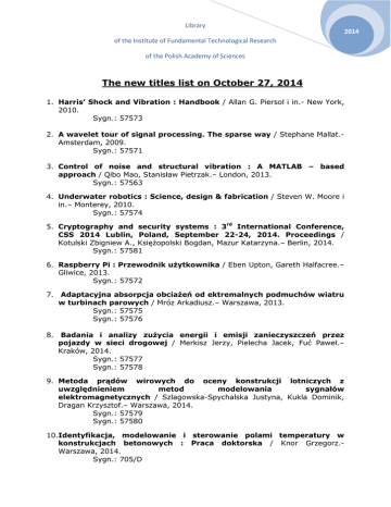 Library 2014 of the Institute of Fundamental Technological Research of the Polish Academy of Sciences The new titles list on October 27, 2014 1. Harris’ Shock and Vibration : Handbook / Allan G. Piersol i in.- New York, 2010. Sygn.: 57573 2. A wavelet tour of signal processing. The sparse way / Stephane Mallat.Amsterdam, 2009. Sygn.: 57571 3. Control of noise and structural vibration : A MATLAB – based approach / Qibo Mao, Stanisław Pietrzak.– London, 2013. Sygn.: 57563 4. Underwater robotics : Science, design & fabrication / Steven W. Moore i in.– Monterey, 2010. Sygn.: 57574 5. Cryptography and security systems : 3rd International Conference, CSS 2014 Lublin, Poland, September 22-24, 2014. Proceedings / Kotulski Zbigniew A., Księżopolski Bogdan, Mazur Katarzyna.– Berlin, 2014. Sygn.: 57581 6. Raspberry Pi : Przewodnik użytkownika / Eben Upton, Gareth Halfacree.– Gliwice, 2013. Sygn.: 57572 7. Adaptacyjna absorpcja obciażeń od ektremalnych podmuchów wiatru w turbinach parowych / Mróz Arkadiusz.– Warszawa, 2013. Sygn.: 57575 Sygn.: 57576 8. Badania i analizy zużycia energii i emisji zanieczyszczeń przez pojazdy w sieci drogowej / Merkisz Jerzy, Pielecha Jacek, Fuć Paweł.– Kraków, 2014. Sygn.: 57577 Sygn.: 57578 9. Metoda prądów wirowych do oceny konstrukcji lotniczych z uwzględnieniem metod modelowania sygnałów elektromagnetycznych / Szlagowska-Spychalska Justyna, Kukla Dominik, Dragan Krzysztof.– Warszawa, 2014. Sygn.: 57579 Sygn.: 57580 10.Identyfikacja, modelowanie i sterowanie polami temperatury w konstrukcjach betonowych : Praca doktorska / Knor Grzegorz.Warszawa, 2014. Sygn.: 705/D