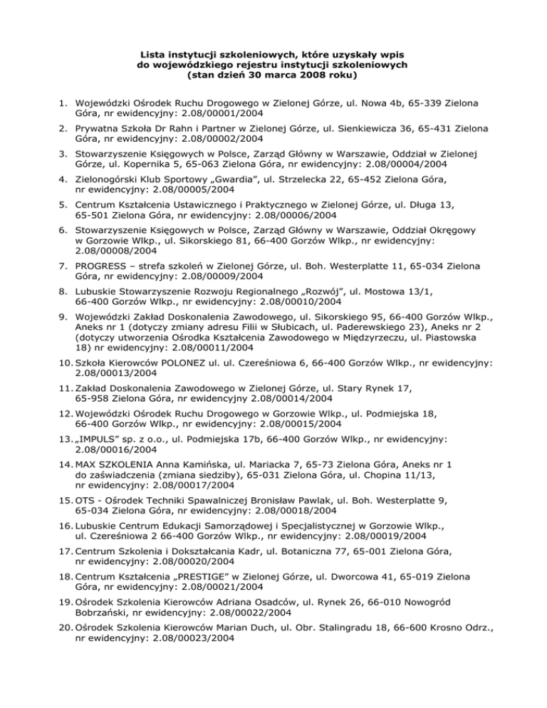 Lista instytucji szkoleniowych, które uzyskały wpis do wojewódzkiego rejestru instytucji szkoleniowych (stan dzień 30 marca 2008 roku) 1. Wojewódzki Ośrodek Ruchu Drogowego w Zielonej Górze, ul. Nowa 4b, 65-339 Zielona Góra, nr ewidencyjny: 2.08/00001/2004 2. Prywatna Szkoła Dr Rahn i Partner w Zielonej Górze, ul. Sienkiewicza 36, 65-431 Zielona Góra, nr ewidencyjny: 2.08/00002/2004 3. Stowarzyszenie Księgowych w Polsce, Zarząd Główny w Warszawie, Oddział w Zielonej Górze, ul. Kopernika 5, 65-063 Zielona Góra, nr ewidencyjny: 2.08/00004/2004 4. Zielonogórski Klub Sportowy „Gwardia”, ul. Strzelecka 22, 65-452 Zielona Góra, nr ewidencyjny: 2.08/00005/2004 5. Centrum Kształcenia Ustawicznego i Praktycznego w Zielonej Górze, ul. Długa 13, 65-501 Zielona Góra, nr ewidencyjny: 2.08/00006/2004 6. Stowarzyszenie Księgowych w Polsce, Zarząd Główny w Warszawie, Oddział Okręgowy w Gorzowie Wlkp., ul. Sikorskiego 81, 66-400 Gorzów Wlkp., nr ewidencyjny: 2.08/00008/2004 7. PROGRESS – strefa szkoleń w Zielonej Górze, ul. Boh. Westerplatte 11, 65-034 Zielona Góra, nr ewidencyjny: 2.08/00009/2004 8. Lubuskie Stowarzyszenie Rozwoju Regionalnego „Rozwój”, ul. Mostowa 13/1, 66-400 Gorzów Wlkp., nr ewidencyjny: 2.08/00010/2004 9. Wojewódzki Zakład Doskonalenia Zawodowego, ul. Sikorskiego 95, 66-400 Gorzów Wlkp., Aneks nr 1 (dotyczy zmiany adresu Filii w Słubicach, ul. Paderewskiego 23), Aneks nr 2 (dotyczy utworzenia Ośrodka Kształcenia Zawodowego w Międzyrzeczu, ul. Piastowska 18) nr ewidencyjny: 2.08/00011/2004 10. Szkoła Kierowców POLONEZ ul. ul. Czereśniowa 6, 66-400 Gorzów Wlkp., nr ewidencyjny: 2.08/00013/2004 11. Zakład Doskonalenia Zawodowego w Zielonej Górze, ul. Stary Rynek 17, 65-958 Zielona Góra, nr ewidencyjny 2.08/00014/2004 12. Wojewódzki Ośrodek Ruchu Drogowego w Gorzowie Wlkp., ul. Podmiejska 18, 66-400 Gorzów Wlkp., nr ewidencyjny: 2.08/00015/2004 13. „IMPULS” sp. z o.o., ul. Podmiejska 17b, 66-400 Gorzów Wlkp., nr ewidencyjny: 2.08/00016/2004 14. MAX SZKOLENIA Anna Kamińska, ul. Mariacka 7, 65-73 Zielona Góra, Aneks nr 1 do zaświadczenia (zmiana siedziby), 65-031 Zielona Góra, ul. Chopina 11/13, nr ewidencyjny: 2.08/00017/2004 15. OTS - Ośrodek Techniki Spawalniczej Bronisław Pawlak, ul. Boh. Westerplatte 9, 65-034 Zielona Góra, nr ewidencyjny: 2.08/00018/2004 16. Lubuskie Centrum Edukacji Samorządowej i Specjalistycznej w Gorzowie Wlkp., ul. Czereśniowa 2 66-400 Gorzów Wlkp., nr ewidencyjny: 2.08/00019/2004 17. Centrum Szkolenia i Dokształcania Kadr, ul. Botaniczna 77, 65-001 Zielona Góra, nr ewidencyjny: 2.08/00020/2004 18. Centrum Kształcenia „PRESTIGE” w Zielonej Górze, ul. Dworcowa 41, 65-019 Zielona Góra, nr ewidencyjny: 2.08/00021/2004 19. Ośrodek Szkolenia Kierowców Adriana Osadców, ul. Rynek 26, 66-010 Nowogród Bobrzański, nr ewidencyjny: 2.08/00022/2004 20. Ośrodek Szkolenia Kierowców Marian Duch, ul. Obr. Stalingradu 18, 66-600 Krosno Odrz., nr ewidencyjny: 2.08/00023/2004 21. Ośrodek Szkolenia Spawaczy „PAS”, ul. Browarna 5, 65-823 Zielona Góra, Aneks nr 1 do zaświadczenia (zmiana nazwy instytucji szkoleniowej), Ośrodek Szkolenia „PAS” Piotr Lewandowski, nr ewidencyjny: 2.08/00024/2004 22. Zakład Usług Szkoleniowych „DIDASKO” s.c. Dorota Mitela, Tadeusz Mitela, ul. Nowa 46, 66-200 Świebodzin, nr ewidencyjny: 2.08/00025/2004 23. Zakład Nadzorów Pomiarów i Szkolenia Józef Tymiński, ul. Armii Ludowej 32, 65-245 Zielona Góra, nr ewidencyjny: 2.08/00026/2004 24. Centrum Edukacji „Innowacja” w Lubsku, ul. Jaśminowa 9, 68-300 Lubsko, nr ewidencyjny: 2.08/00027/2004 25. Polskie Towarzystwo Ekonomiczne, ul. Żeromskiego 3, 65-066 Zielona Góra, nr ewidencyjny: 2.08/00028/2004 26. Ośrodek Szkolenia Kierowców Prywatna Szkoła Nauki Jazdy, os. Konstytucji 3–go Maja 4A/17, Aneks nr 1 do zaświadczenia (zmiany siedziby i nazwy instytucji), Ośrodek Szkolenia Kierowców Stanisław Łabędź, Os. Konstytucji 3 – go Maja 15/2, 67-100 Nowa Sól, nr ewidencyjny: 2.08/00029/2004 27. Ośrodek Szkolenia Kierowców „Hołołub” s.c. Czesław Hołołub, Łukasz Hołołub, Danuta Hołołub, ul. Józefa Czapskiego 26, Brzezie, 66-100 Sulechów, Aneks nr 1 do zaświadczenia, (dotyczy adresów filii), nr ewidencyjny: 2.08/0001/2005 28. Wyższa Szkoła Biznesu w Gorzowie Klkp., ul. Myśliborska 30, 66-400 Gorzów Wlkp., nr ewidencyjny: 2.08/00003/2005 29. Ośrodek Szkoleniowy „PROGRAM”, ul. Chopina 11/13 lokal 432, 65-031 Zielona Góra, nr ewidencyjny: 2.08/00005/2005 30. Ośrodek Szkolenia Informatycznego „MAGRA”, ul. Żymierskiego 20, 66-620 Gubin, nr ewidencyjny: 2.08/00007/2005 31. Ośrodek Szkolenia Kierowców „OSKAR”, ul. Skrajna 20, 66-200 Świebodzin, nr ewidencyjny: 2.08/00008/2005 32. Zachodnie Stowarzyszenie Zarządców Nieruchomości, ul. Podgórna 5, 65-057 Zielona Góra, nr ewidencyjny: 2.08/00009/2005 33. Izba Rzemiosła i Przedsiębiorców w Gorzowie Wlkp., ul. Obotrycka 8, 66-400 Gorzów Wlkp., nr ewidencyjny: 2.08/00010/2005 34. Zakład Usług Specjalistycznych, ul. Boczna 11, 68-100 Żagań, nr ewidencyjny: 2.08/00011/2005 35. Ośrodek Szkolenia Kierowców „ULAUTO”, 66-433 Staw 96, nr ewidencyjny: 2.08/00012/2005 36. Szkoła Jazdy „AUTO-START”, Popowo 35, 66-350 Bledzew, nr ewidencyjny: 2.08/00013/2005 37. Towarzystwo Uniwersytetów Ludowych Lubuski Oddział Regionalny w Kożuchowie, ul. Rynek 1, 67-120 Kożuchów, nr ewidencyjny: 2.08/00014/2005 38. Stowarzyszenie Wspierania Małej Przedsiębiorczości z/s w Dobiegniewie, ul. Dembowskiego 2, 66-520 Dobiegniew, nr ewidencyjny: 2.08/00015/2005 39. AUTO SZKOŁA „AS” Adam Schmidt w Krośnie Odrz., 66-600 Krosno Odrz., ul. Mikołaja Kopernika 7/15, Aneks Nr 1 do zaświadczenia (zmiana siedziby), 66-600 Krosno Odrz. ul. Poznańska 9/215, nr ewidencyjny: 2.08/00016/2005 40. Prywatna Szkoła Nauki Jazdy „BIS –TRASA”, 65-001 Zielona Góra, ul. Kożuchowska 15A, nr ewidencyjny: 2.08/00